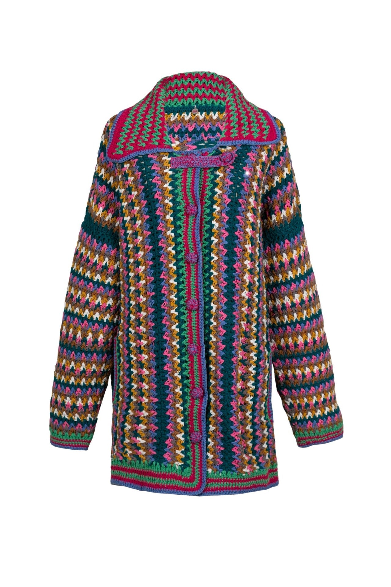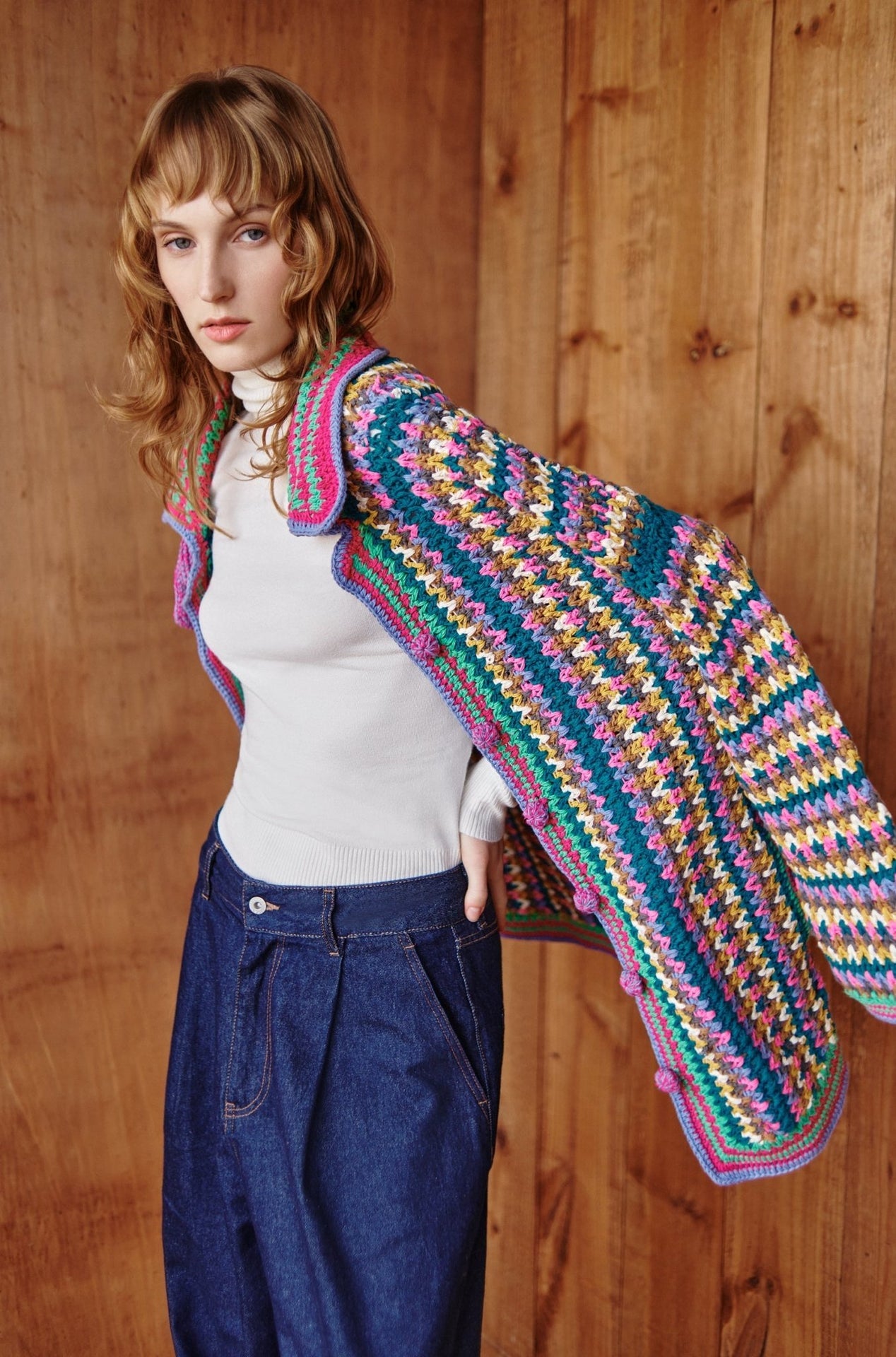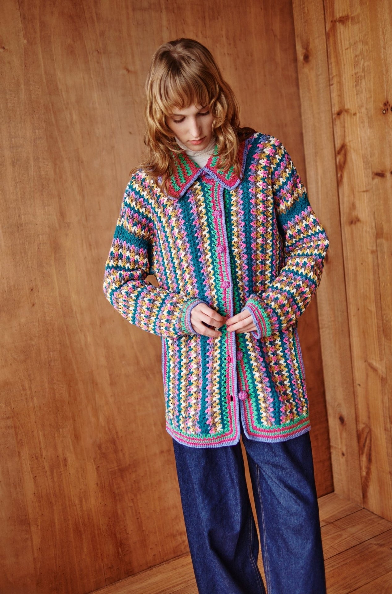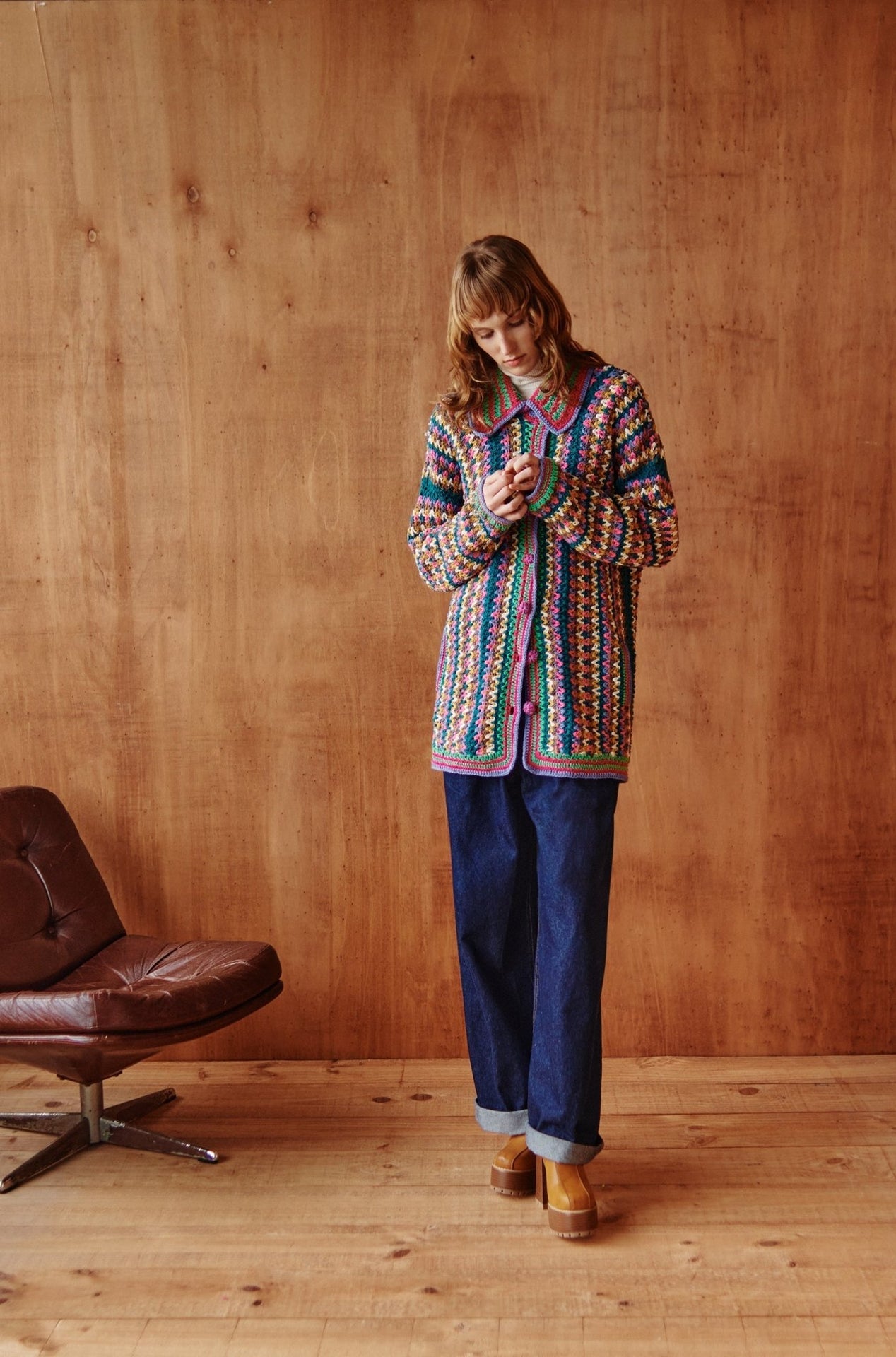 This cozy and vibrant piece showcases a stunning mix of colors woven together in a playful striped pattern. The intricate Saffron Sweater is both eye-catching and nostalgic. With its classic button-up front and oversized collar, this cardigan is perfect for layering over your favorite tees or pairing with denim for a relaxed, boho-inspired look. Whether you're lounging at home or stepping out for a casual day, this cardigan adds a pop of color and texture to any outfit.