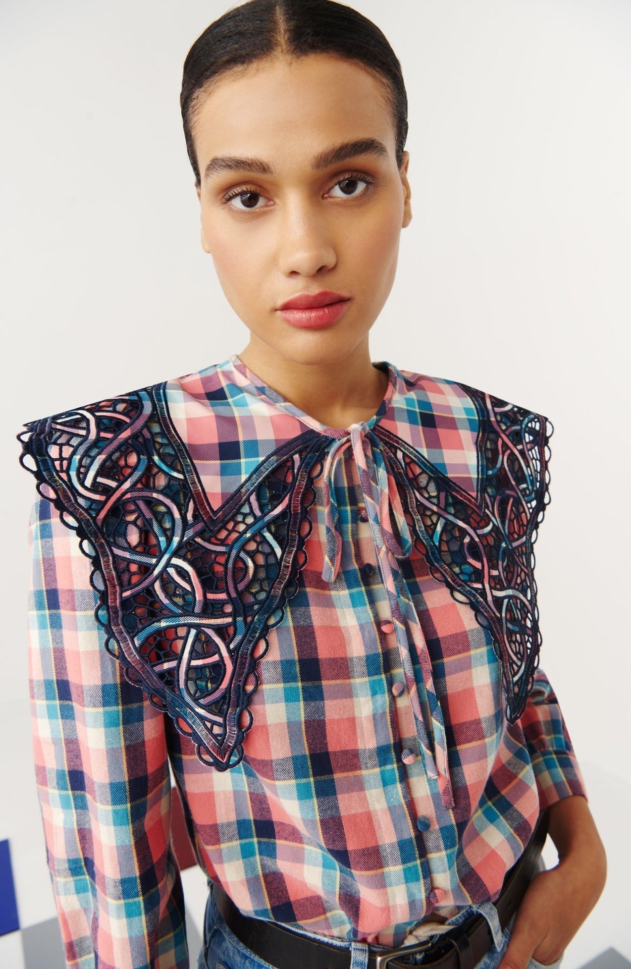 Add a touch of vintage charm to your wardrobe with our Saule blouse. This stylish blouse features a classic plaid pattern in pink, blue, and white, beautifully complemented by an intricately embroidered collar in contrasting navy. The unique design and button-up front create a polished and chic look, perfect to elevate any look.
