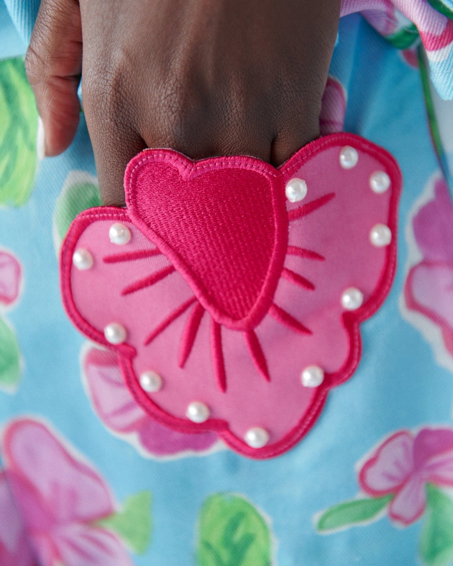 An invisible side zip ensures a perfect fit, while front pockets are elevated with delicate embroidered floral details finished with pearl accents.
