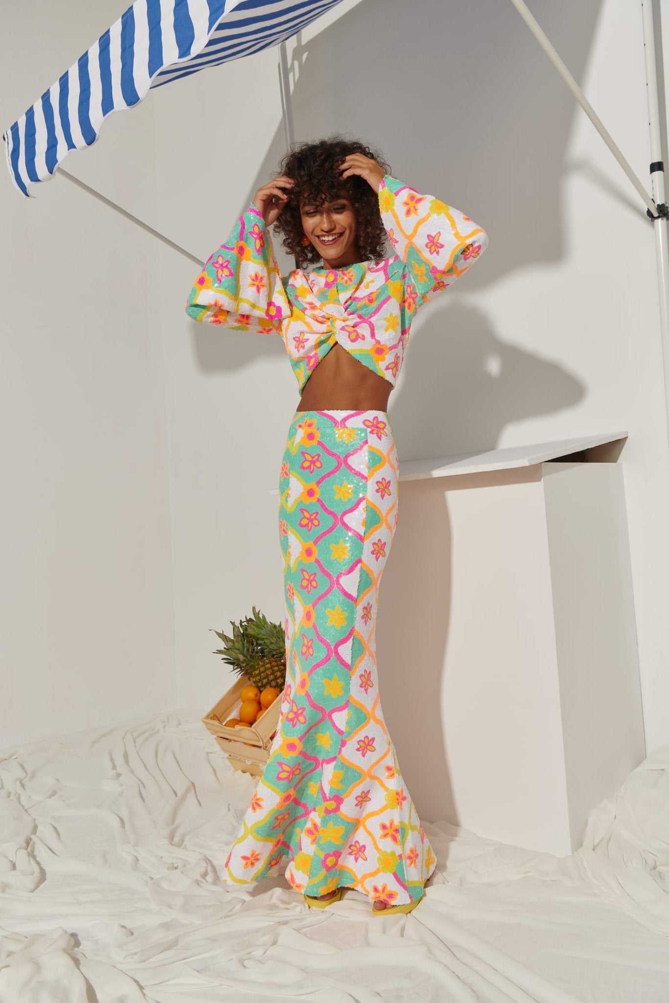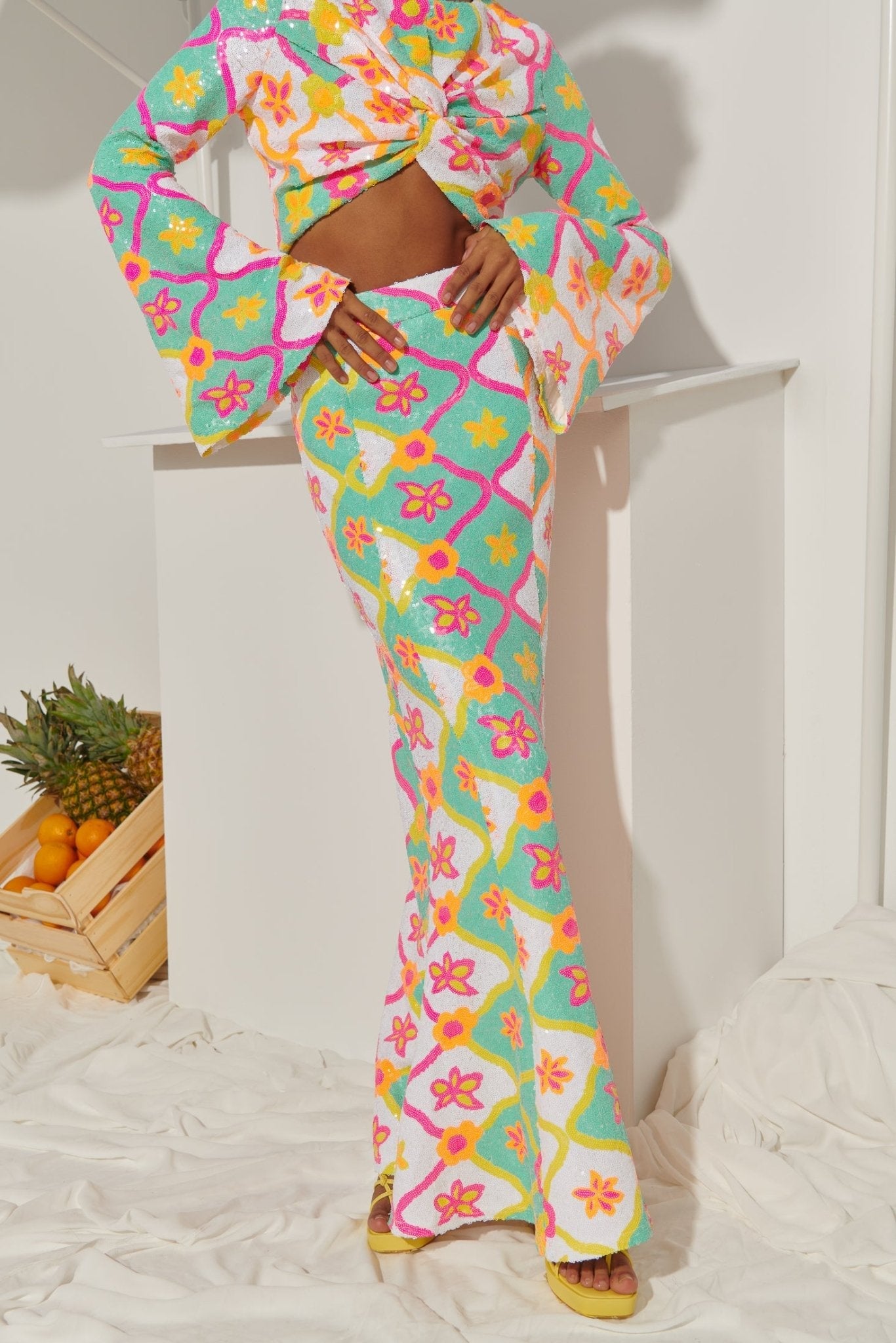 Sculptural yet fluid, the Begoña Skirt hugs the hips and flares gently at the hem for a timeless mermaid silhouette. The multicolour floral sequin pattern adds texture and shine to every step.