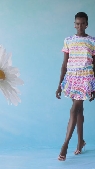 A mini skirt crafted in a lightweight cotton for movement. Layered ruffles finished with zig-zag trims create volume and a playful silhouette.