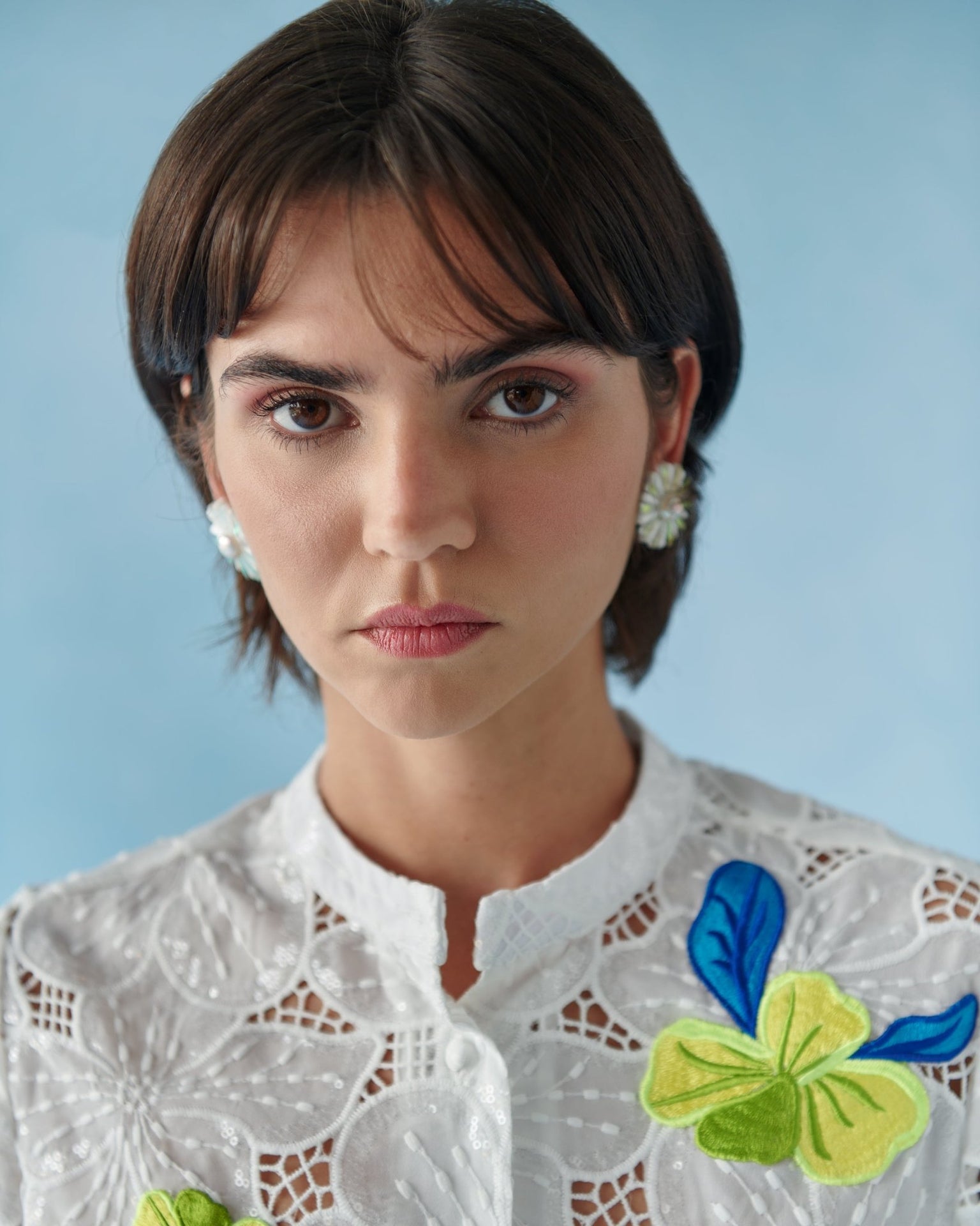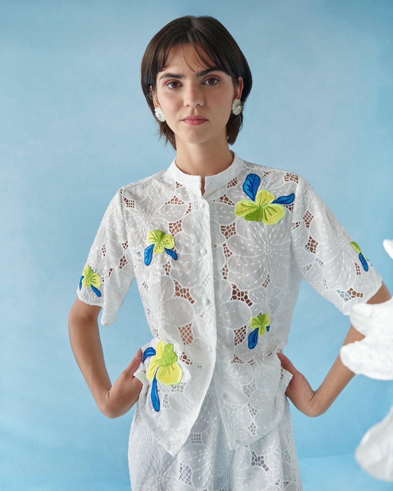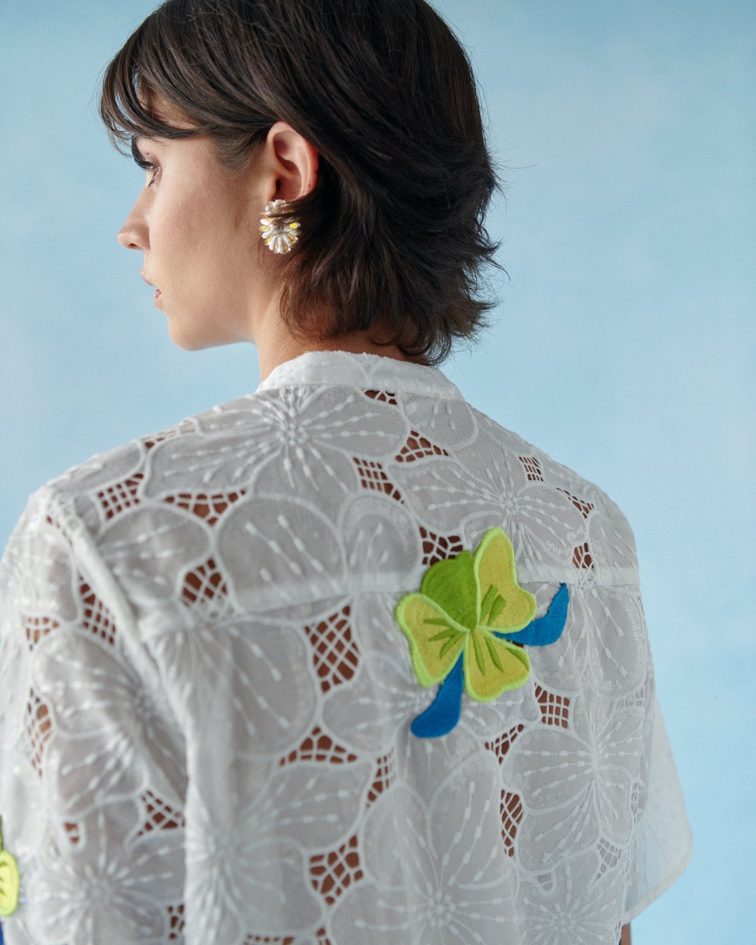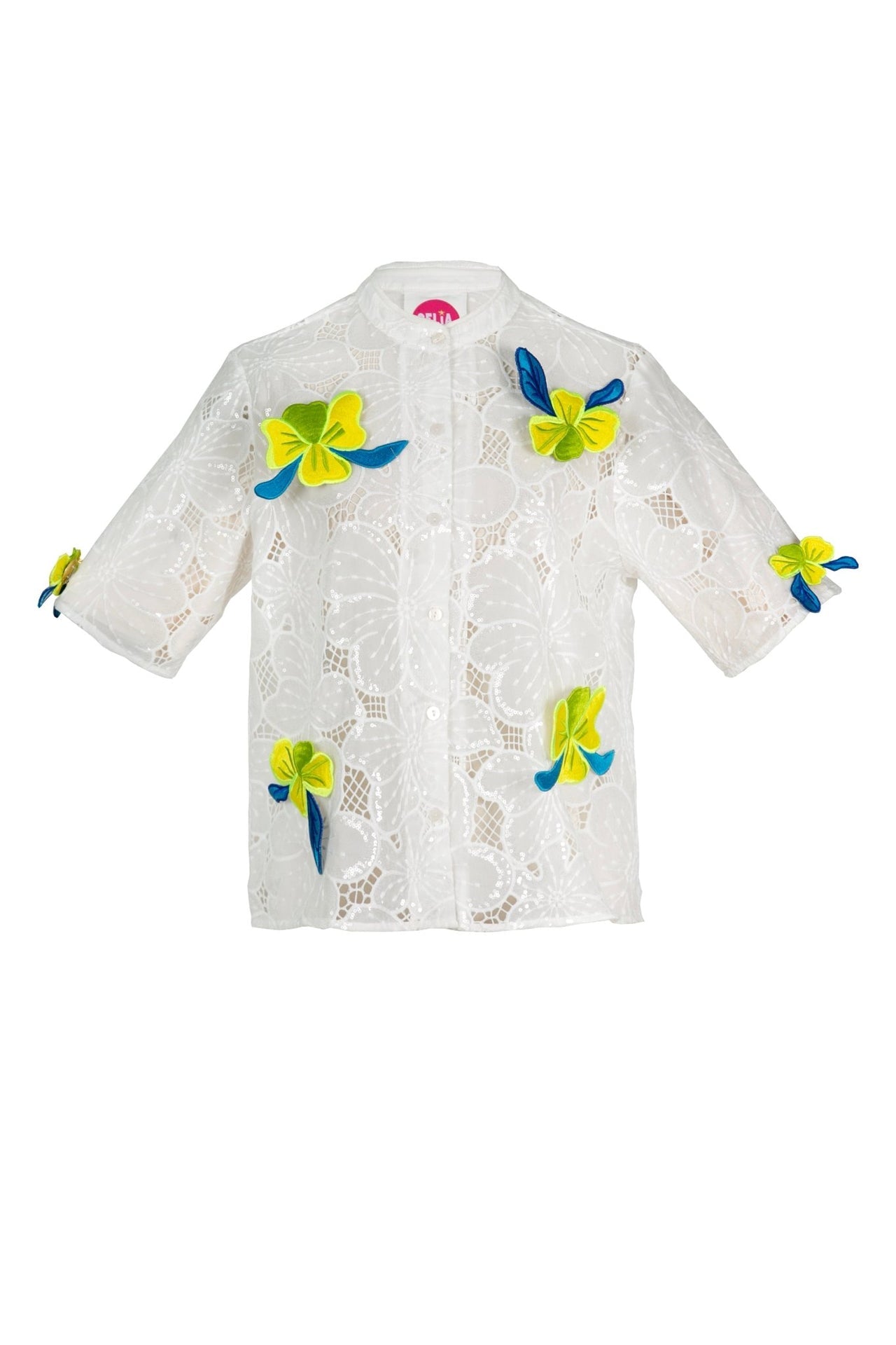 Crafted in floral lace enriched with sequins, the fabric catches the light beautifully. Yellow floral brooch details with blue accents add a playful and elegant touch.