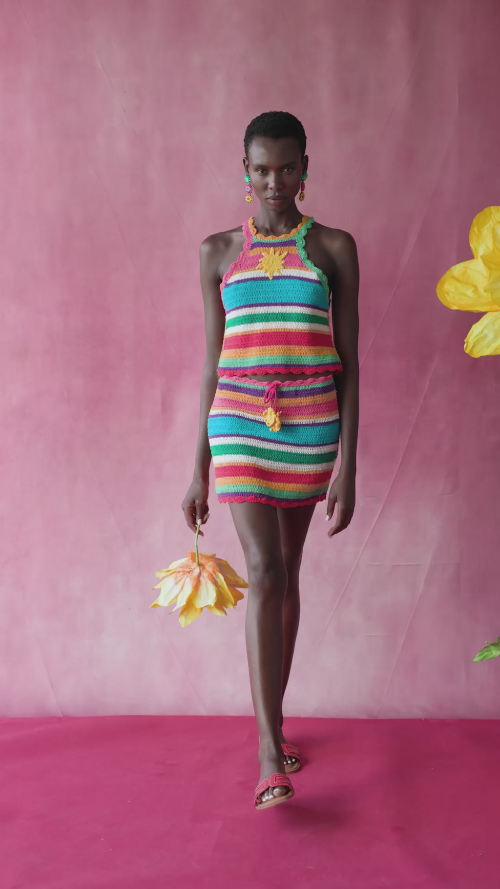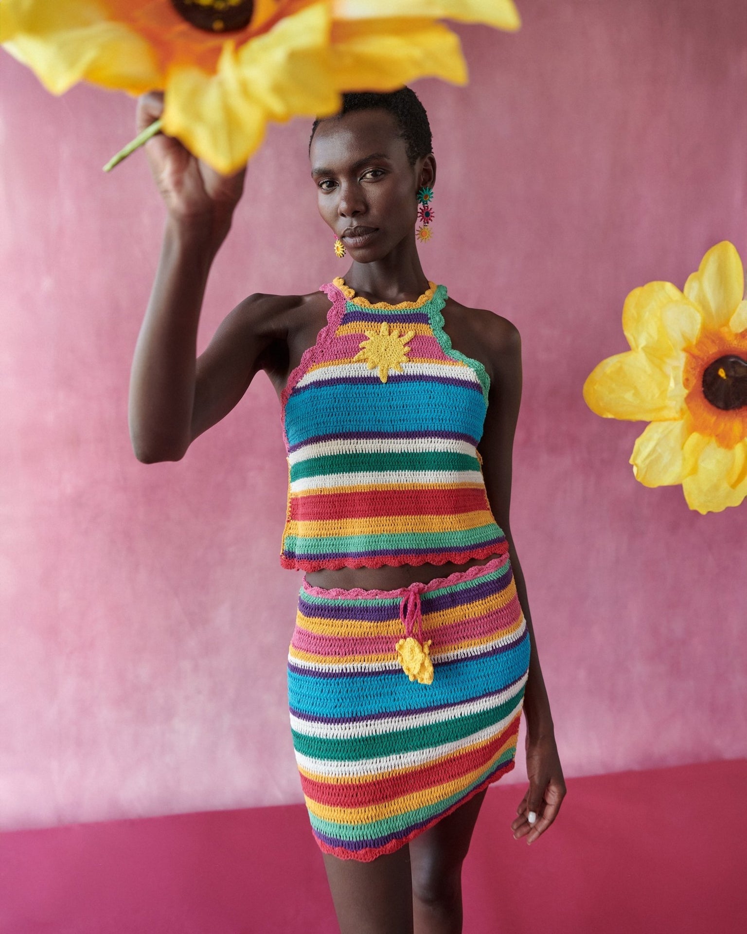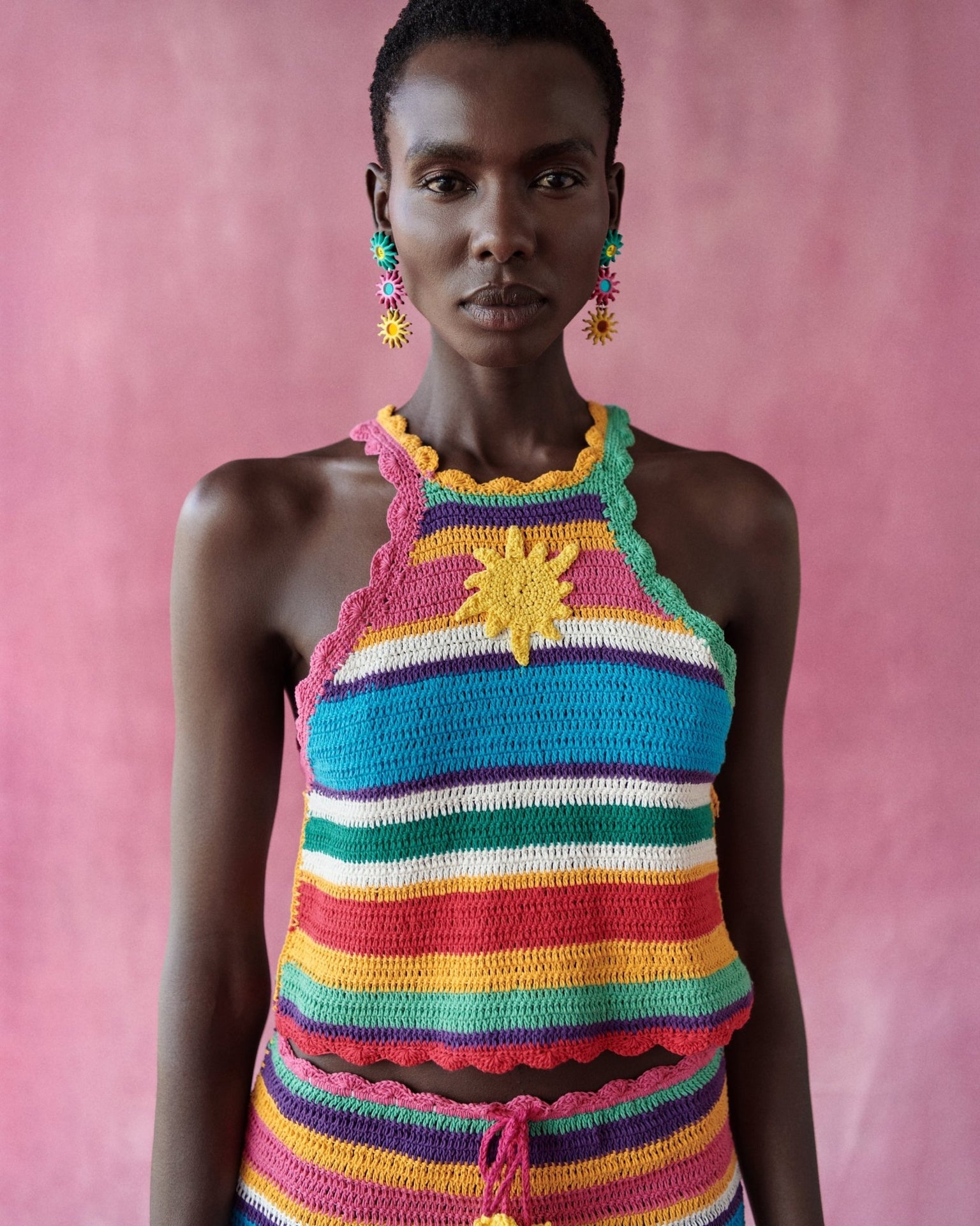A crochet top with a structured halter neck that sculpts the upper silhouette with a modern touch.