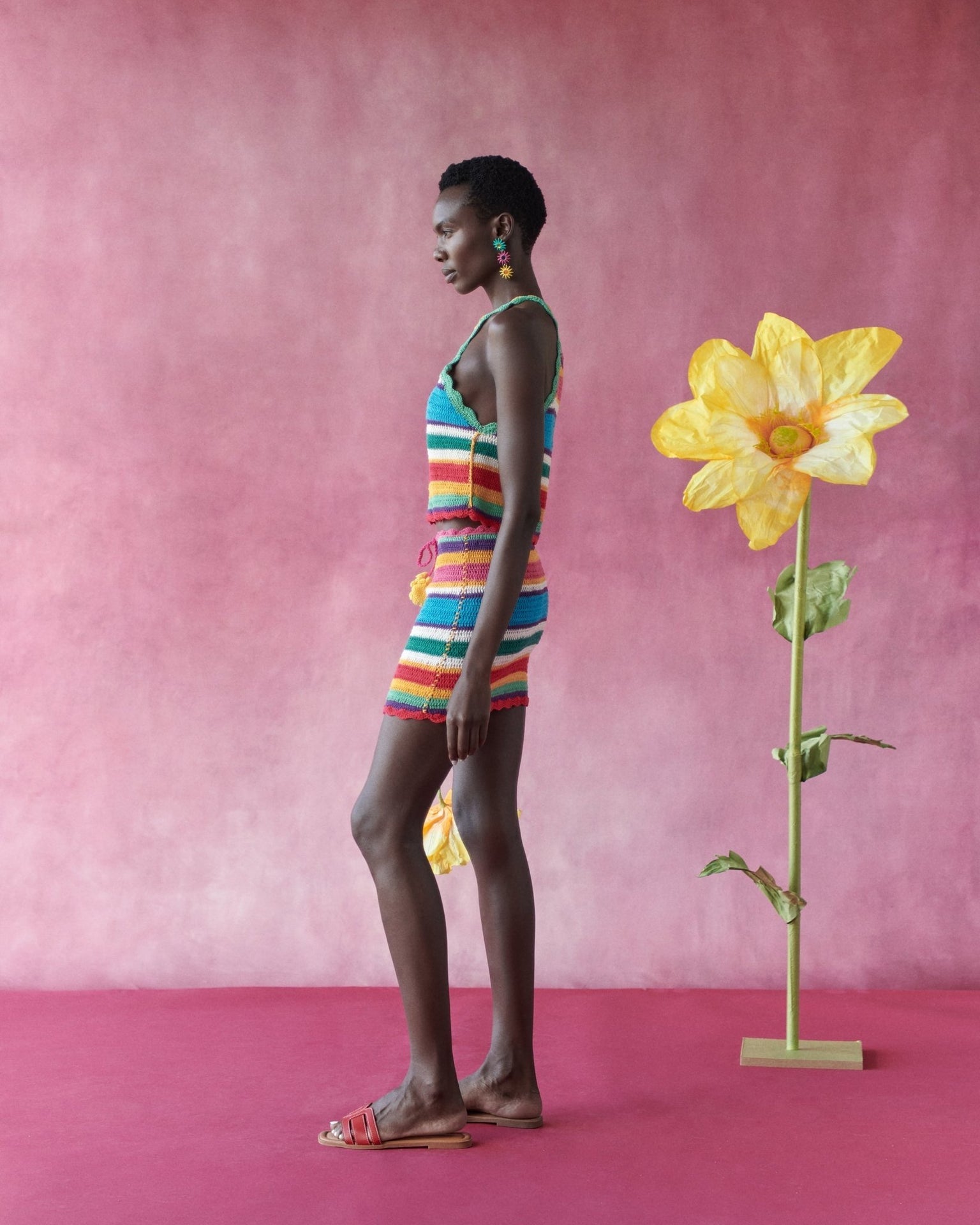 The colorful striped design adds energy, while the fitted shape keeps the look balanced and flattering.