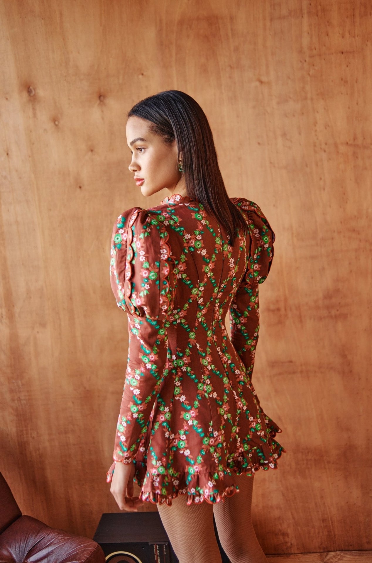 This lovely dress features a delicate floral print in soft hues creating a timeless and elegant look. The puff sleeves add a hint of drama and romance, while the fitted waist, belt and flared hem create a flattering silhouette. In earthy tones, its perfect for both day to night, this dress pairs beautifully with your favorite heels or boots.