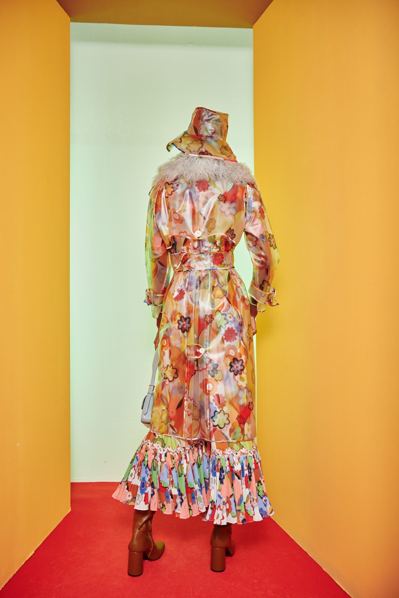 Rain hat with a transparent floral print. Pair it with a linen trench coat for a coordinated look, or wear it on its own for the perfect fun pop of color.
