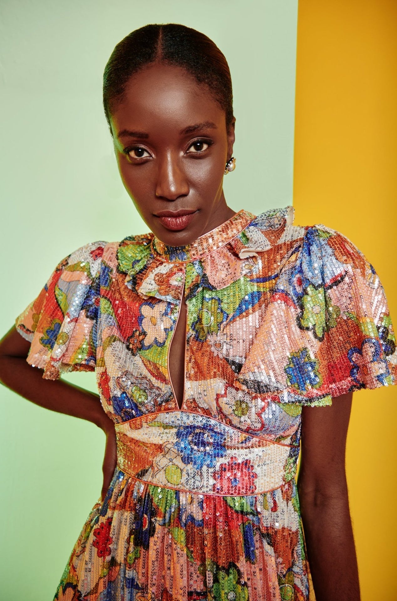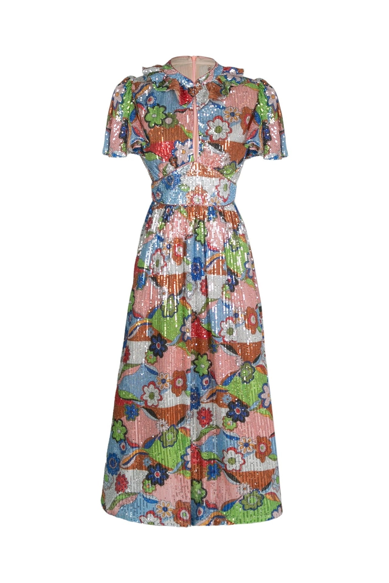 Long sequin dress with short sleeves. Featuring a high buttoned neckline and a small keyhole opening at the chest, it can be worn fully buttoned or open to create a deep V-neckline. The built-in belt cinches the waist, allowing the skirt to flow freely and comfortably. The detailed neckline and loose sleeves, combined with its stunning floral print in shades of pink, blue, and green, will make you shine at any event.