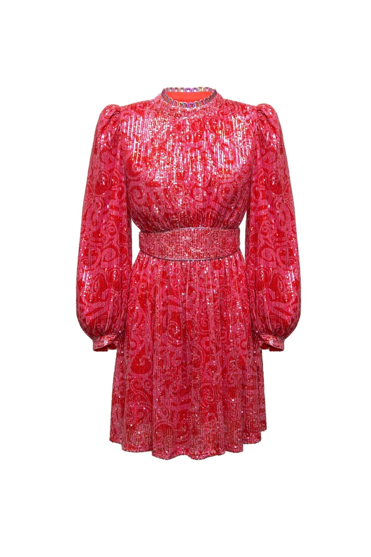 Cherry-colored dress with shoulder pads and sequins, perfect for a night out!