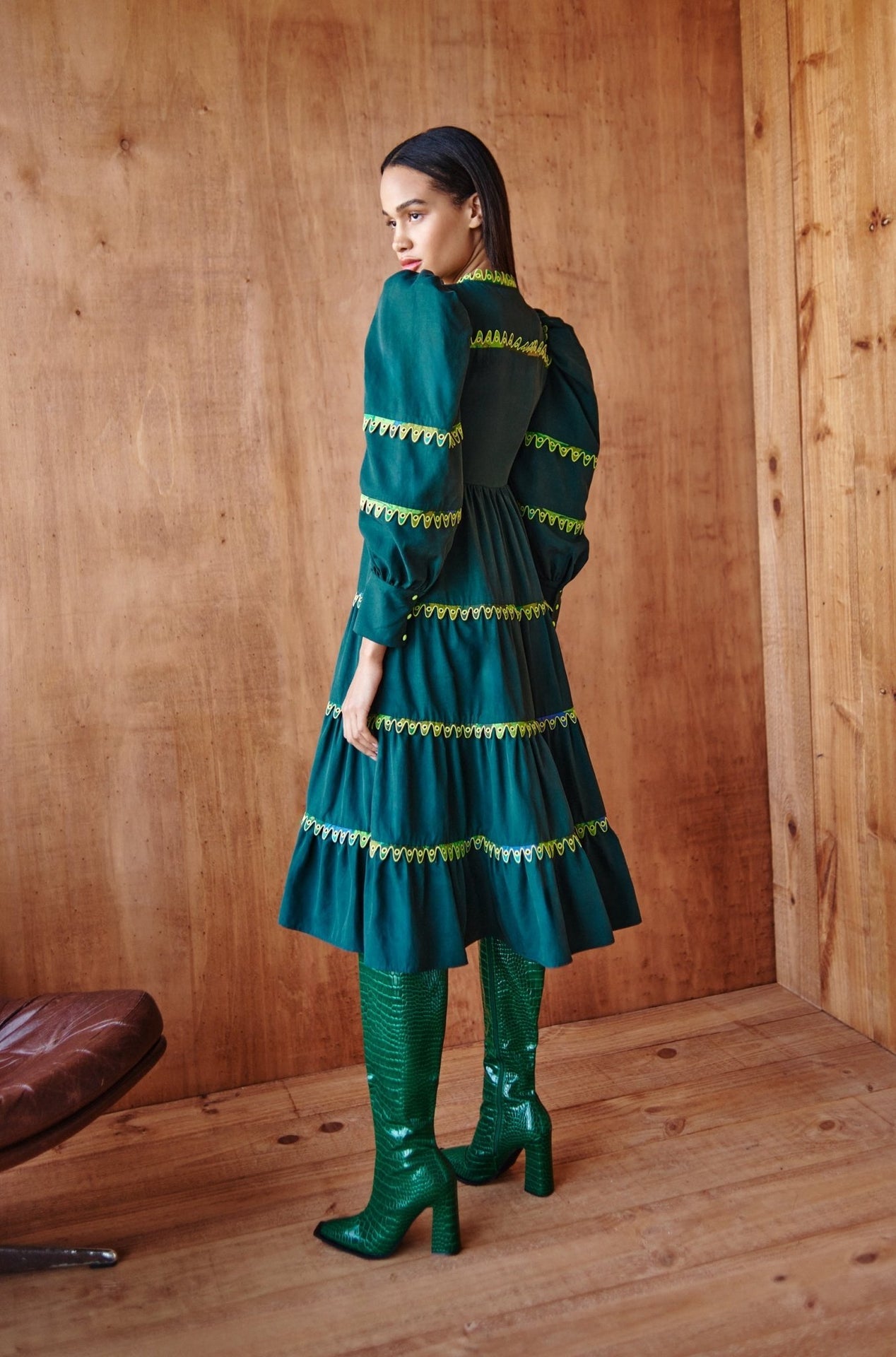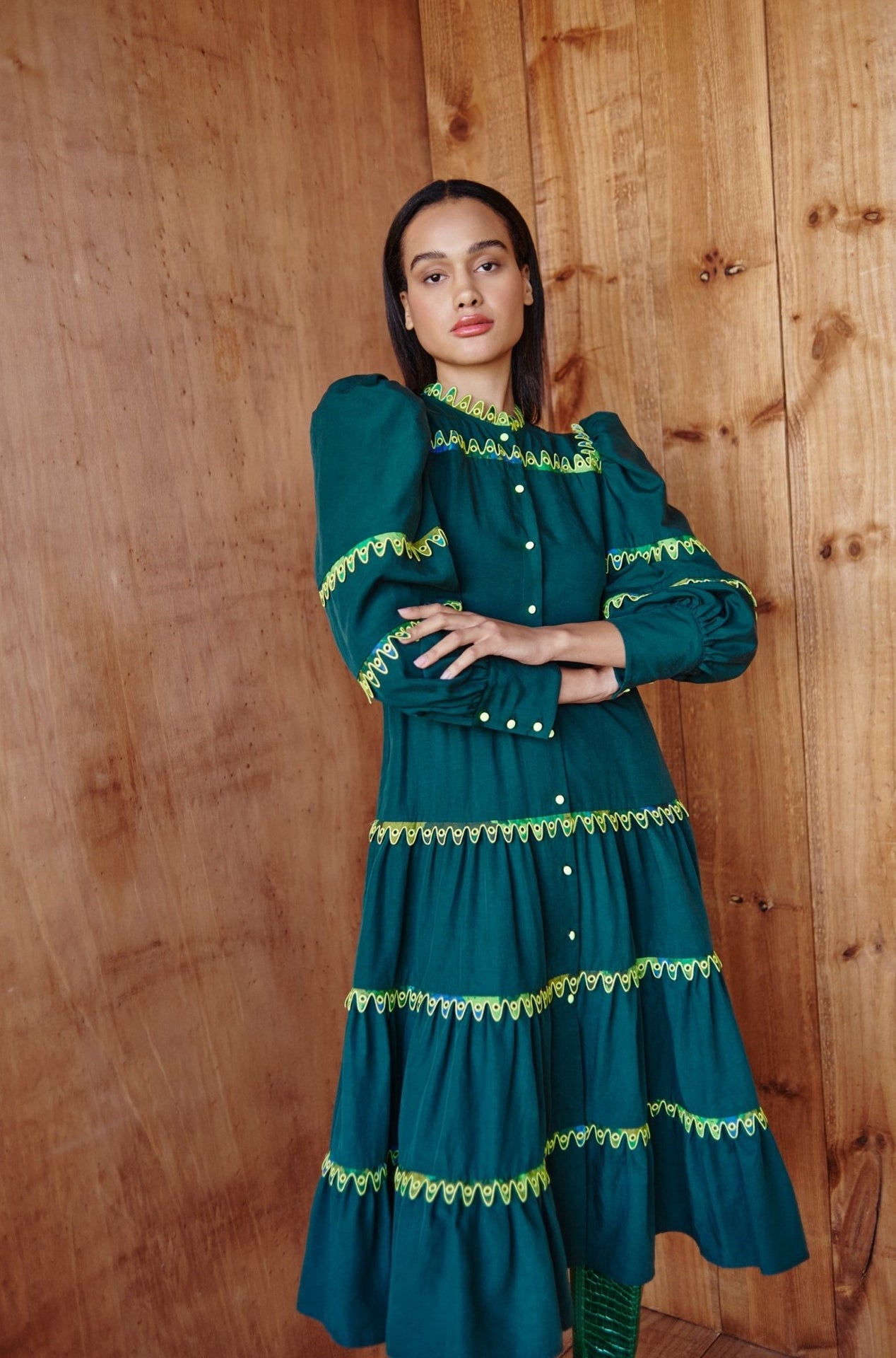 A CB classic silhouette, the Hasu Dress in Green is a stunning pick. With a yellow trim that adds a touch of brightness, the puff sleeves and tiered skirt create a graceful and flowing silhouette, while the button-down front and high neckline offer a sophisticated touch.