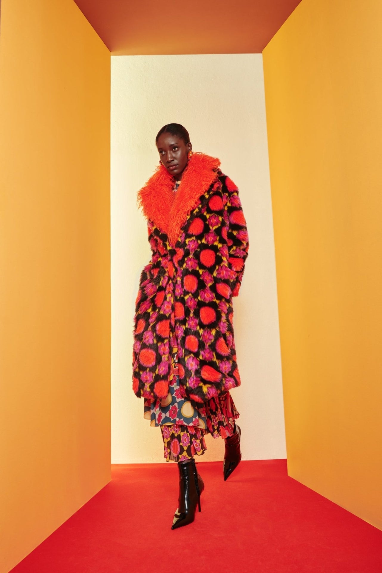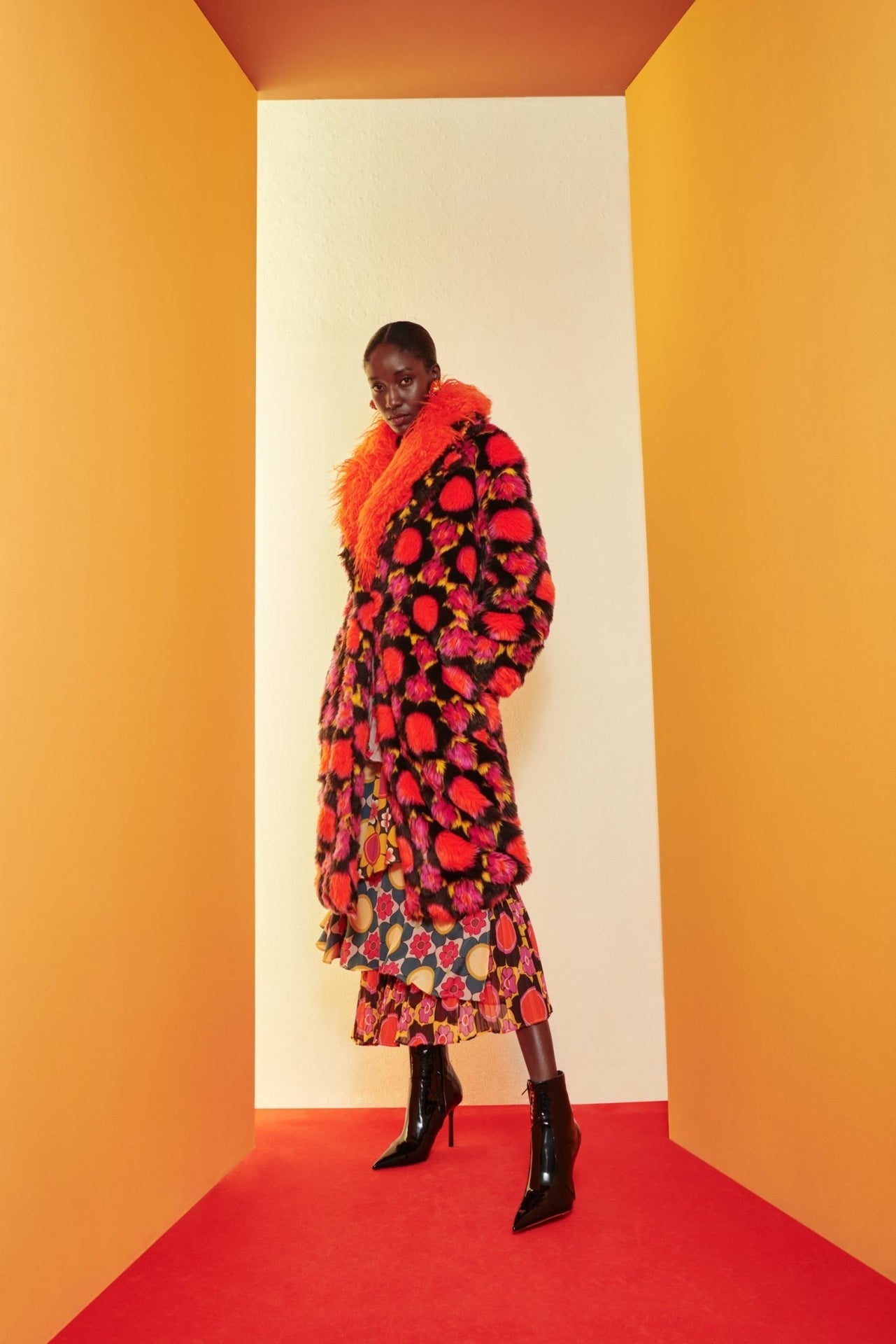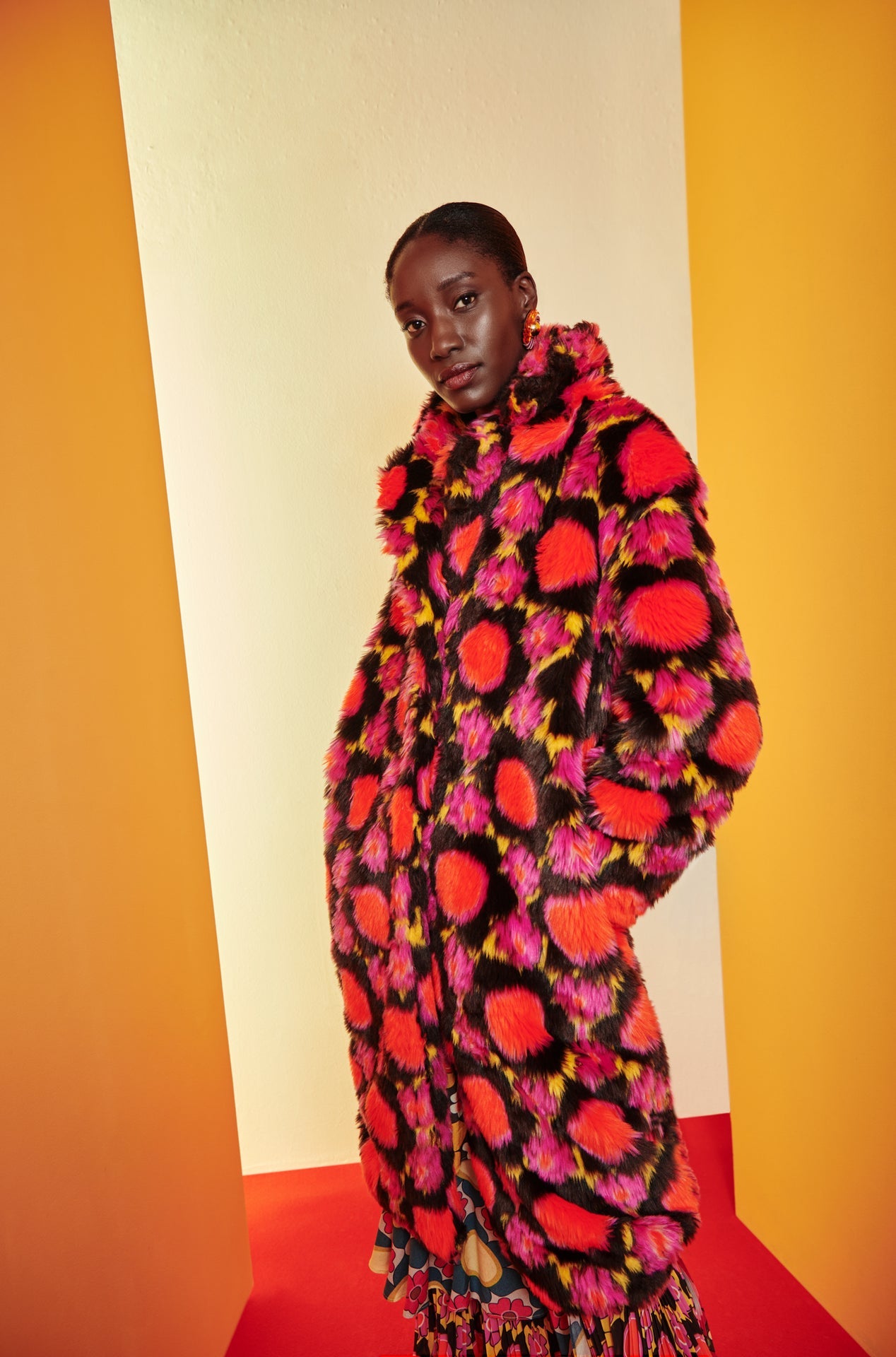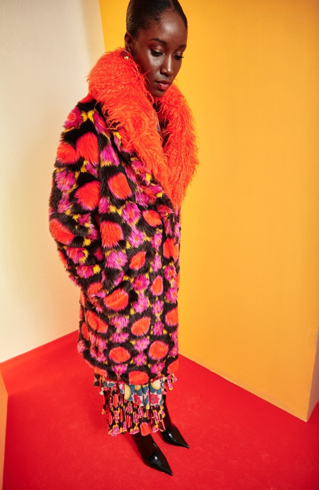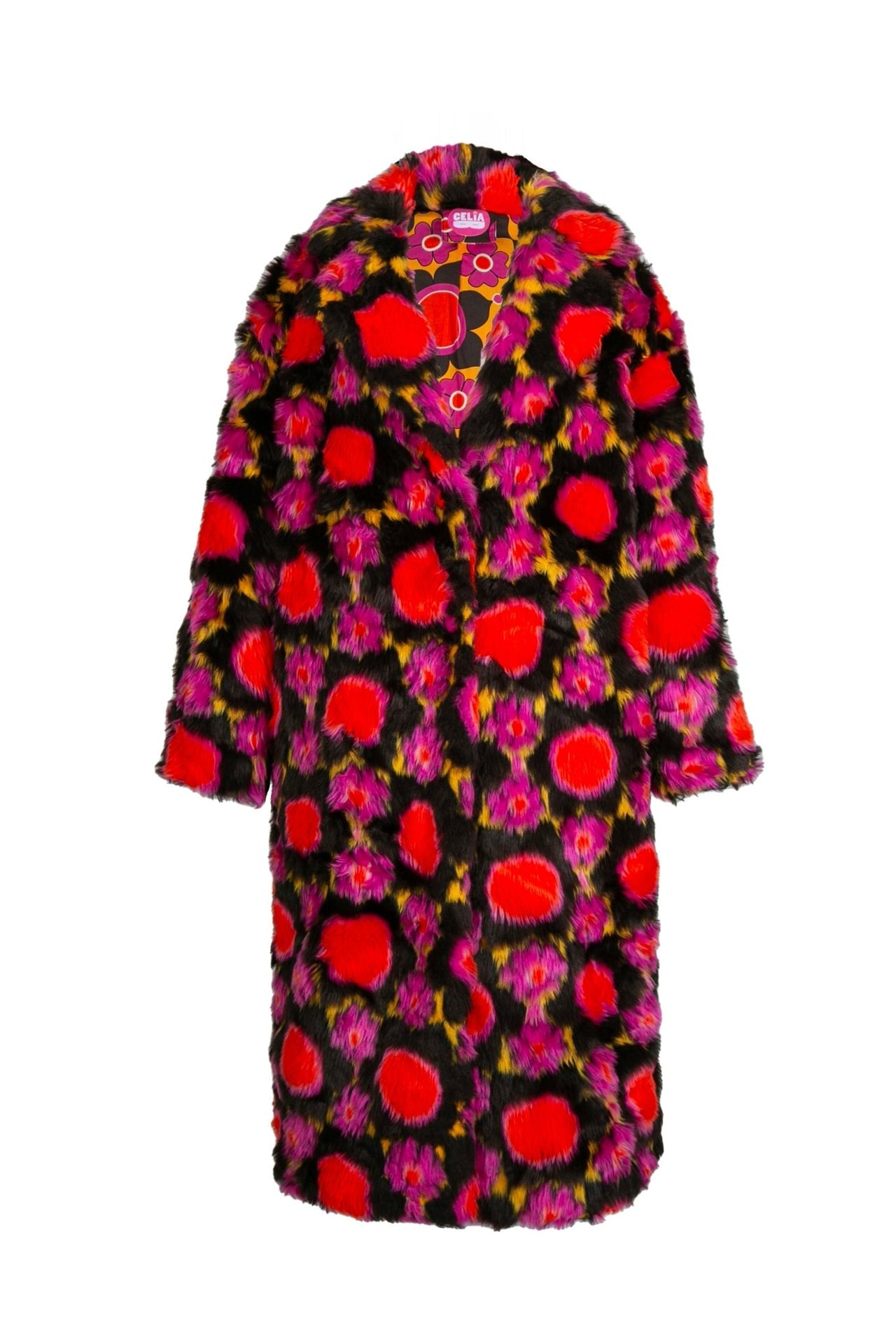 Este abrigo largo de piel sintética cuenta con bolsillos laterales y botones a presión. El estampado floral, un clásico de la casa, se reinventa con un toque otoñal en tonos más oscuros como el negro, el rojo, el rosa y el amarillo. El cuello en V lo convierte en una prenda básica de invierno con el inconfundible estilo de Celia B.