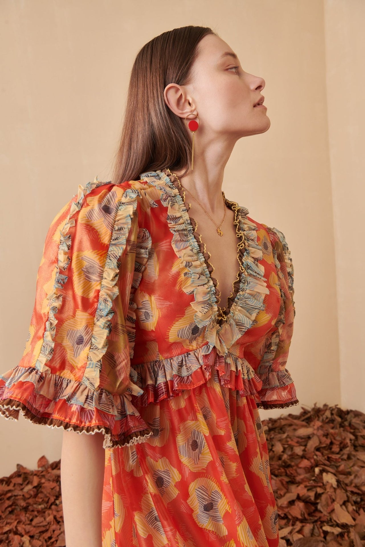 The Aura Dress is a celebration of bold femininity. Featuring a sunset-orange floral print, this maxi-length silhouette charms with a deep V-neckline framed by layered ruffles, flutter sleeves, and a tiered skirt for maximum movement. Ideal for destination weddings, resort dinners, or festive gatherings.