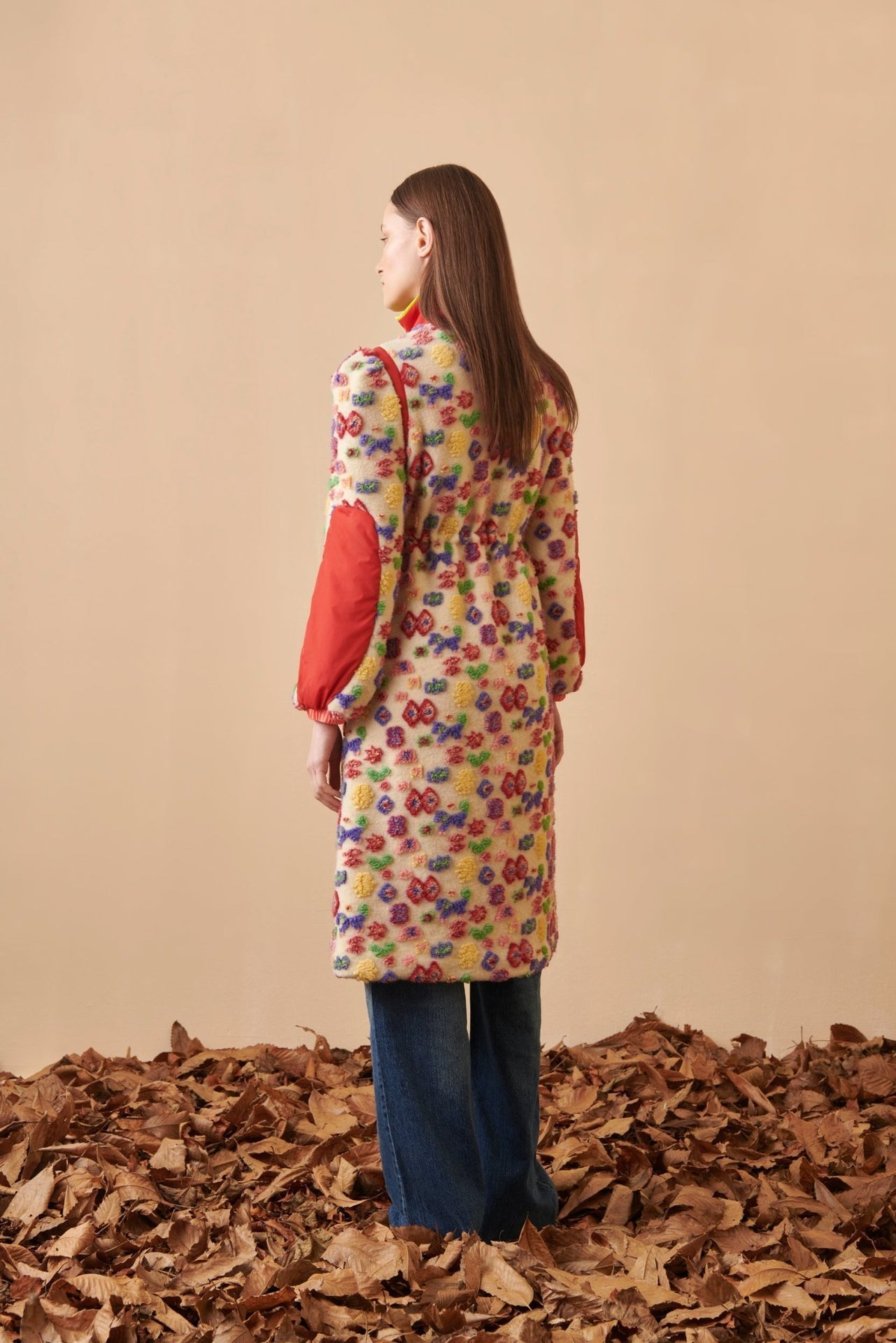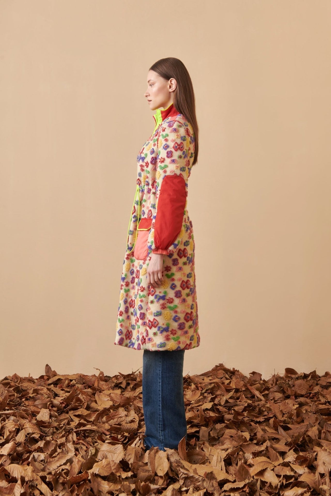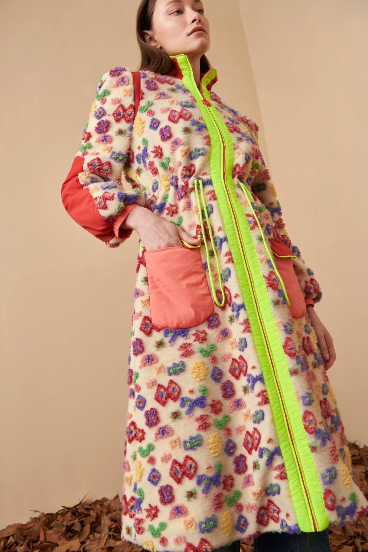 The Devaneio Coat fuses playful print with modern sporty detailing. Cut in a mid-length silhouette, it features an all-over multicolor folk-inspired pattern on a cream base, accented with vivid neon green piping and a matching zip front. Contrasting coral patch pockets with yellow edging add a functional pop, while red panels on the sleeves bring bold dimension. Designed with a drawstring waist for shape, this coat is perfect for transitional layering and statement winter looks.