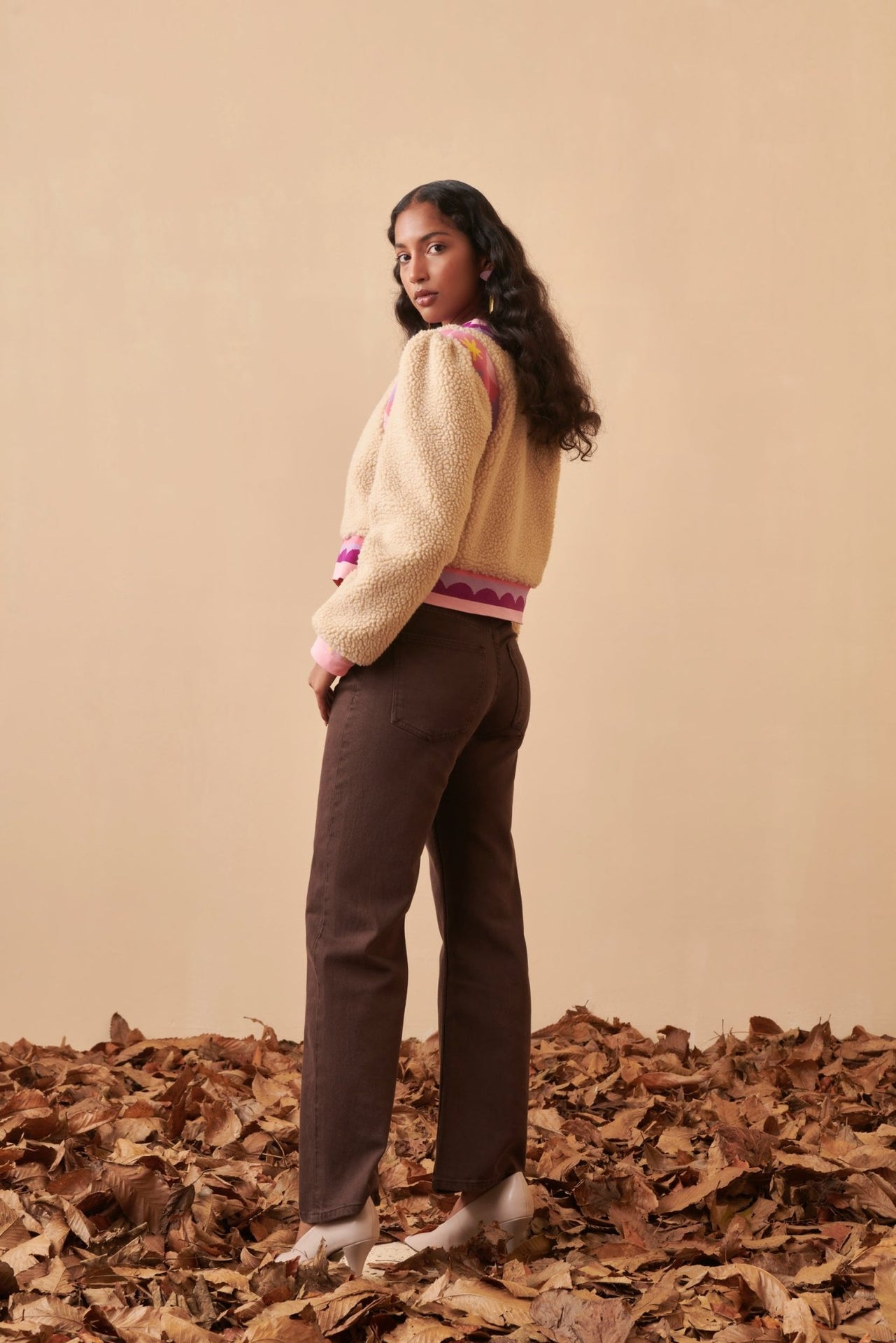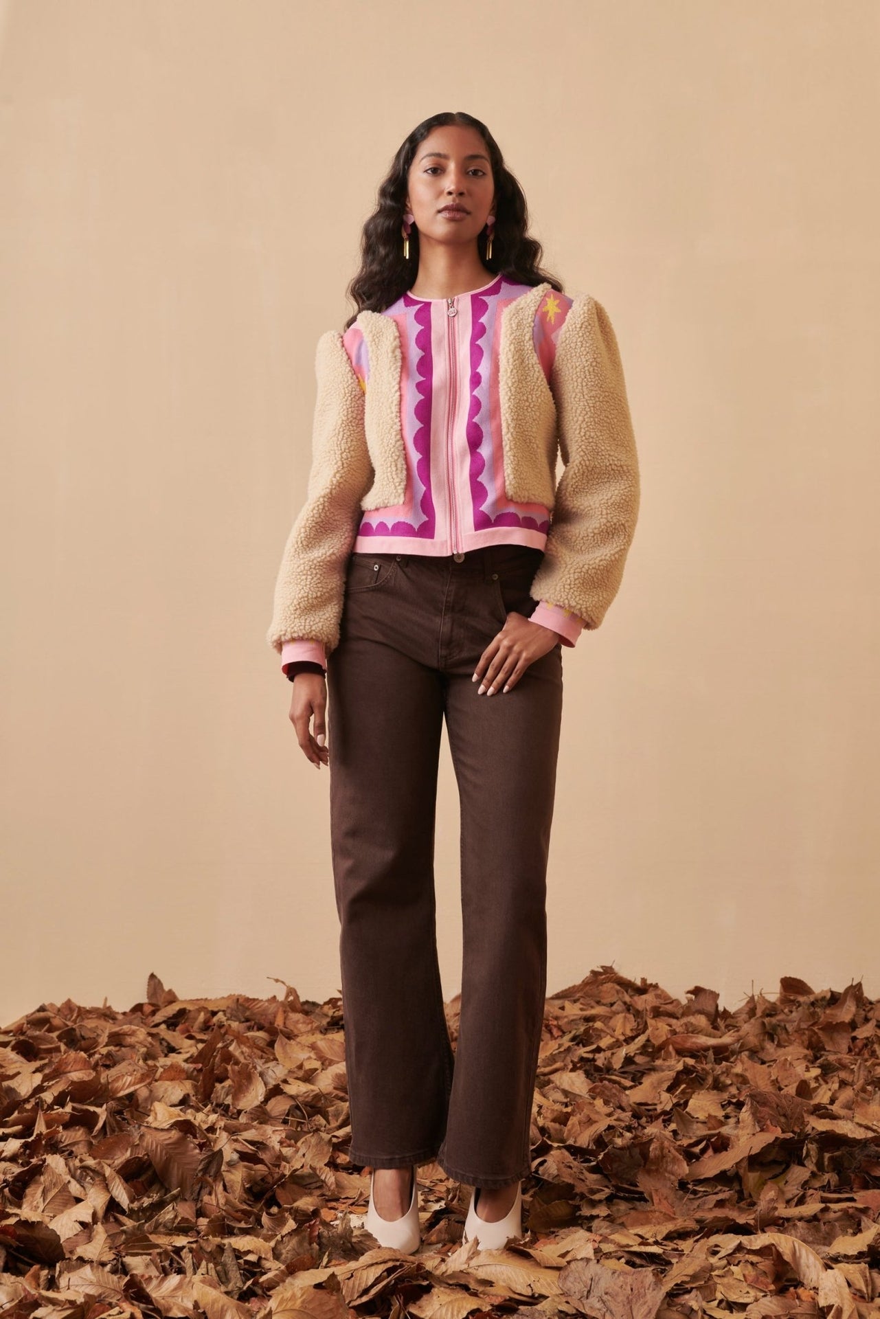 The Corazón Jacket blends cozy warmth with bold, artistic flair. Crafted from plush teddy fabric in a cropped bomber silhouette, it features vibrant pink and purple scalloped panels and a central zip closure. Playful yet sophisticated, this jacket adds a statement layer to any outfit while keeping you comfortably warm.