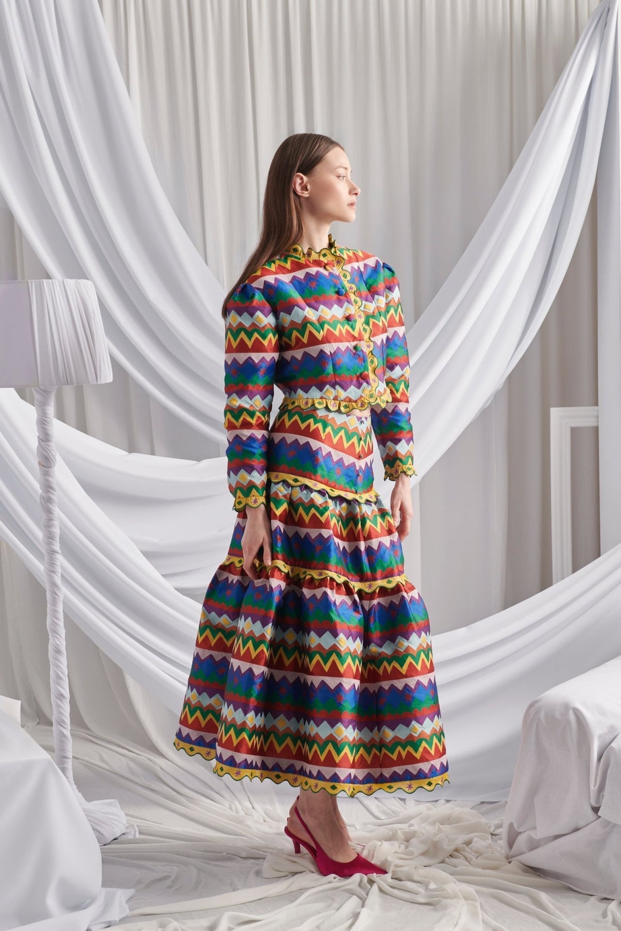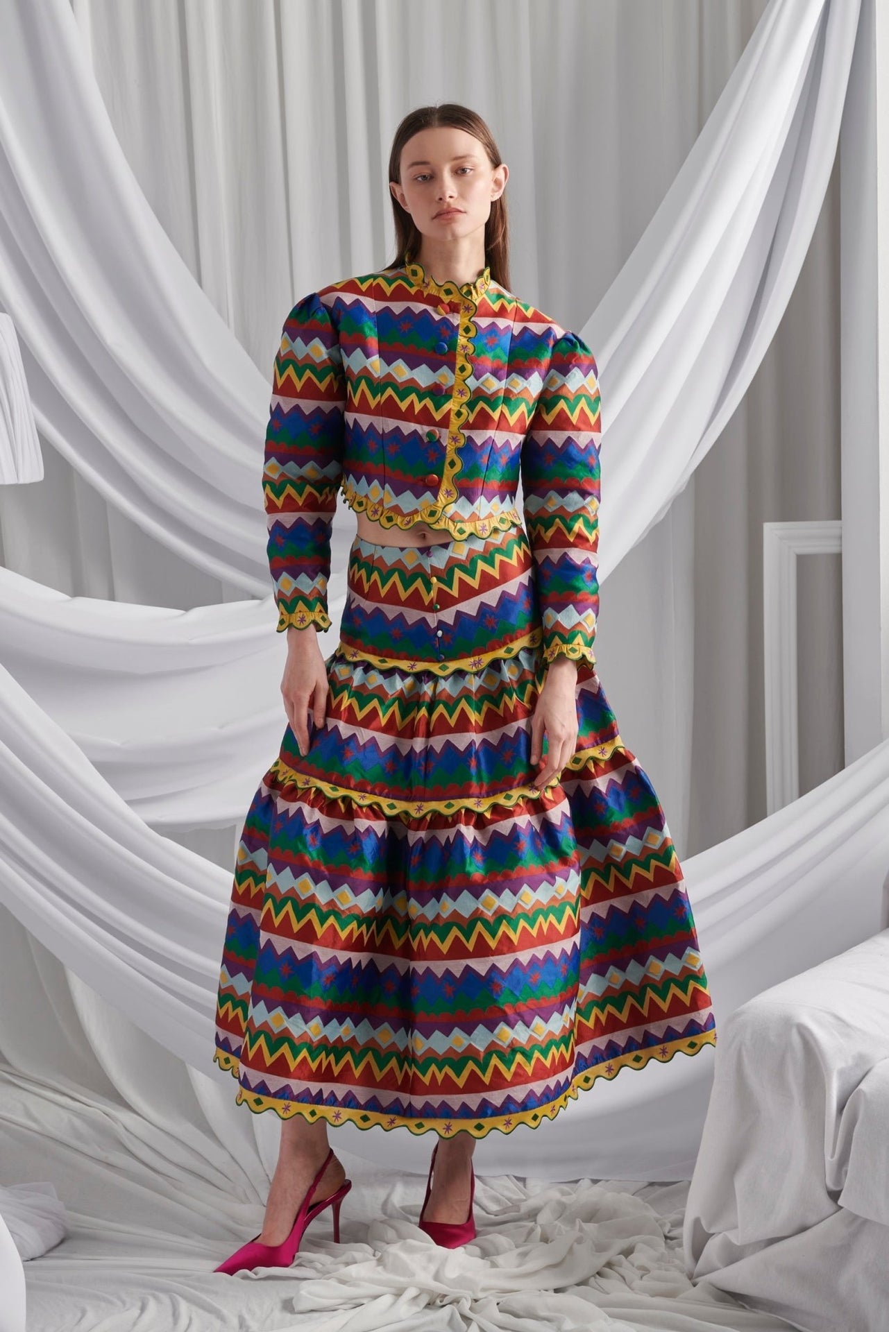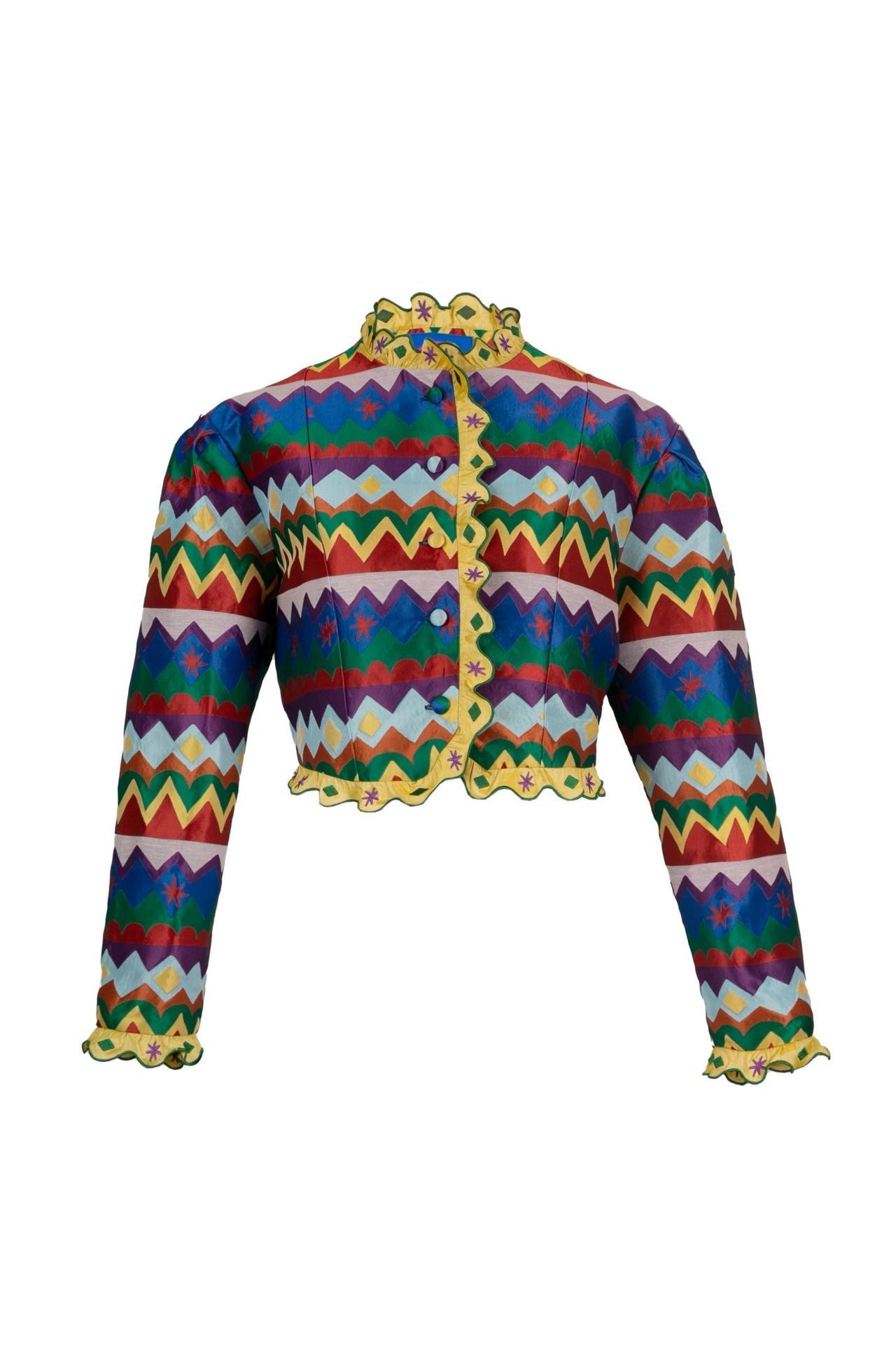 The Devotion Jacket features a structured silhouette in bold zigzag stripes of jewel-toned hues. Detailed with scalloped yellow trims and a button-down front, it combines tailored elegance with playful energy.