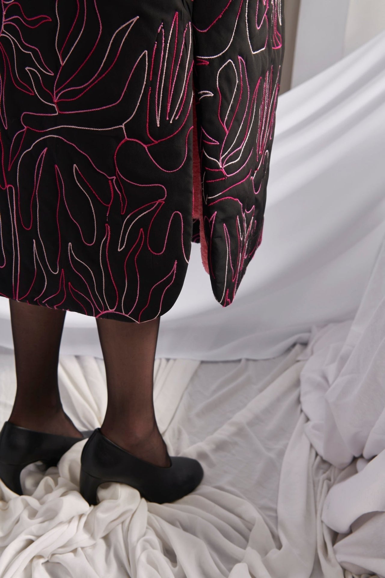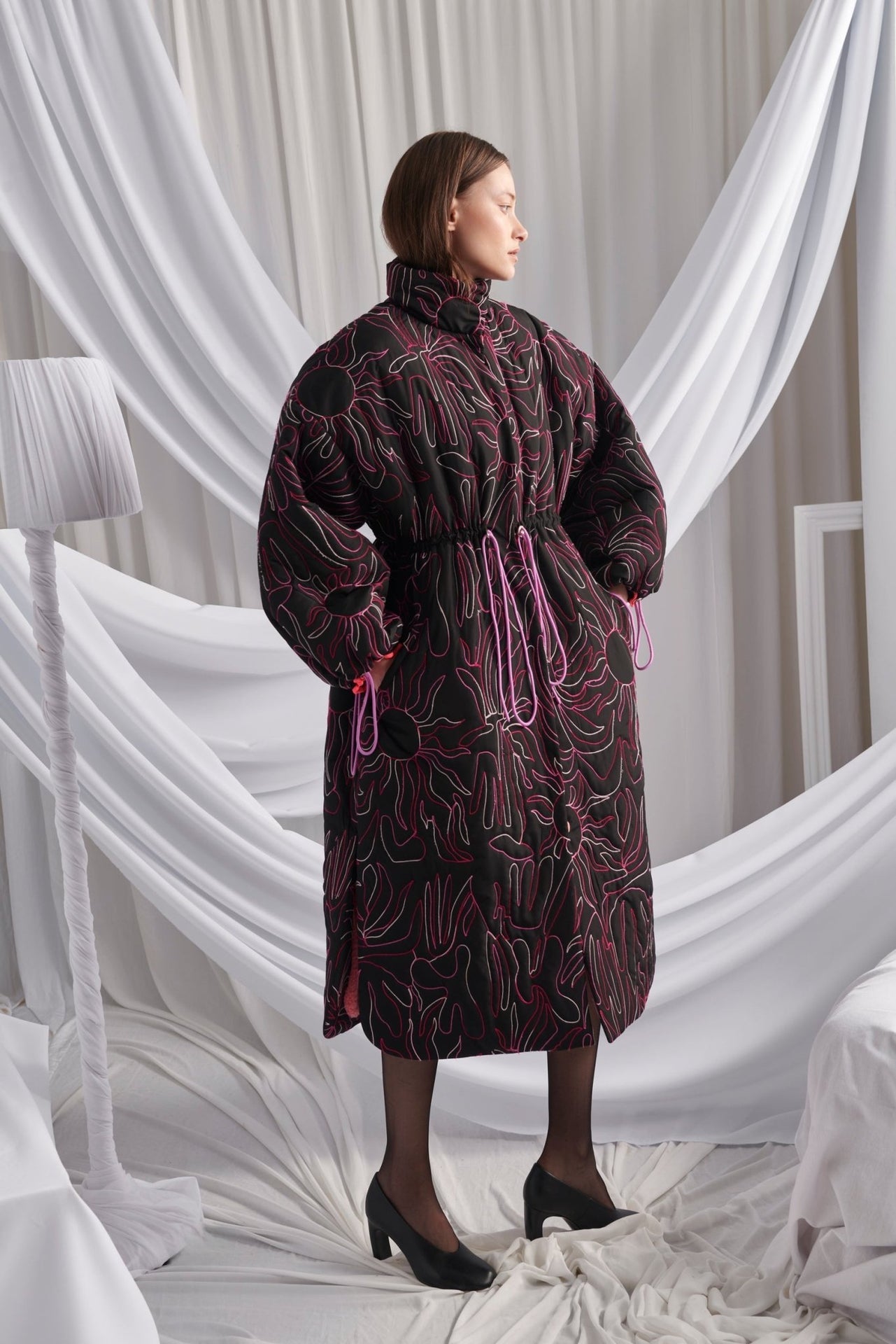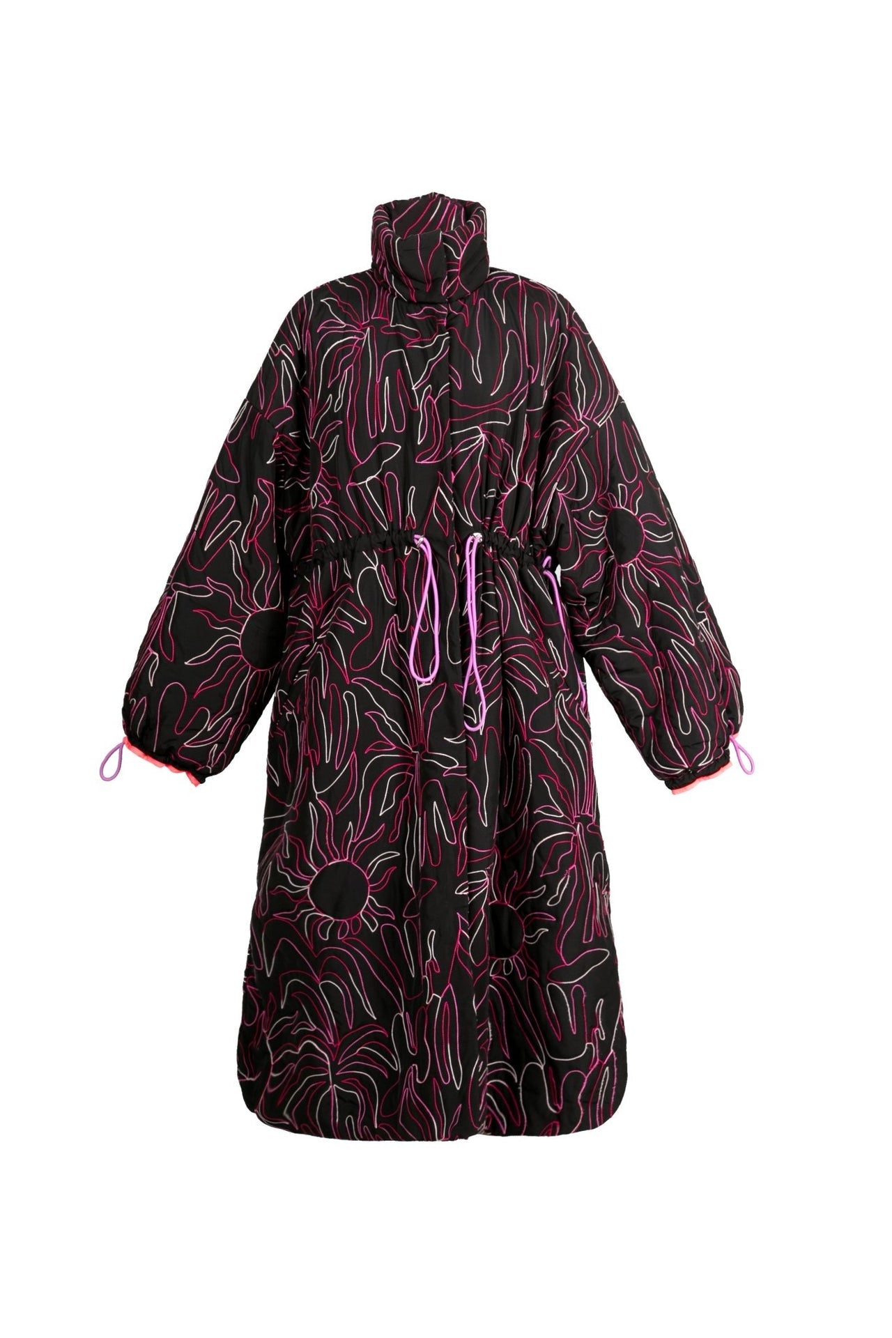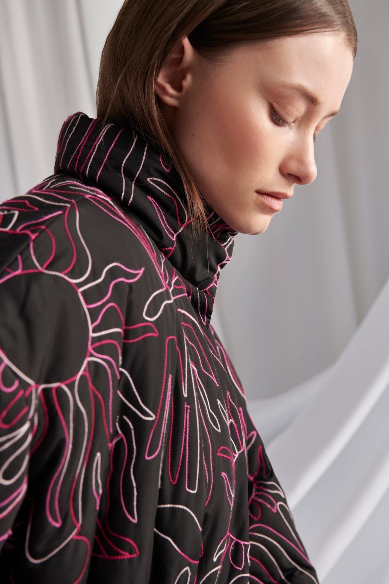 The Sarang Coat offers warmth and volume with its quilted design in black and pink embroidered fabric. Featuring adjustable drawstrings at the waist and sleeves, it allows for a cinched or relaxed fit. A practical yet stylish coat for the colder months. Closure by frontal snaps, side pockets and elastic waist tightening.
