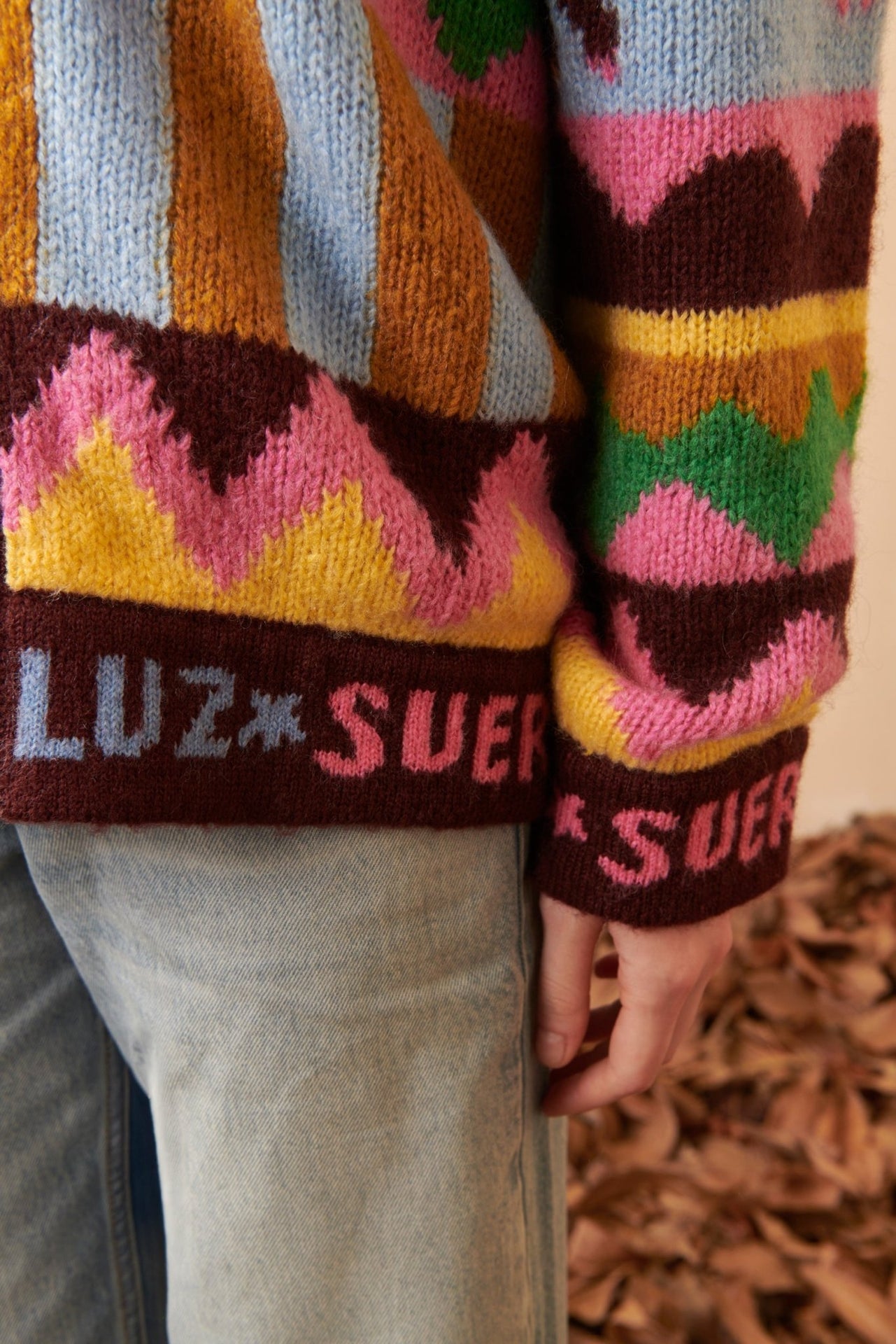 The Scintilla Jacket bursts with color and optimism, crafted in a soft knit with an all-over graphic pattern featuring stylized horses, zigzag stripes, and bold text bands reading “LUZ,” “SUERTE,” and “ALEGRÍA.” This relaxed zip-up jacket blends cozy comfort with a statement-making design, perfect for brightening winter days. Layer over denim, tailored trousers, or skirts for playful, eclectic styling.
