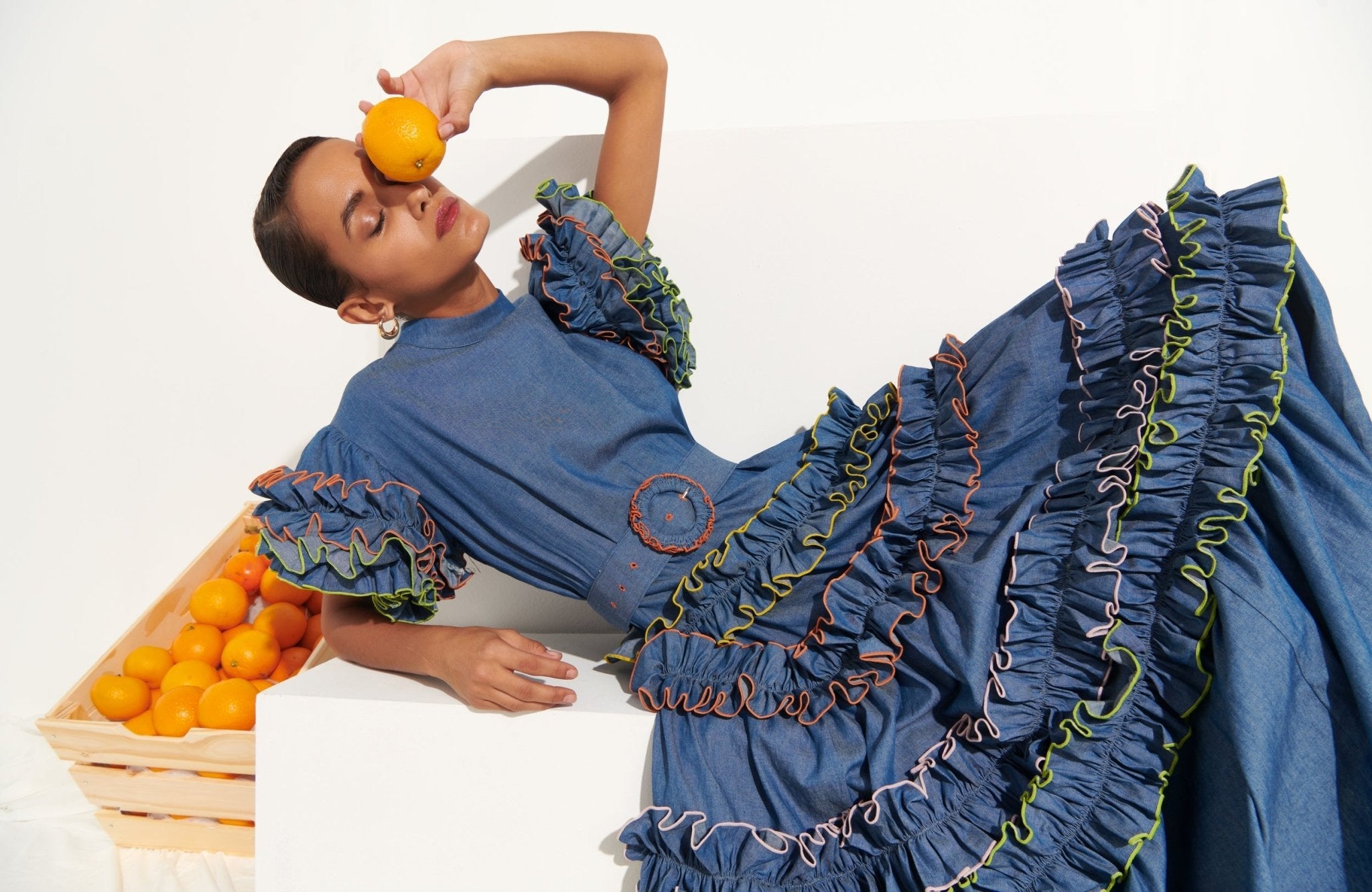 Denim con un toque de alta costura. El vestido Aitana es una pieza espectacular de largo completo con mangas abullonadas estructuradas, cintura ceñida y volantes en cascada con alegres toques de color en tonos naranja, amarillo y verde. Confeccionado en un rico índigo, es a la vez sencillo y dramático, diseñado para destacar en cualquier ocasión.
