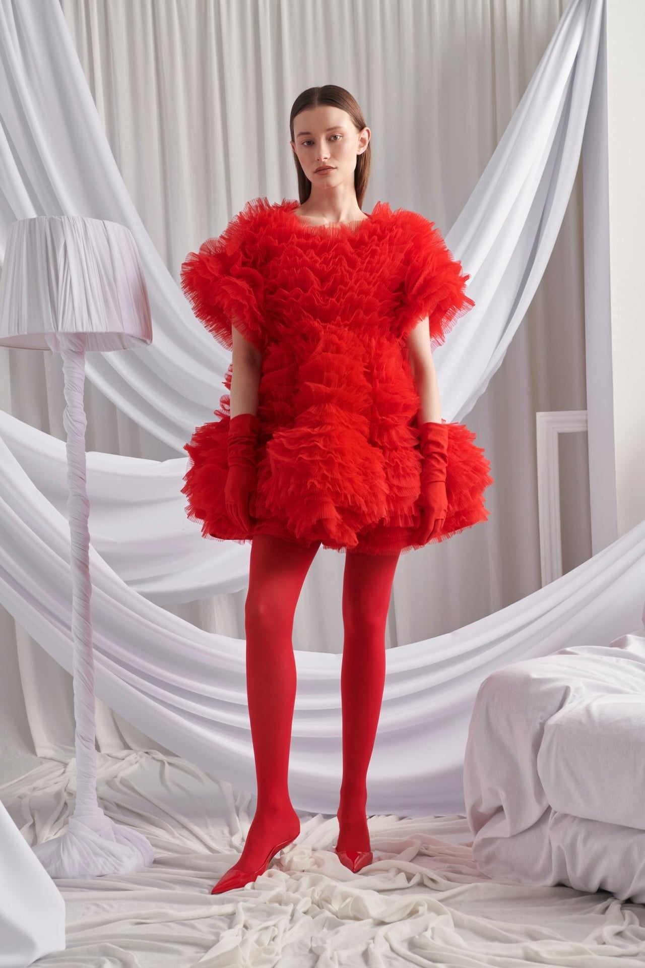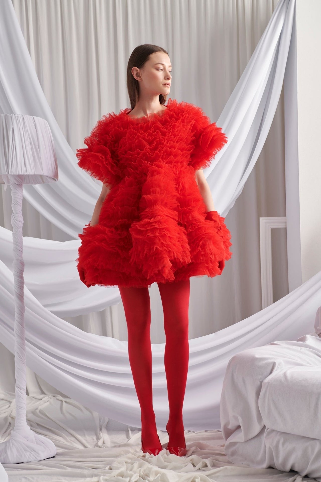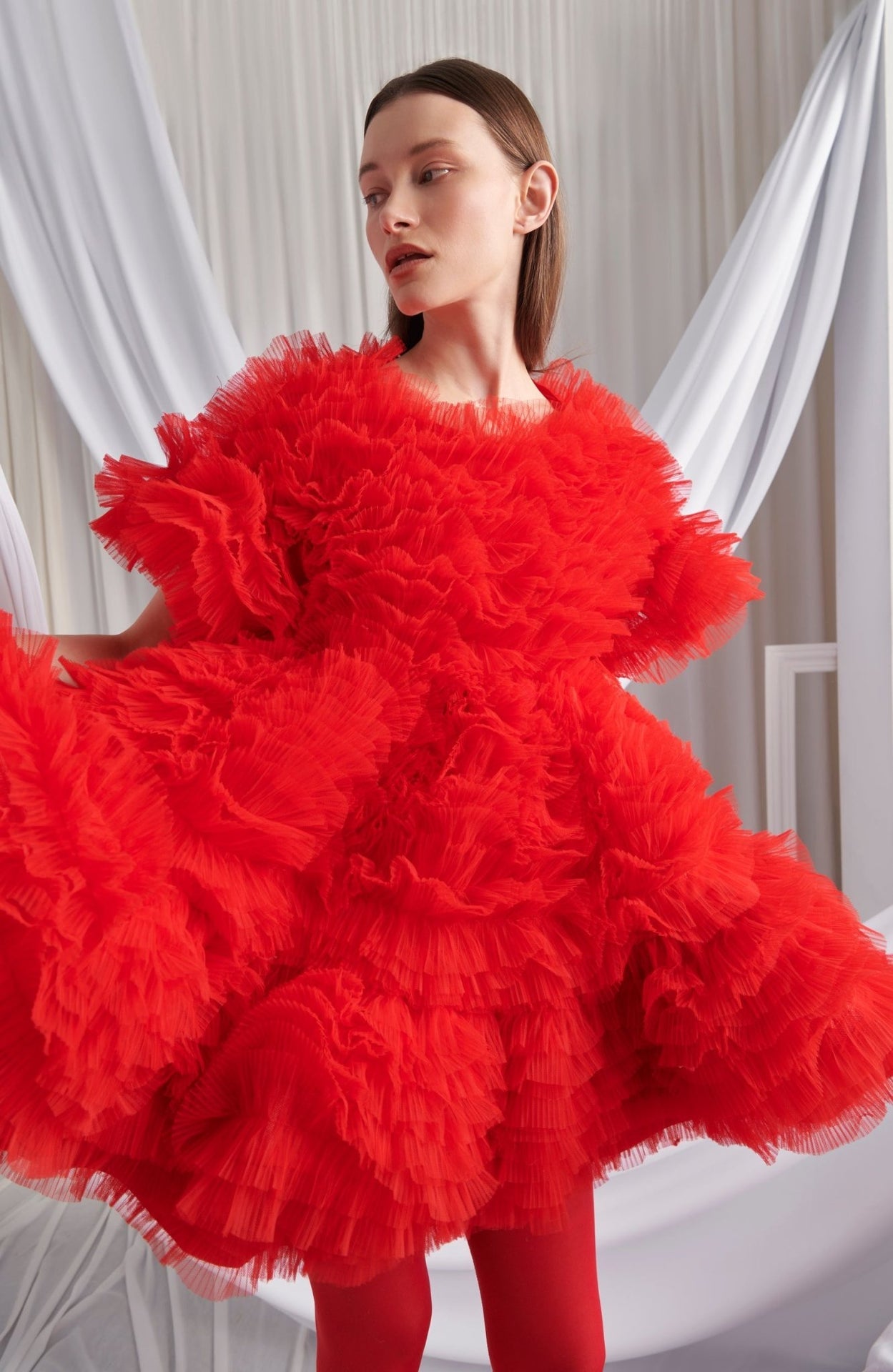 Turn heads and steal the spotlight in the Amor Dress—a playful, flirty, and utterly unique statement piece. Designed with multiple layers of airy tulle, this short red dress brings volume and movement, making every step feel like a twirl-worthy moment. The short sleeves with volume add a touch of charm.