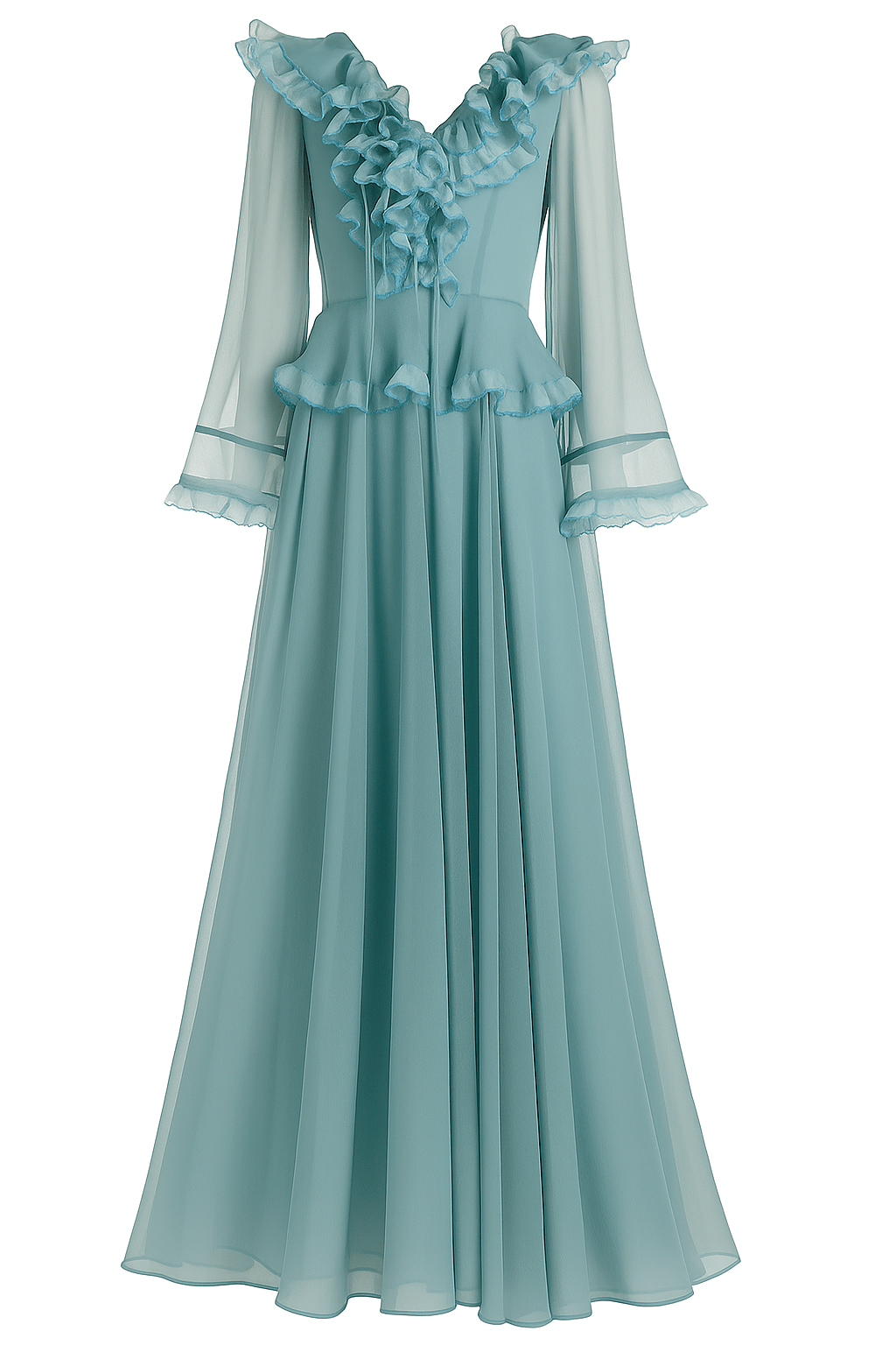The Bliss Dress floats with ethereal elegance in sheer aqua fabric, layered with romantic ruffles along the neckline and sleeves. Its flowing silhouette creates graceful movement, while the soft transparency adds a dreamy, feminine allure. Perfect for evening celebrations or daytime events that call for effortless sophistication. Side zip.