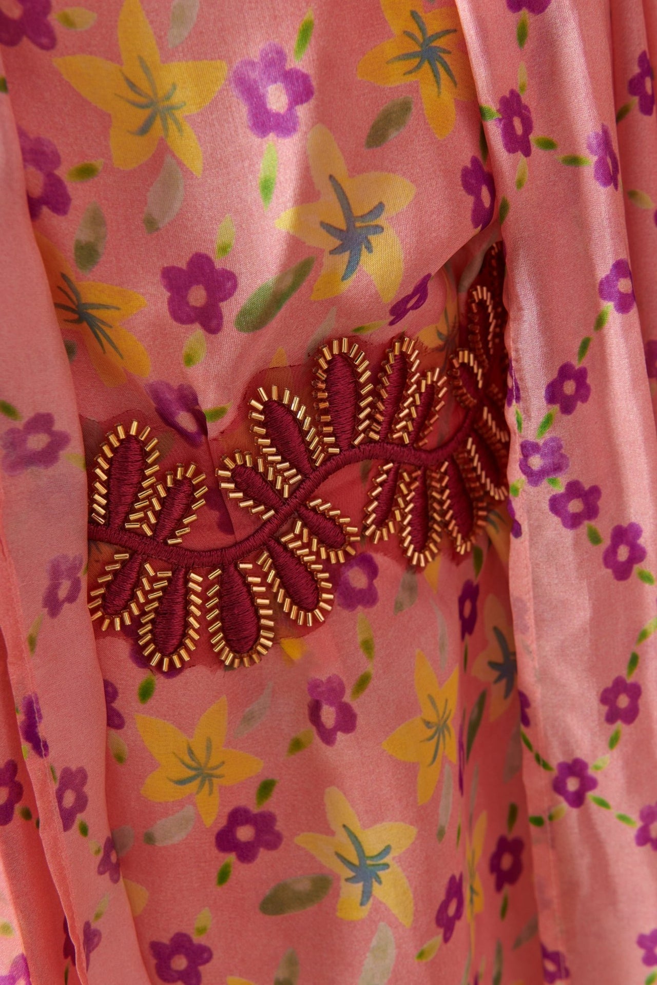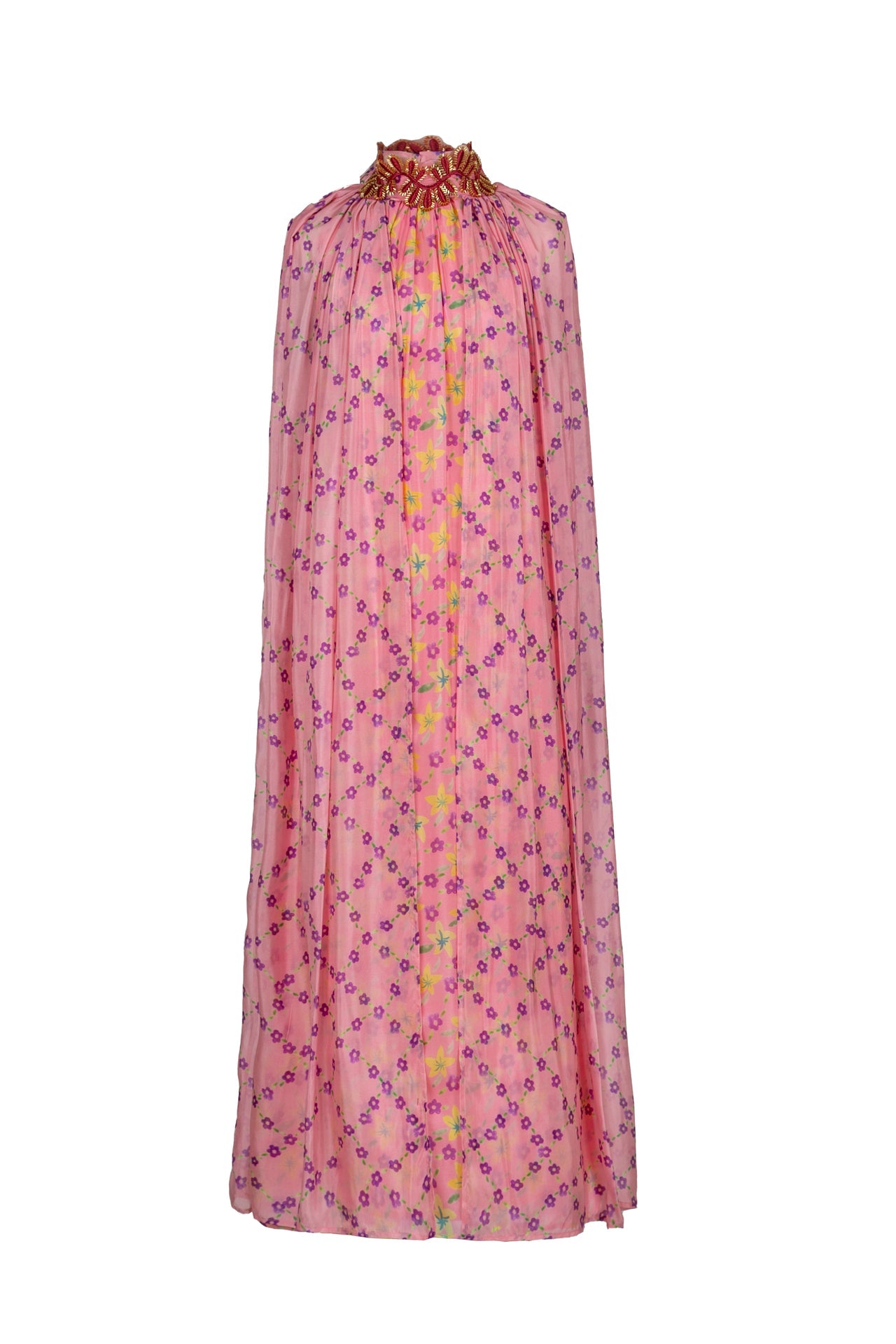 Radiante y etéreo, el vestido Crescent captura la luz y el movimiento. Confeccionado en capas de gasa translúcida y estampada con delicados motivos florales, cae con elegancia sobre una base con detalles florales. Sus espectaculares mangas tipo capa evocan alas, mientras que la cintura ceñida aporta una suave estructura a la silueta. Perfecto para bodas al aire libre, veladas al atardecer o cualquier ocasión envuelta en un toque de magia.