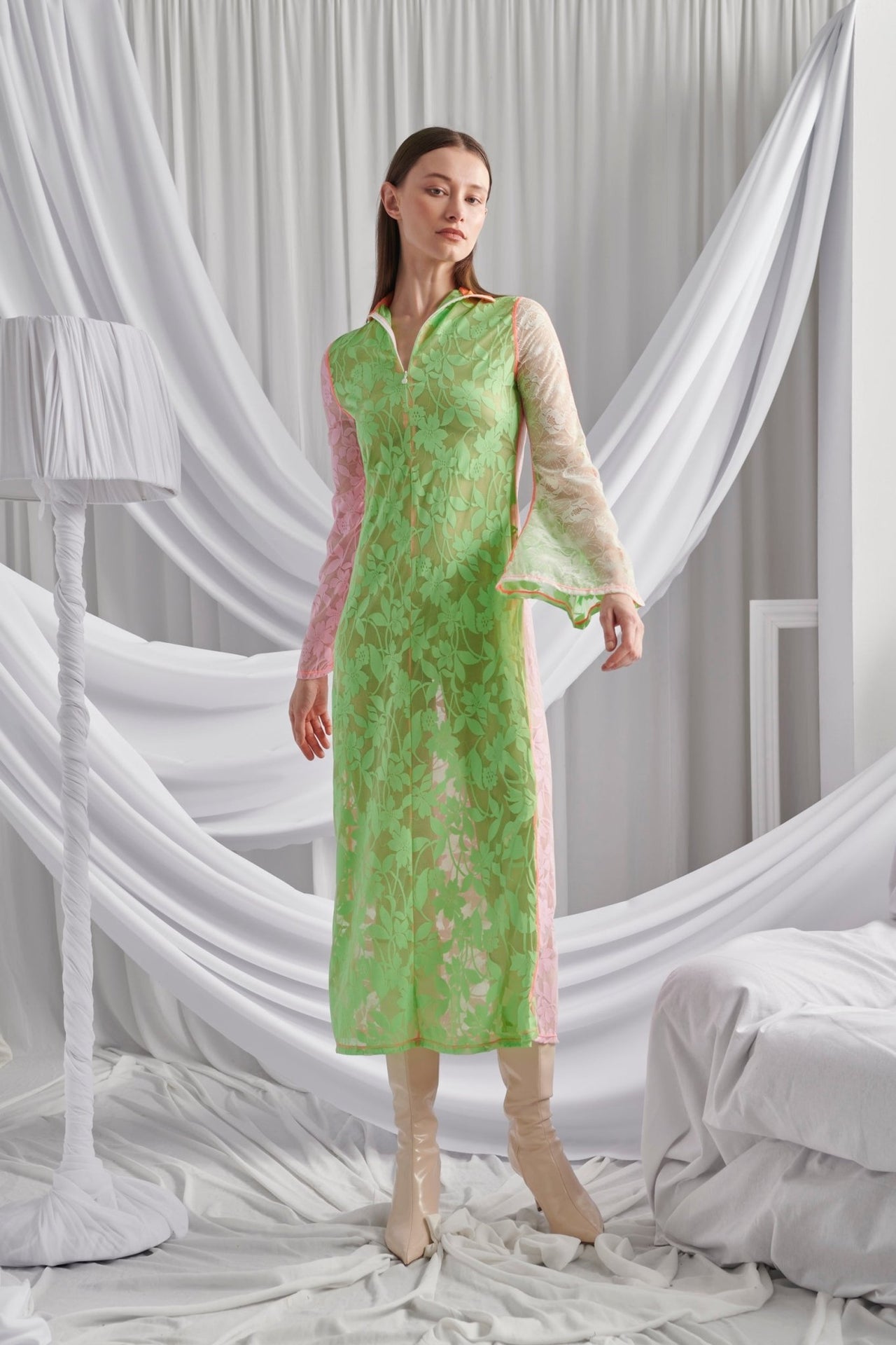 The Gioia Dress is a sleek and refined piece crafted in delicate green lace with a soft contrast of colors. Its long, straight silhouette is balanced by subtly flared sleeves, adding a touch of romance. Frontal zip and detachable collar. Lightweight and versatile, it transitions effortlessly from daywear elegance to evening sophistication.