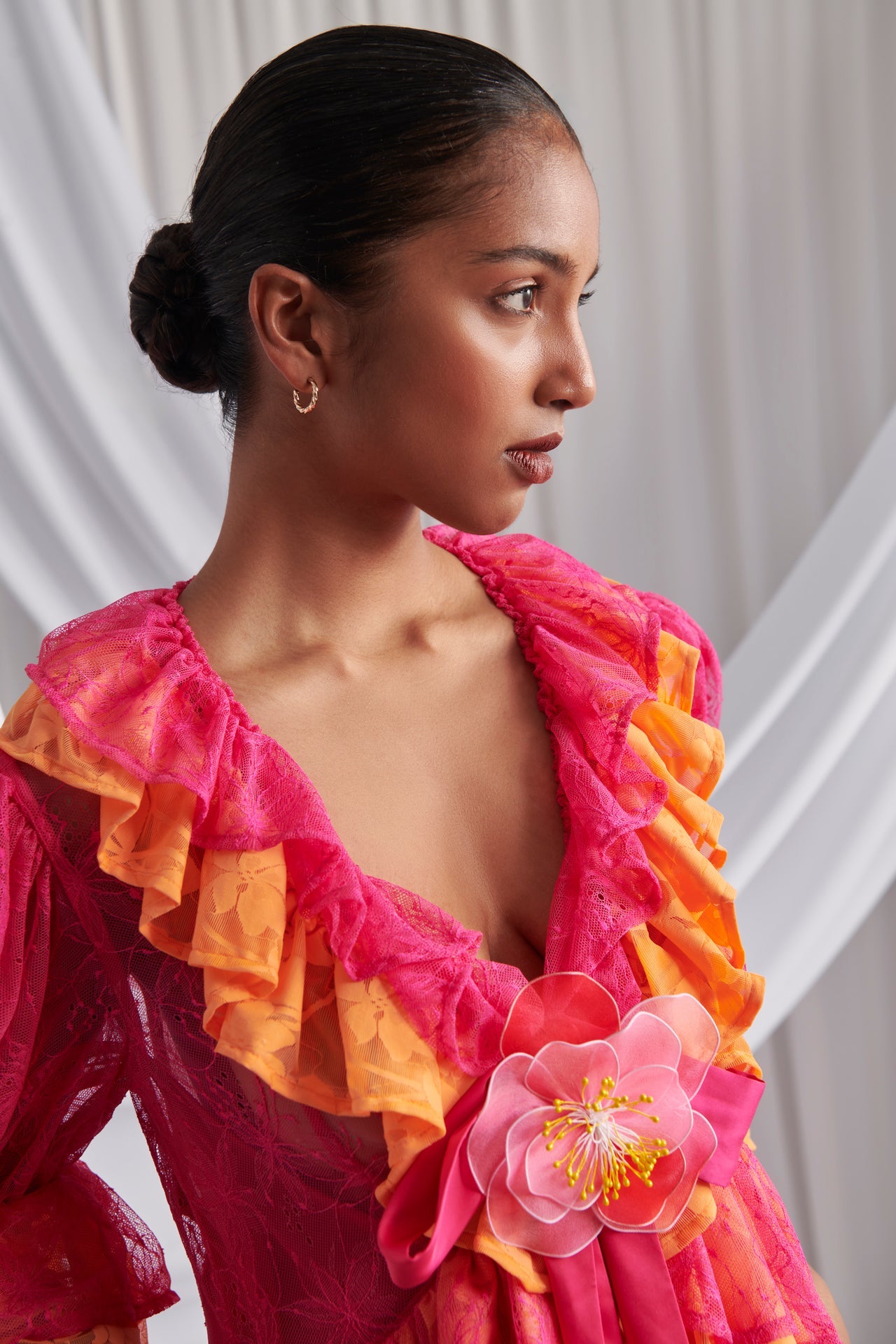 The Harmony Dress blends romantic lace with vibrant contrast ruffles in sunset hues of pink and orange. The flowing silhouette and deep V-neckline strike the perfect balance between elegance and playful energy.