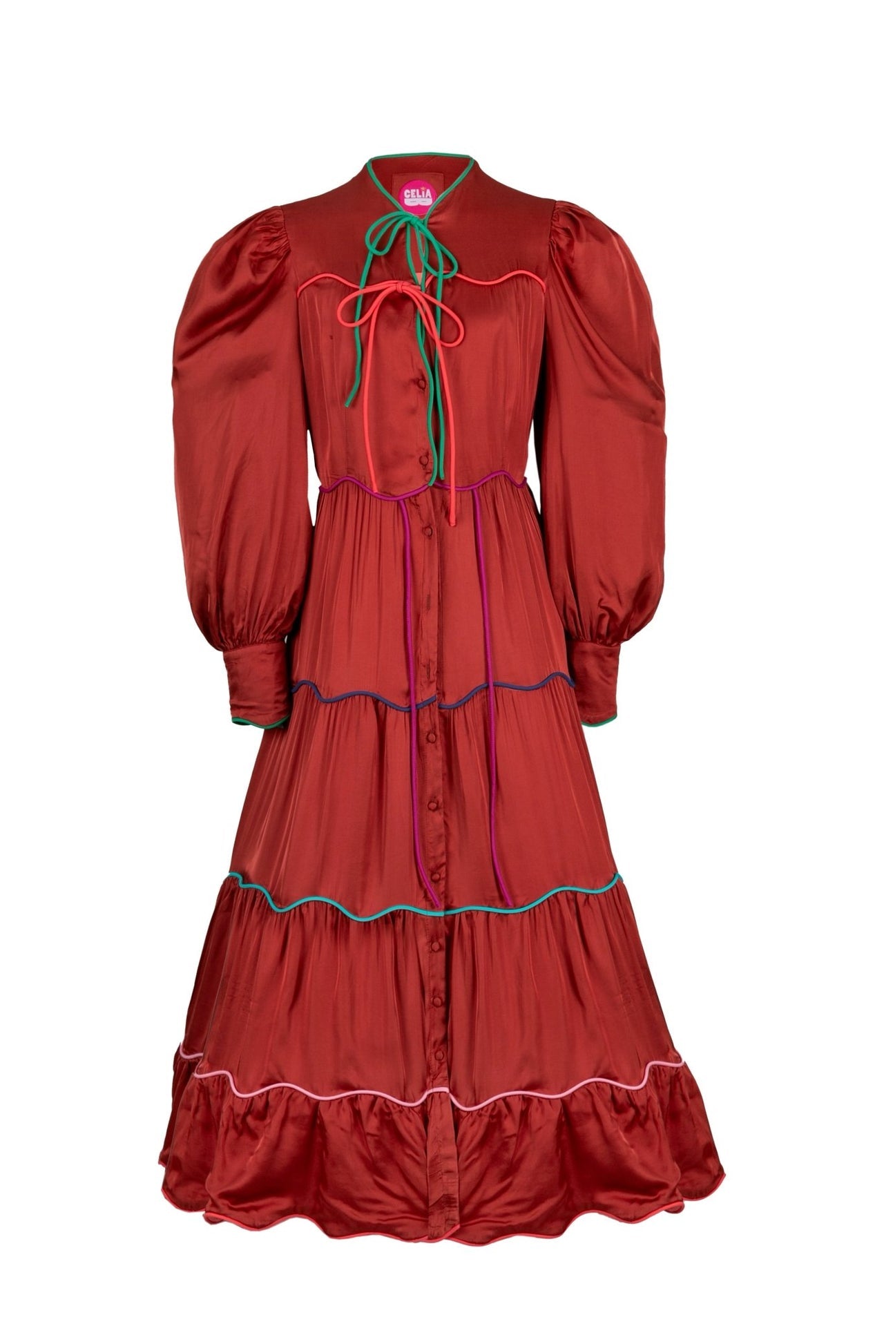 The Hope Dress is a reimagined house classic, crafted in coral with pastel and hot pink accents. Designed with long sleeves, a plunging neckline, and tiered ruffles, it balances drama with timeless elegance. A purple waist tie adds contrast and definition to the silhouette, making it a versatile choice for both day and evening wear.