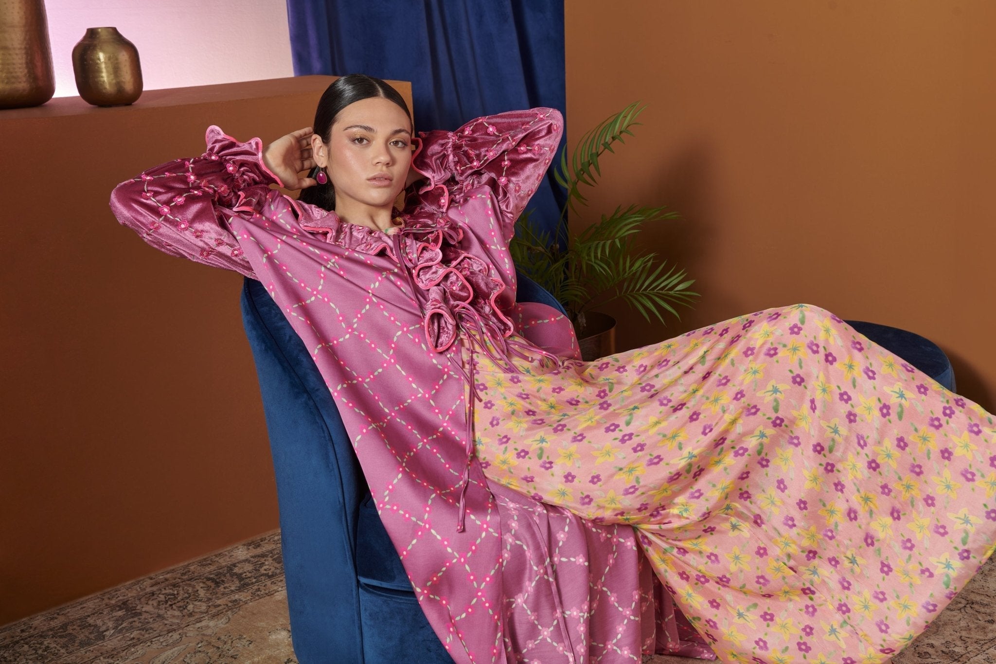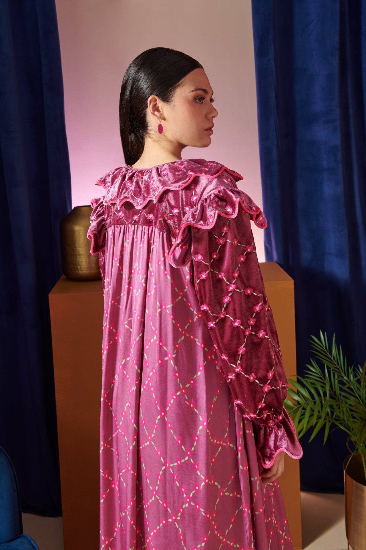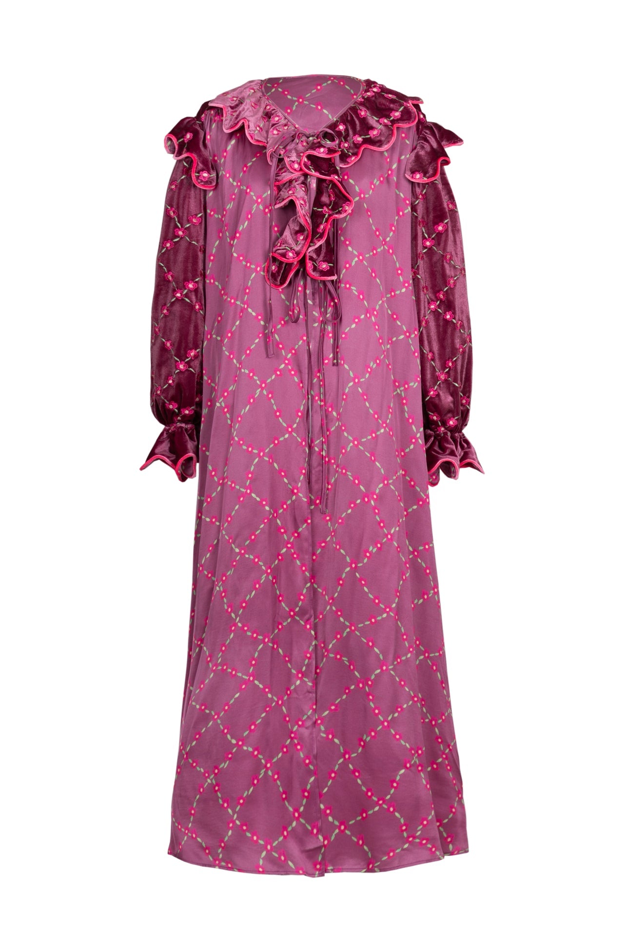 Todo una carta de amor al drama y la textura, este vestido mezcla  terciopelo y un tejido estampado en una silueta que resulta a la vez elegante y ligera. Con mangas en tonos baya, a su vez bordadas con flores y un escote con volantes en cascada, este vestido fluye con naturalidad, tanto para soñar despierta como para una velada nocturna. La energía romántica del terciopelo contrasta maravillosamente con el estampado de lunares, aportándole un encanto único.