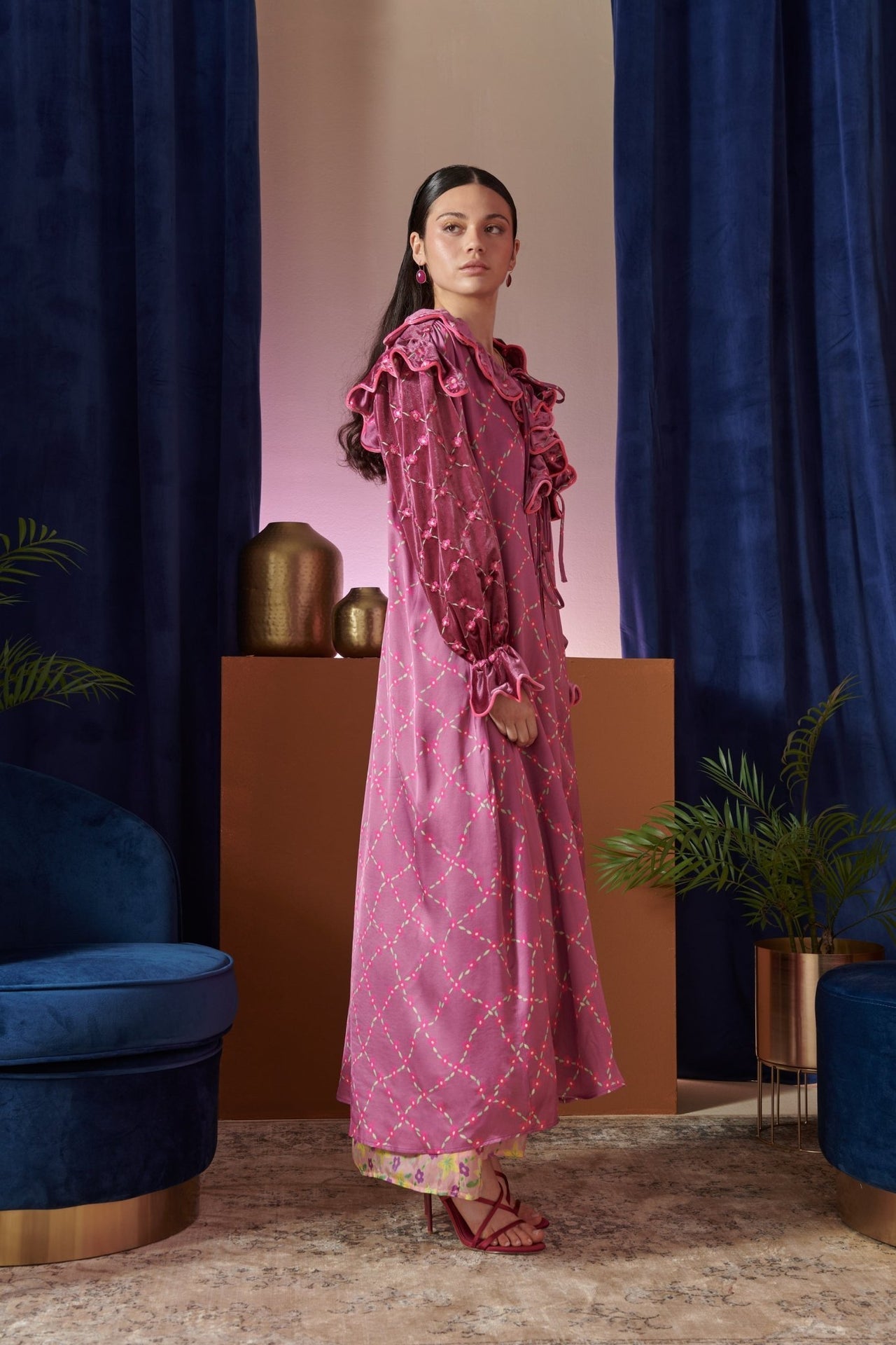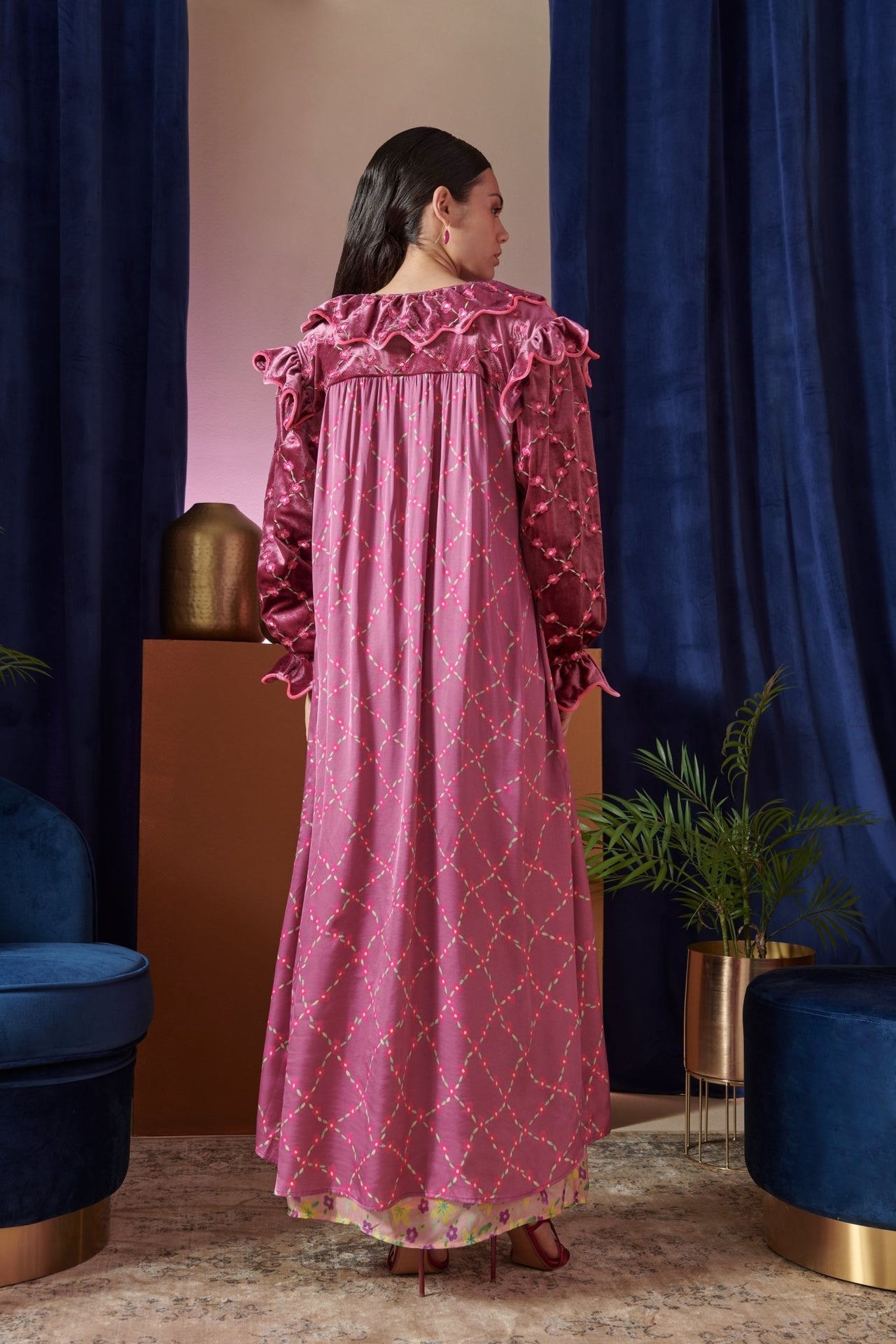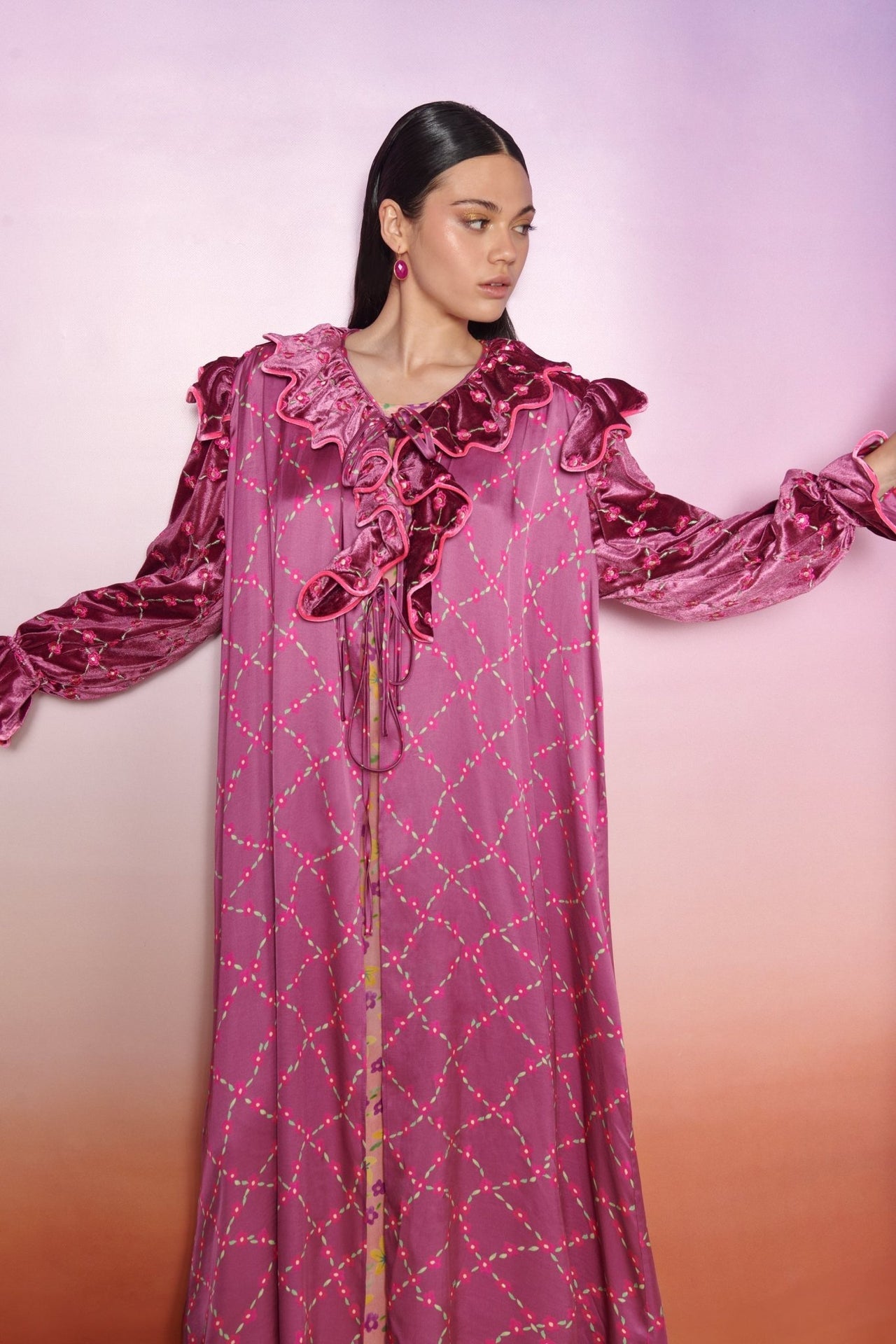 Todo una carta de amor al drama y la textura, este vestido mezcla  terciopelo y un tejido estampado en una silueta que resulta a la vez elegante y ligera. Con mangas en tonos baya, a su vez bordadas con flores y un escote con volantes en cascada, este vestido fluye con naturalidad, tanto para soñar despierta como para una velada nocturna. La energía romántica del terciopelo contrasta maravillosamente con el estampado de lunares, aportándole un encanto único.