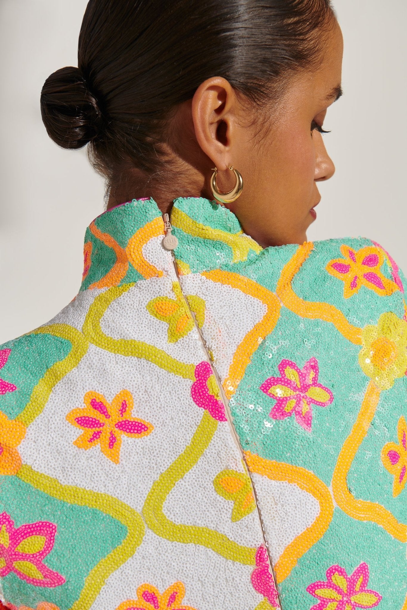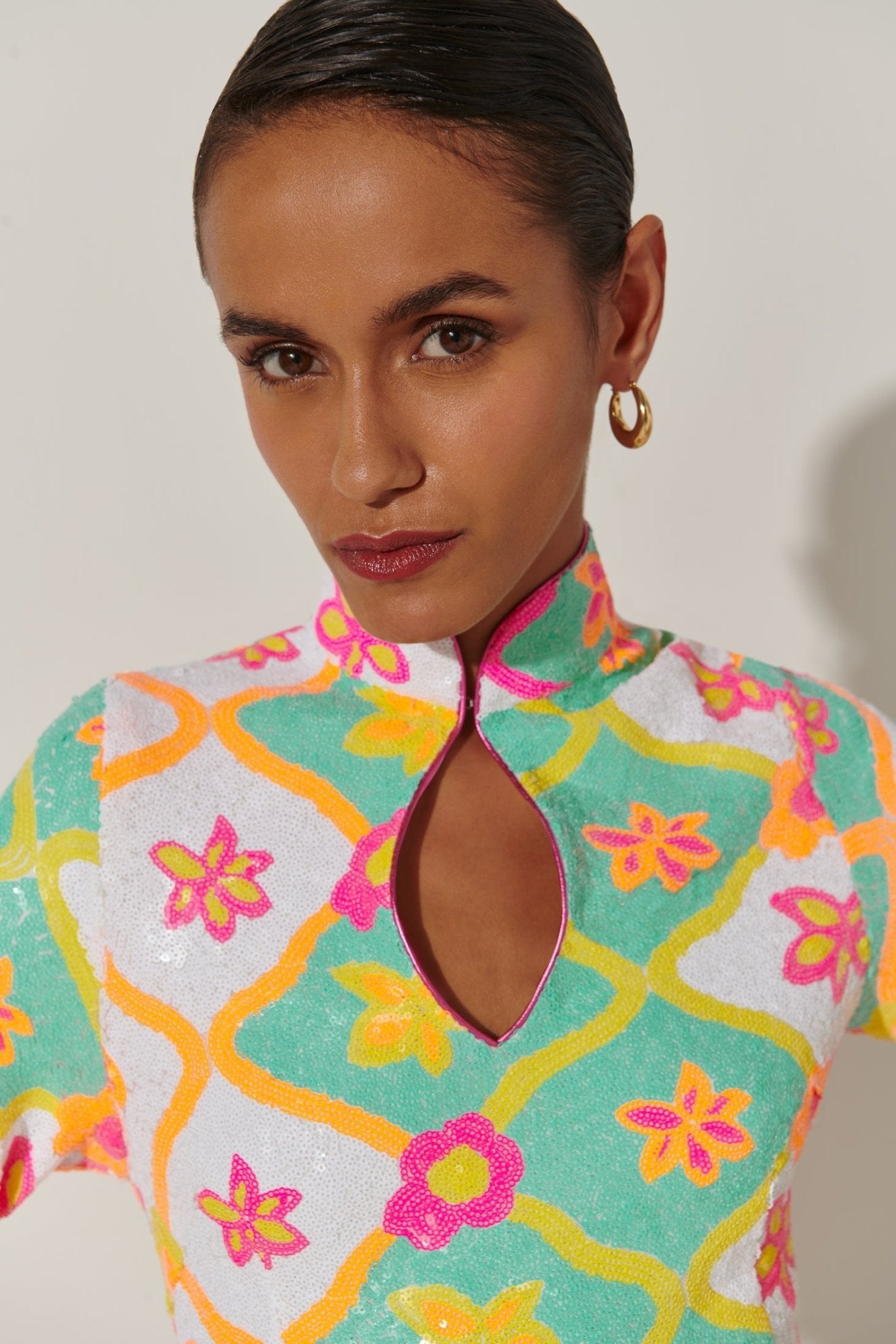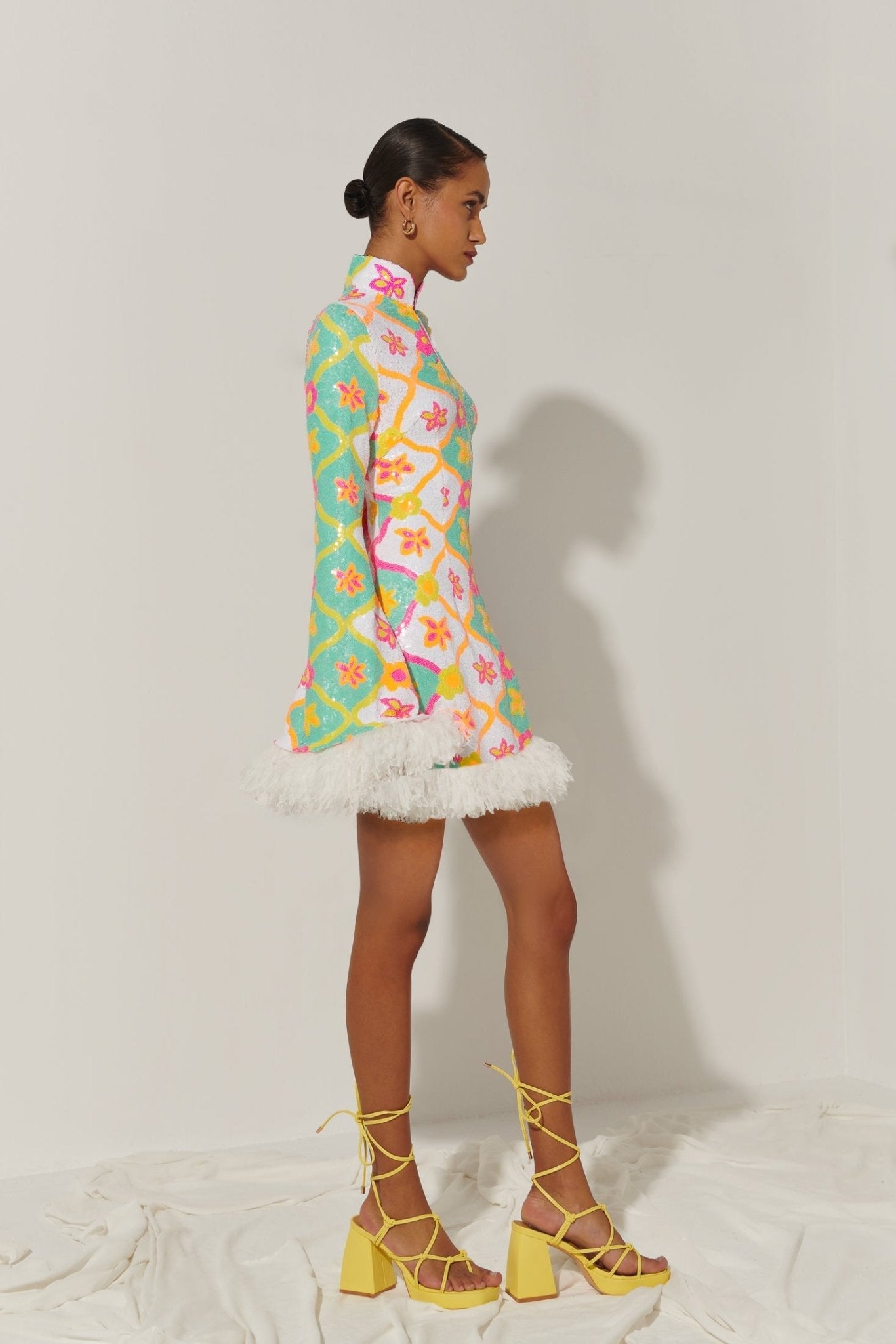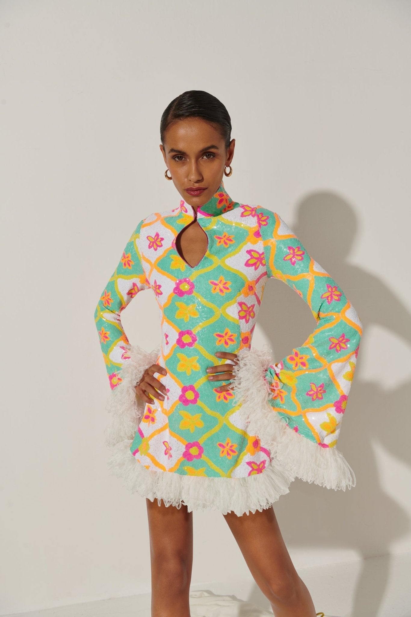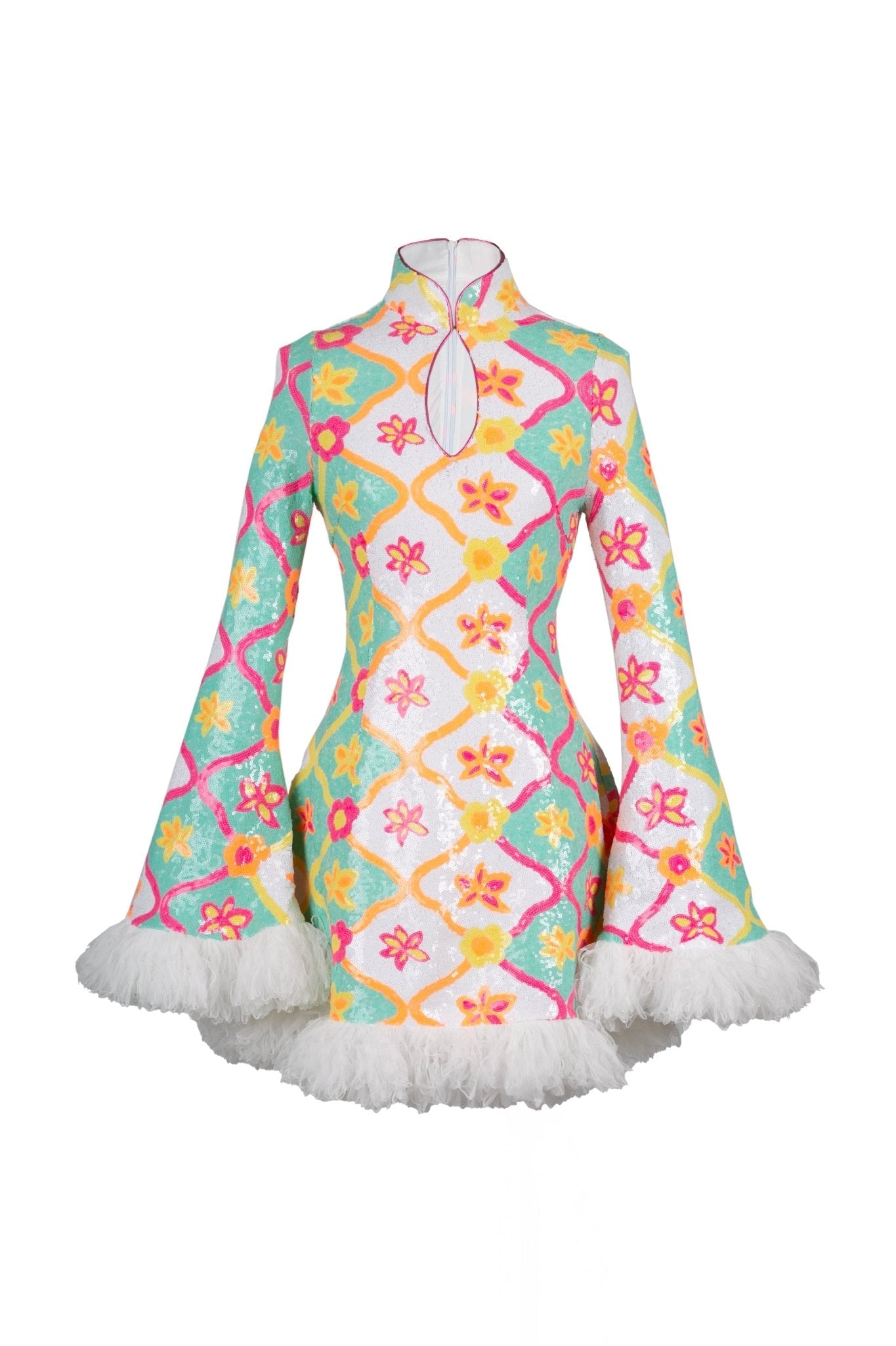 Déjate seducir por el glamour retro. El vestido Jimena evoca la energía de los años 60 con su estampado psicodélico de lentejuelas florales, mangas acampanadas extragrandes y un lujoso ribete de plumas. El cuello alto y el escote en forma de ojo de cerradura le dan un toque de sofisticación a esta silueta desenfadada.