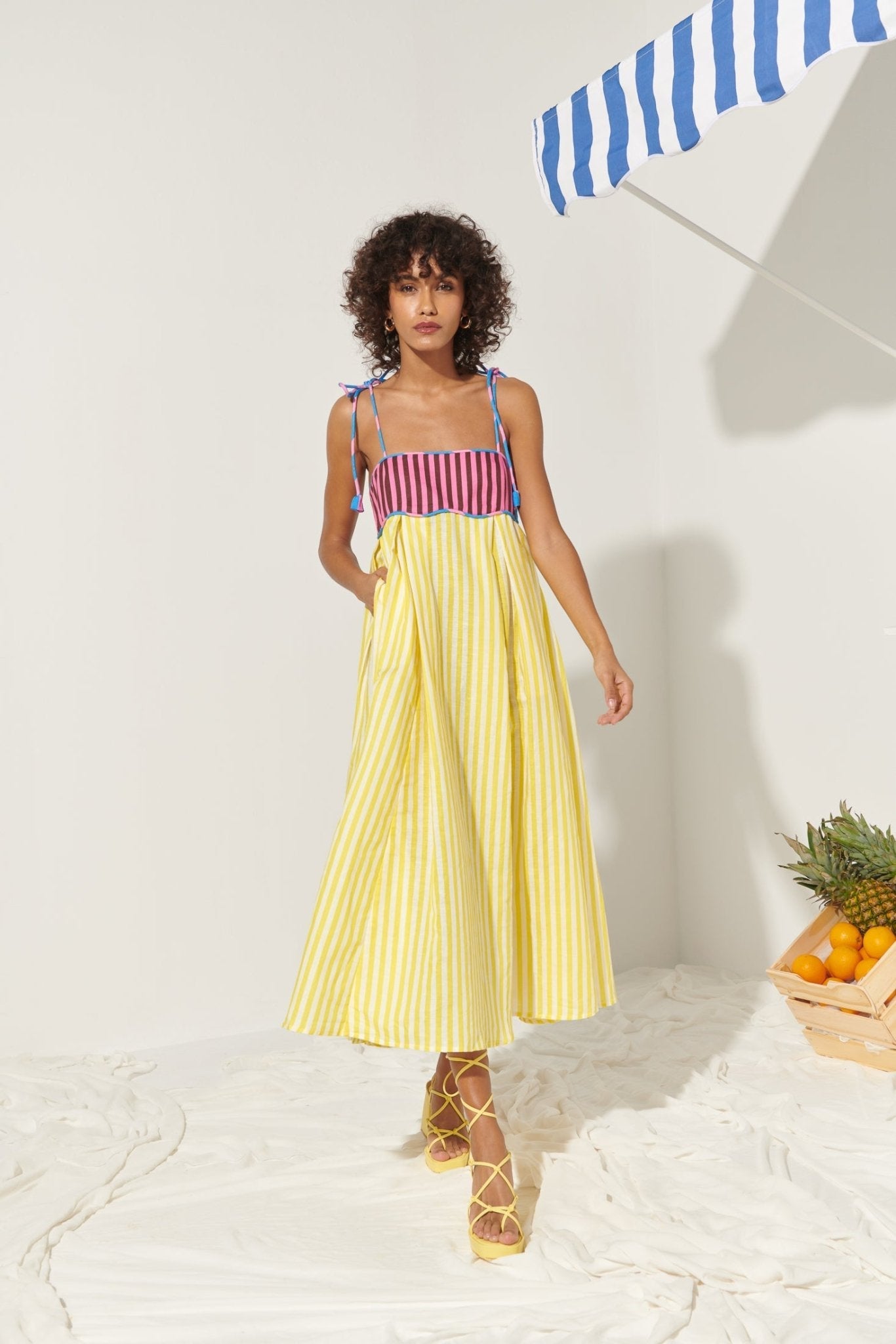 Alegre, fresca y con un diseño que invita al movimiento, el vestido Lola combina un corpiño ajustado a rayas de colores con una falda amarilla fluida de algodón fresco. Sus divertidos tirantes y la espalda descubierta le dan un encanto natural que resulta perfecto para disfrutar del sol.