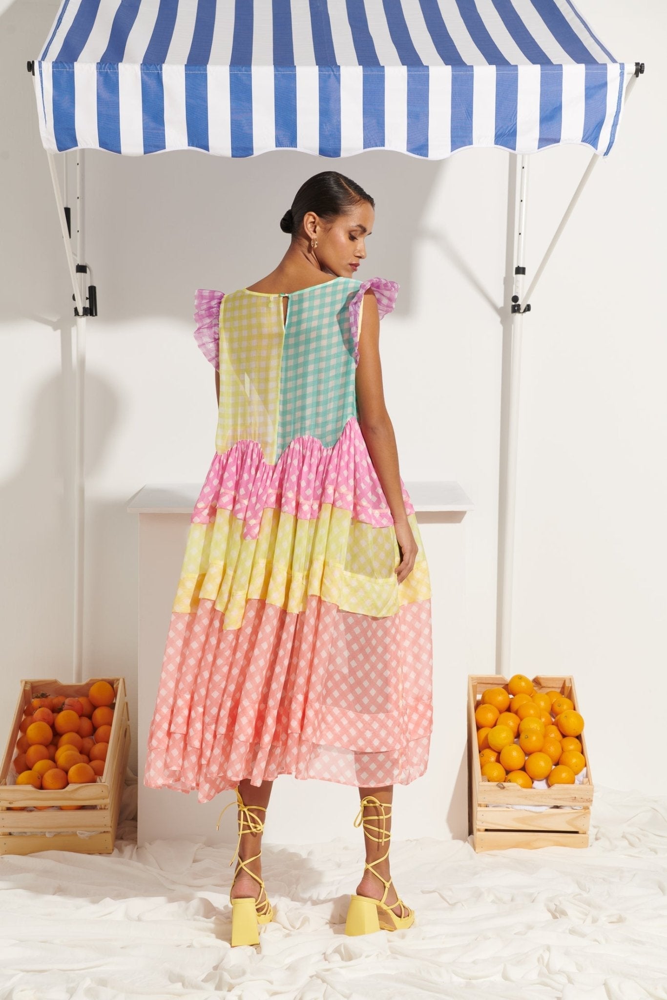 Ligero como el aire y lleno de encanto, el vestido Manuela combina cuadros pastel en rosa, amarillo, lila y aguamarina para un efecto patchwork de ensueño. Con hombros con volantes, una silueta relajada y un bajo asimétrico, fluye con cada paso. Una prenda ideal para esos días en que te sientes bien.