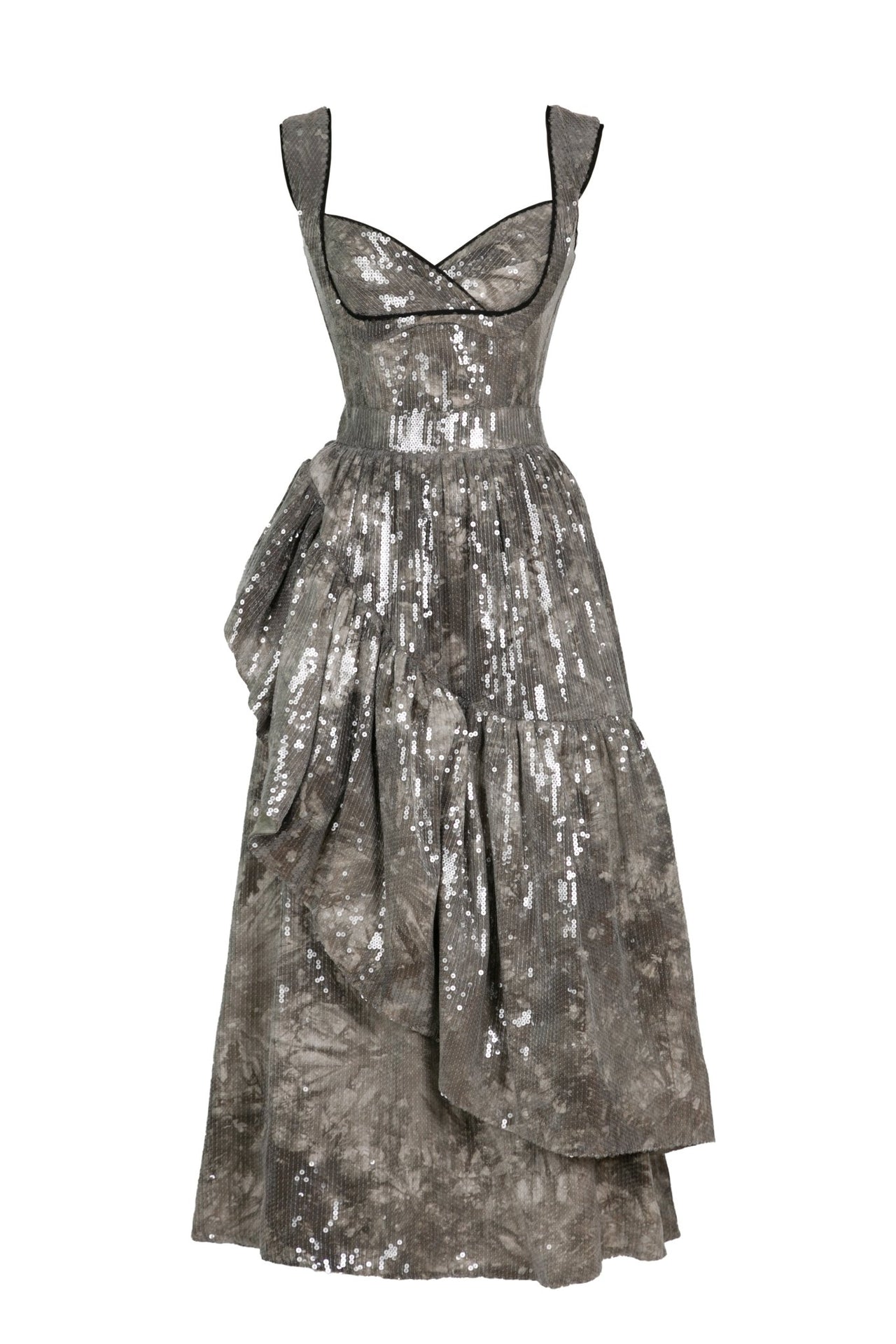 El vestido Silvermoon está pensado para deslumbrar. Confeccionado en un tejido plateado brillante, presenta un corpiño estructurado con escote corazón y ribetes negros, y una falda asimétrica en capas que refleja la luz con cada paso. Su contraste entre brillo y suavidad le confiere un aire escultural y etéreo, a partes iguales moderno y mítico.