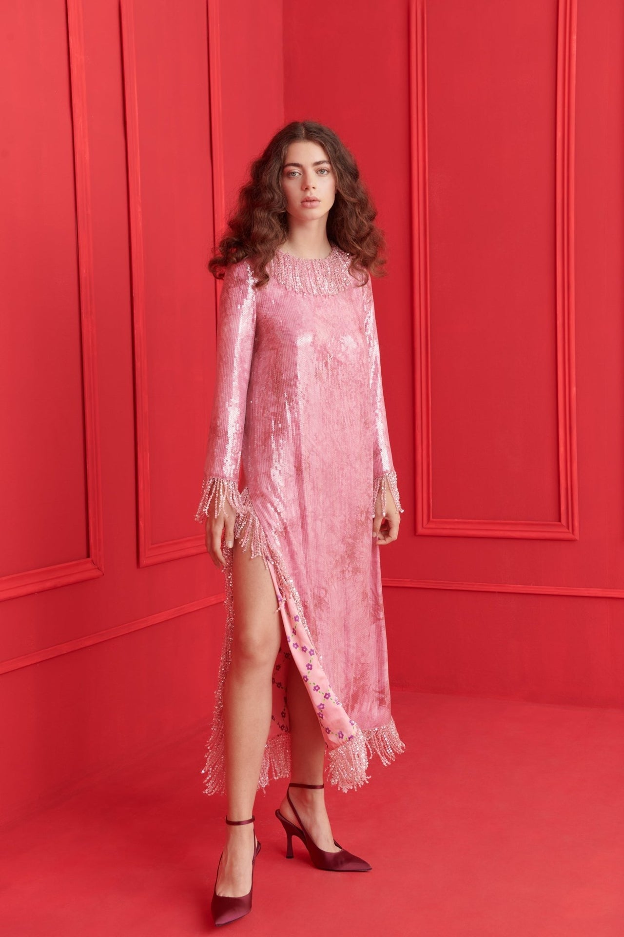 El vestido Thea es un vestido midi de corte recto con brillantes lentejuelas rosas, rematado con flecos de cuentas intrincados que se balancean con cada paso. Diseñado con una abertura alta a cada lado y detalles de cuentas en cuello y puños, esta prenda añade un toque divertido y sofisticado a cualquier velada. Su silueta relajada garantiza elegancia y movimiento naturales. Perfecto para ser el centro de atención en cualquier evento.