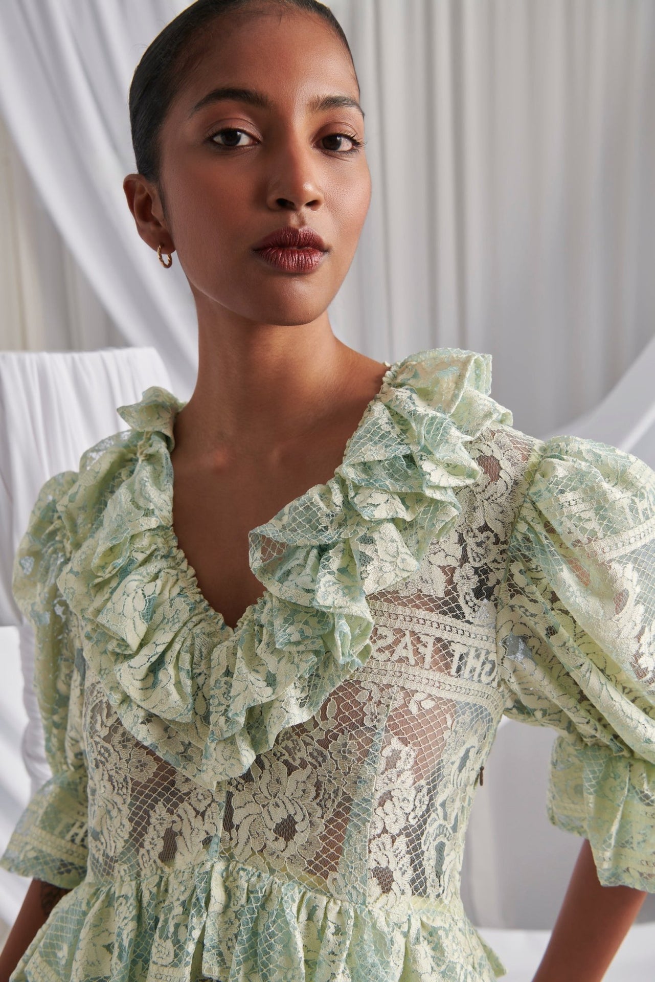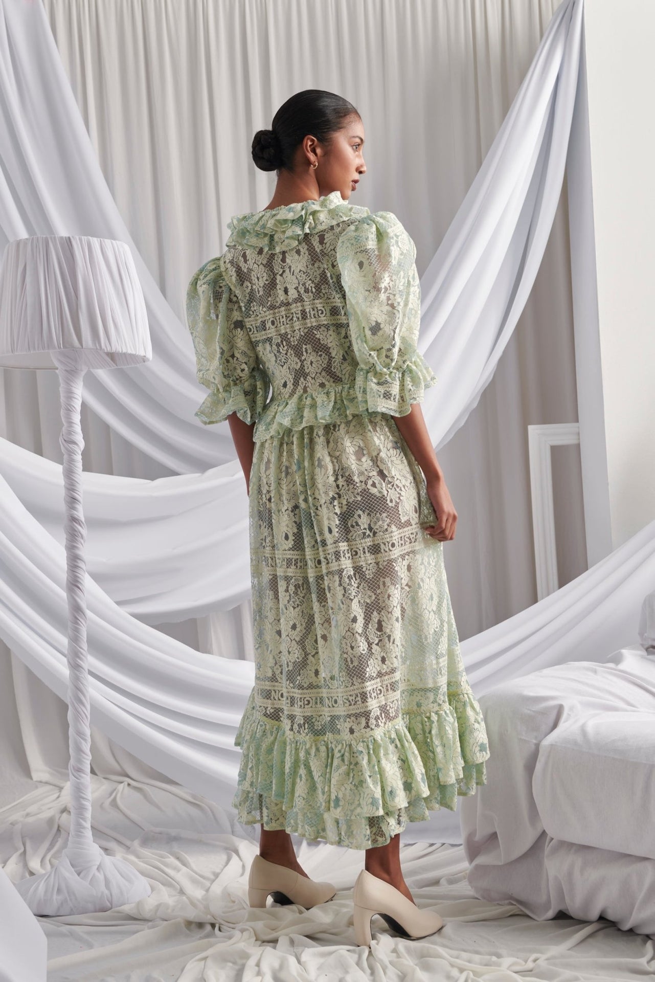 The Shimmer Dress enchants with its delicate sheer fabric embroidered with sparkling details. Designed with romantic ruffles along the neckline, waist, and hem, it flows with graceful movement. In soft pastel green, this midi dress captures light and elegance, perfect for dreamy occasions.