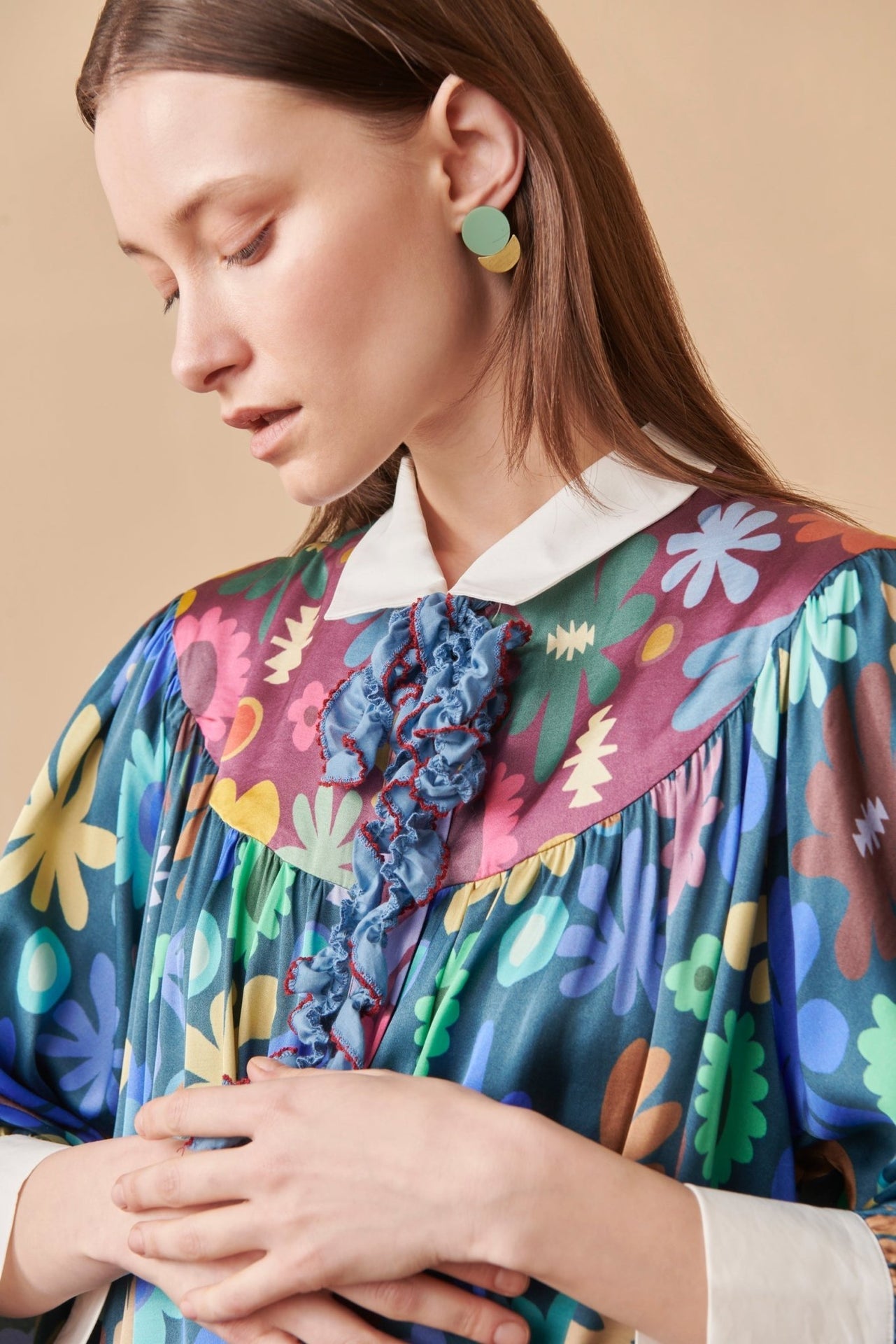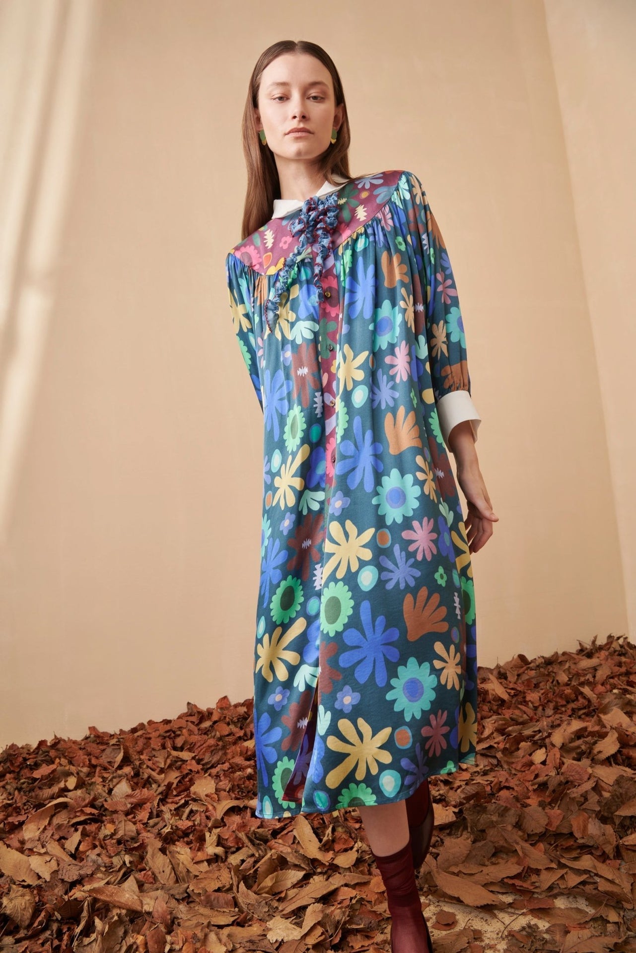 The Sensitivity Dress offers an effortless, relaxed silhouette in a bold floral print of blue, green, yellow, and red. Designed with a rounded neckline, subtle pleating, and three-quarter sleeves, it combines comfort with playful elegance. A versatile midi dress perfect for day-to-day wear or casual gatherings.