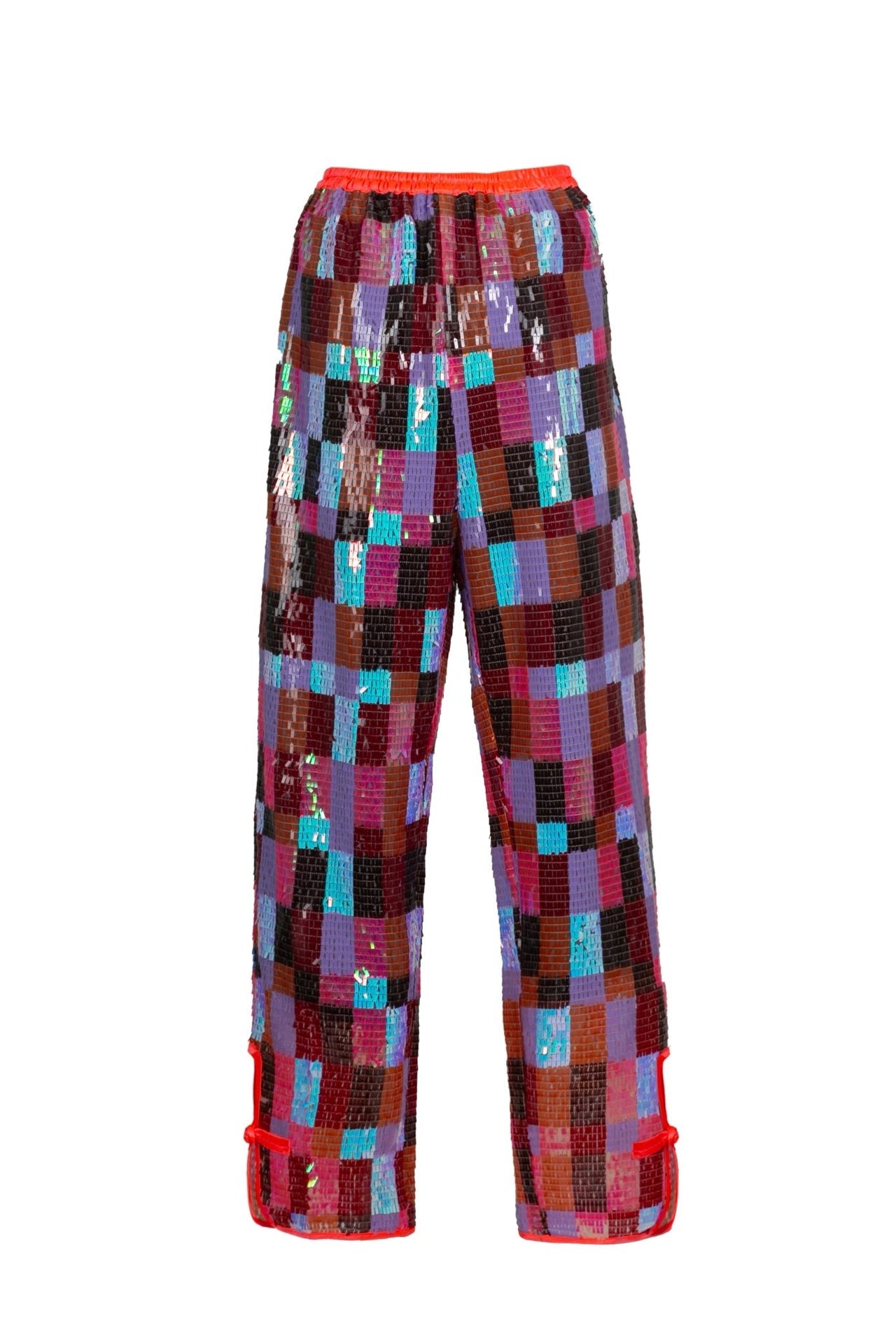The Esplendor Pants bring disco-inspired glamour with their wide-leg silhouette and dazzling sequin patchwork. Comfortable yet striking, they are designed to catch the light from every angle. Pair with the matching top for a full-on statement look. Includes side pockets and an elastic waistband.