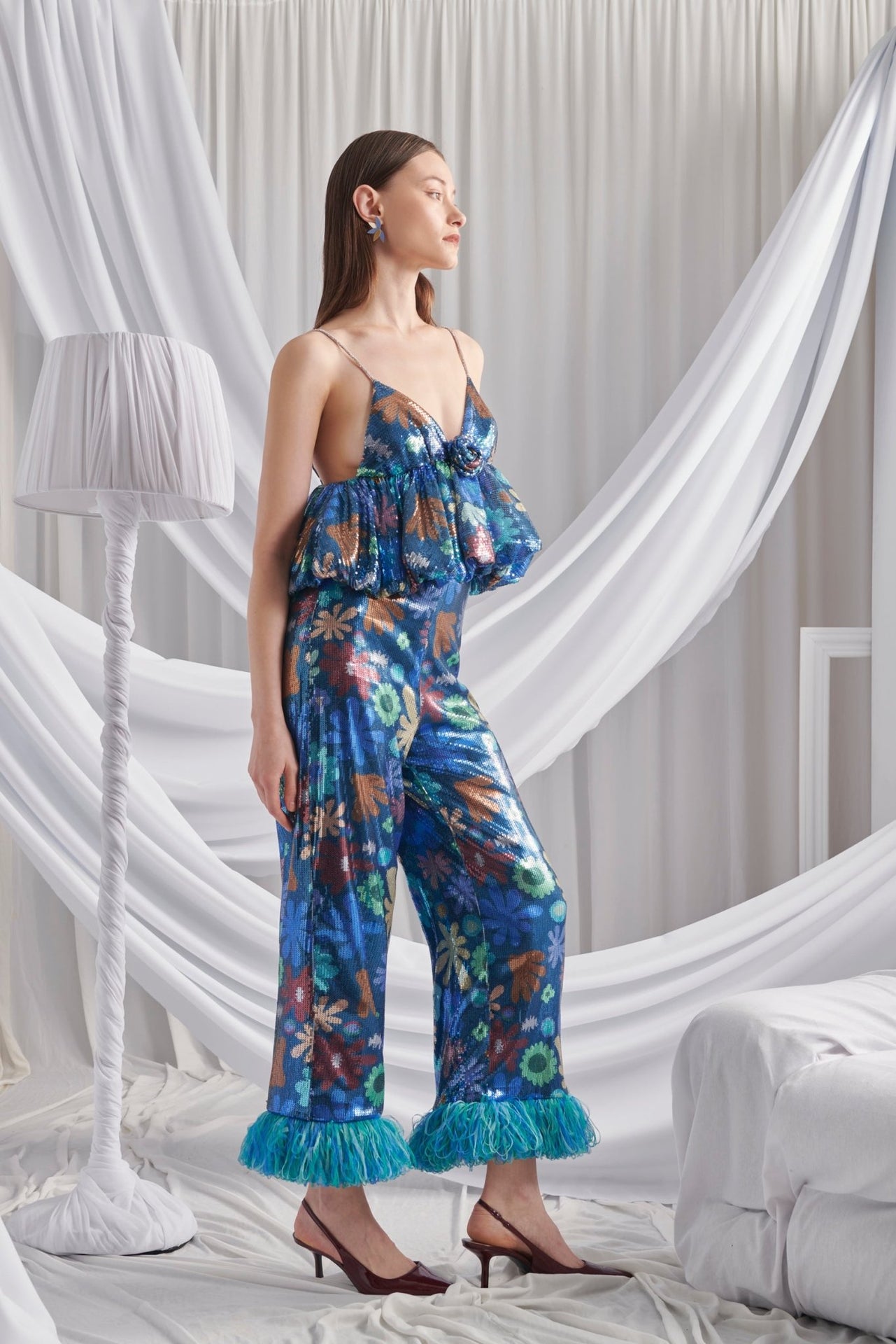The Luce Pants bring effortless glamour with a wide-leg cut and this season’s striking floral print in blue tones. Finished with turquoise feather trim at the hem, they balance playful detail with elegant flow. Pair with the Luce Top for the full set.