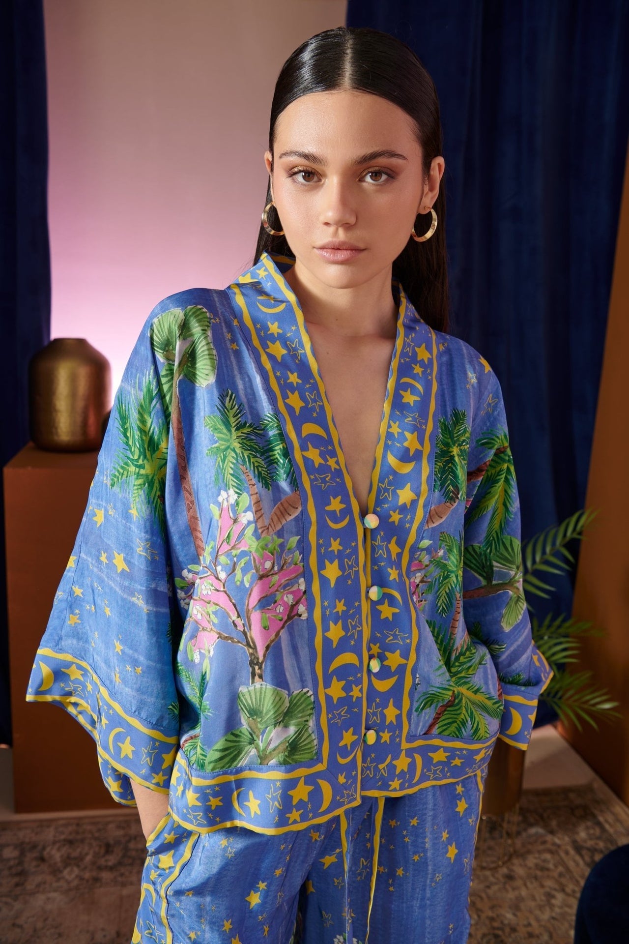 El Noche Set es el conjunto ideal para un look glamuroso y desenfadado. Inspirado en los sueños celestes y las escapadas tropicales, este conjunto de dos piezas cuenta con una blusa kimono de corte holgado y pantalones anchos confeccionados en tejido sedoso. El fondo azul intenso está adornado con palmeras, flores rosas y un borde dorado de estrellas y lunas. Llévalo como total look o combínalo para lograr esa elegancia casual. Es perfecto para mañanas tranquilas, cócteles al atardecer o noches estrelladas.