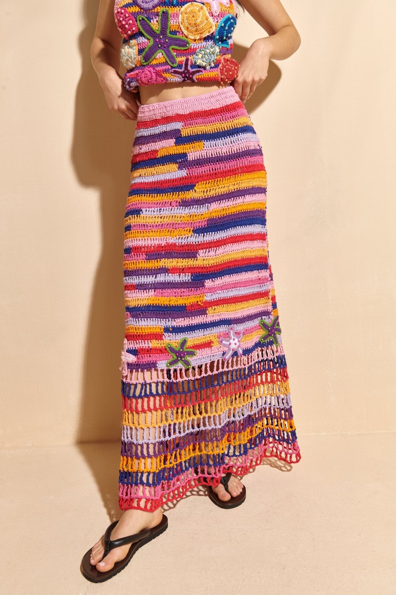 Vibrante, fresca e inconfundiblemente atrevida, la falda Venus es una obra maestra del crochet. Tejida a mano con una paleta de rayas saturadas en tonos arcoíris rosas, naranjas y azules, presenta un dobladillo acampanado con pespuntes y apliques con forma de estrella de mar. Su corte de tiro medio es cómodo y favorecedor, ceñido a la cadera y con una silueta fluida.