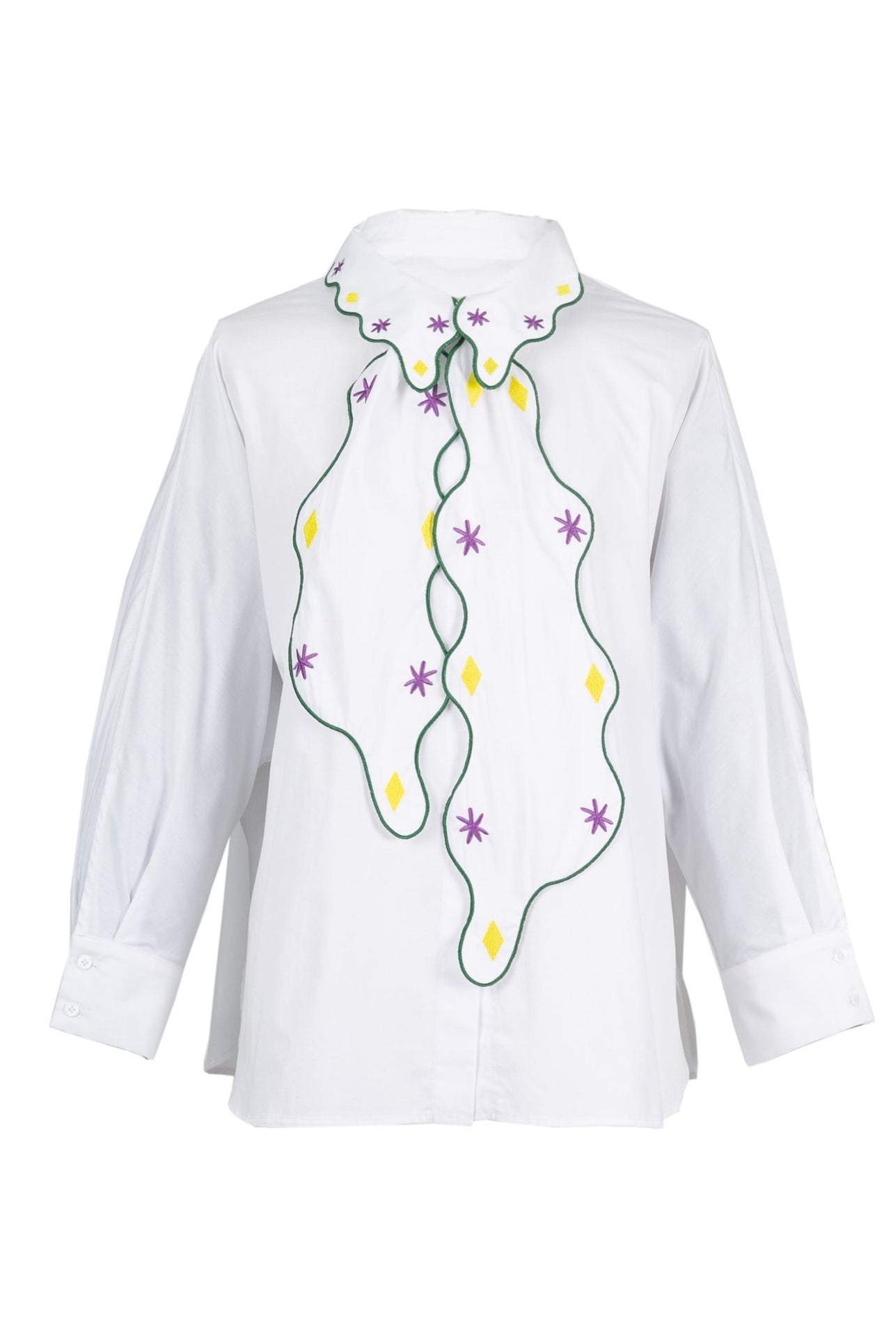 The Affection Top reimagines the classic white shirt with signature Celia B flair. Crafted in crisp cotton, it features a dramatic scalloped bib collar extending into a front panel, richly embroidered with yellow, purple, and green edging. The tailored fit, button-down front, and three-quarter sleeves balance structure with playful artistry. Perfect for elevating everyday looks or pairing with bold skirts and trousers for a statement ensemble.