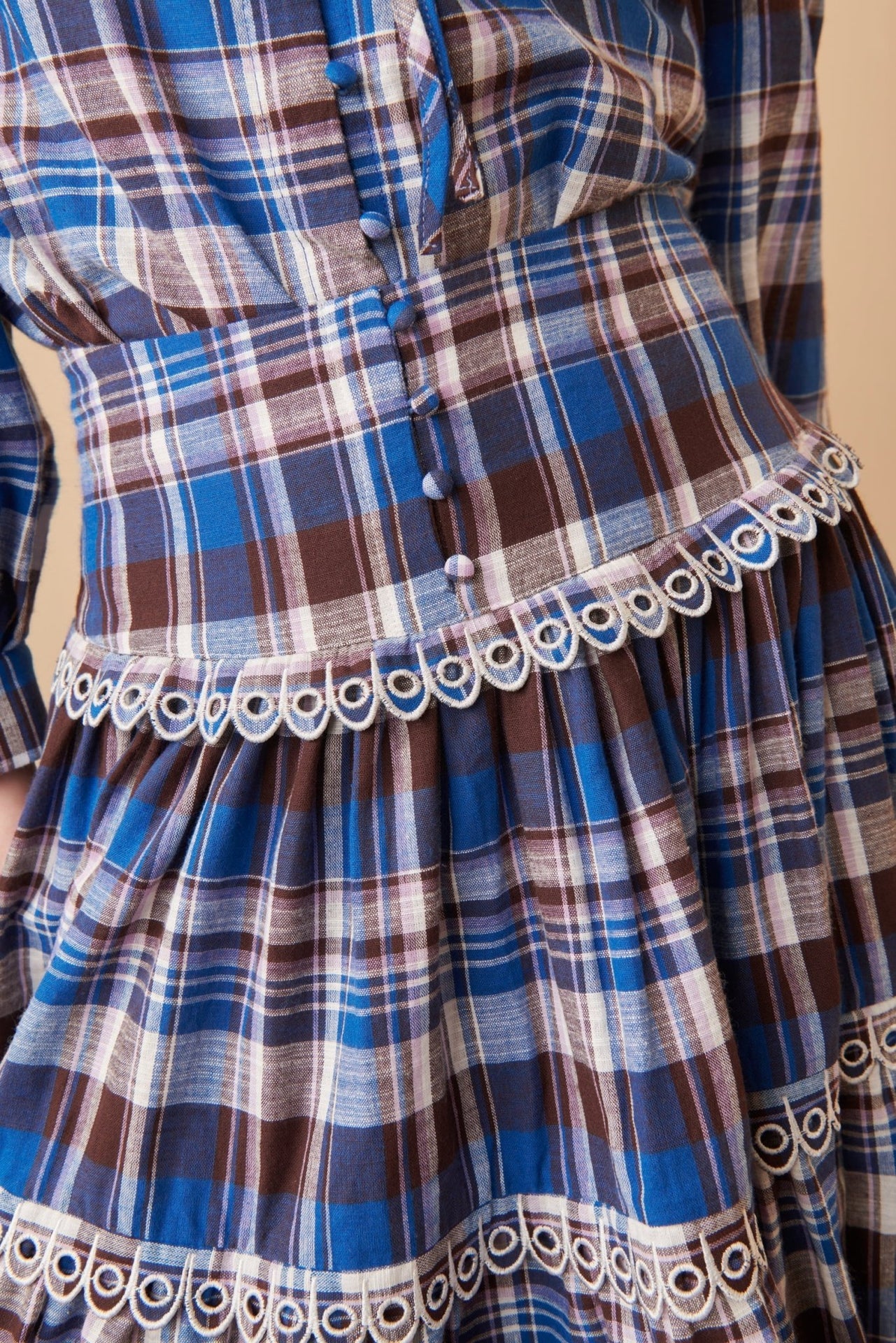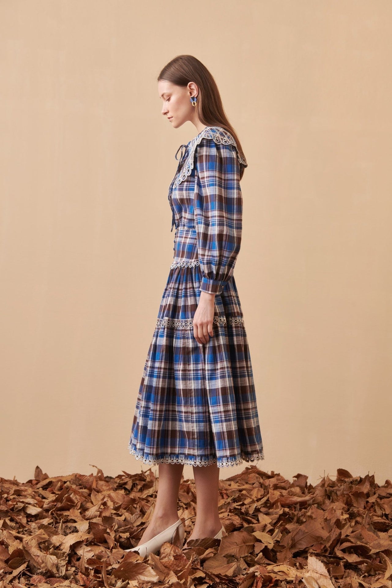 The Agape Top redefines the classic plaid blouse with a romantic twist. Crafted in a blue, brown, and cream check to match the Agape Skirt, it features a dramatic pleated fan collar finished with delicate white lace trim. The button-up front and tailored bodice are complemented by gently puffed sleeves with button cuffs, balancing structure and softness. Wear with the matching skirt for a polished set or style with denim for a more relaxed approach.