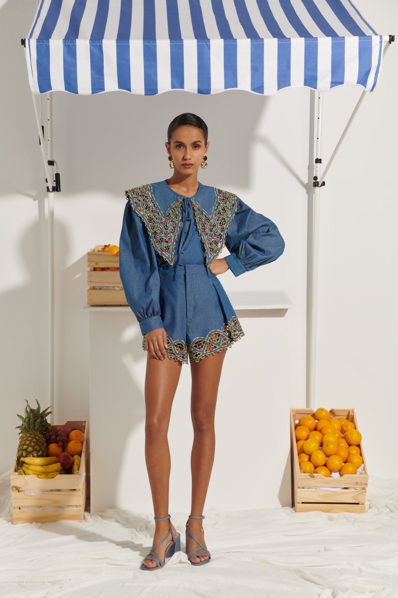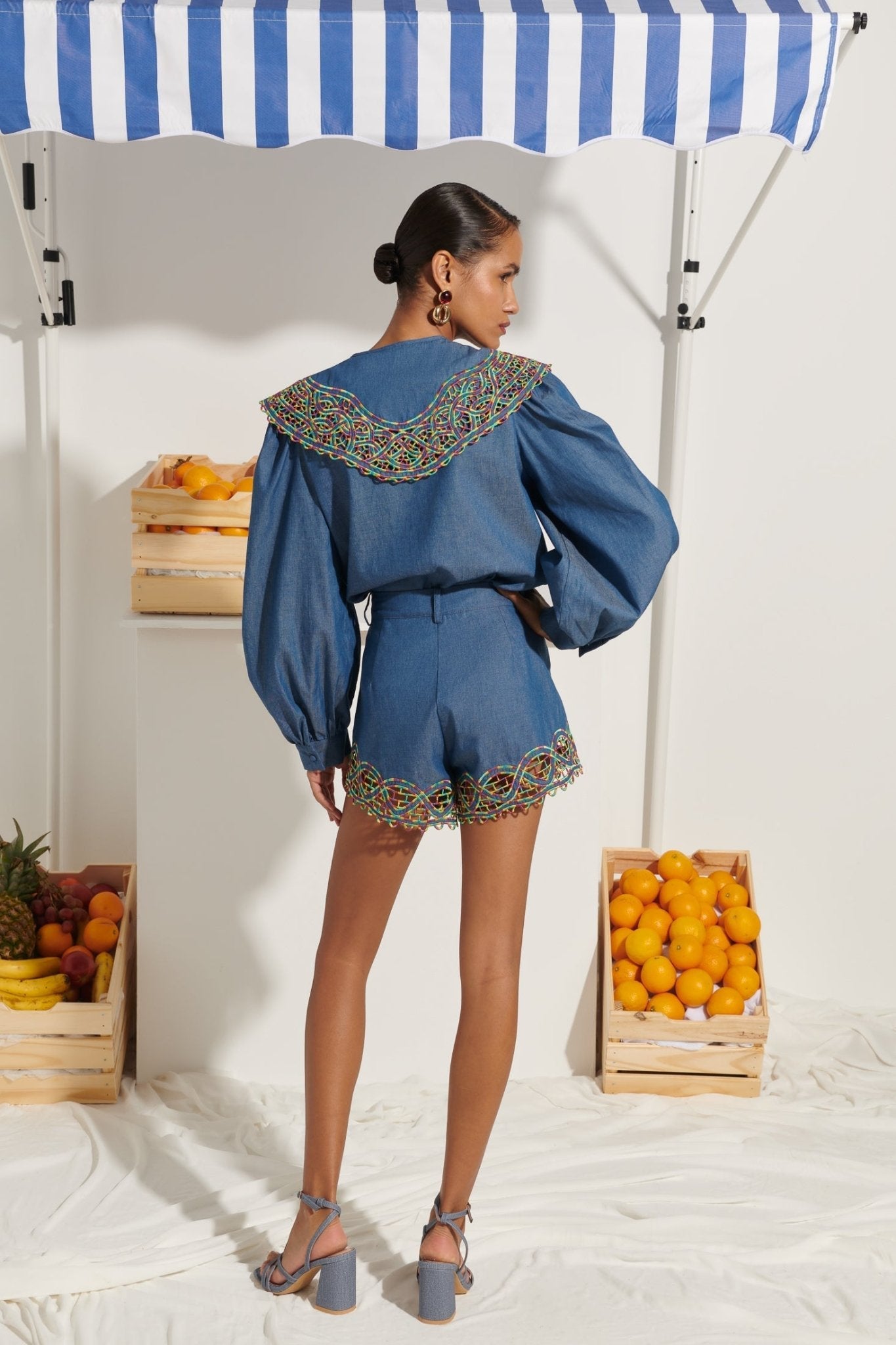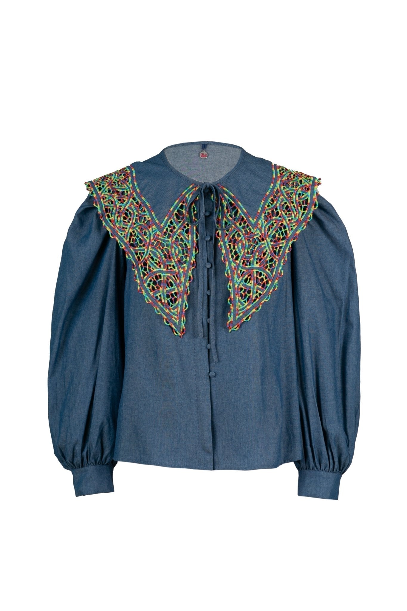 La blusa Begoña, de una elegancia exquisita, está confeccionada en suave denim y luce un cuello bordado extragrande en tonos verdes, amarillos y naranjas que se convierte en el centro de atención. Sus mangas voluminosas y el delicado detalle del lazo al cuello le aportan un toque romántico a esta silueta estructurada y a la vez desenfadada.