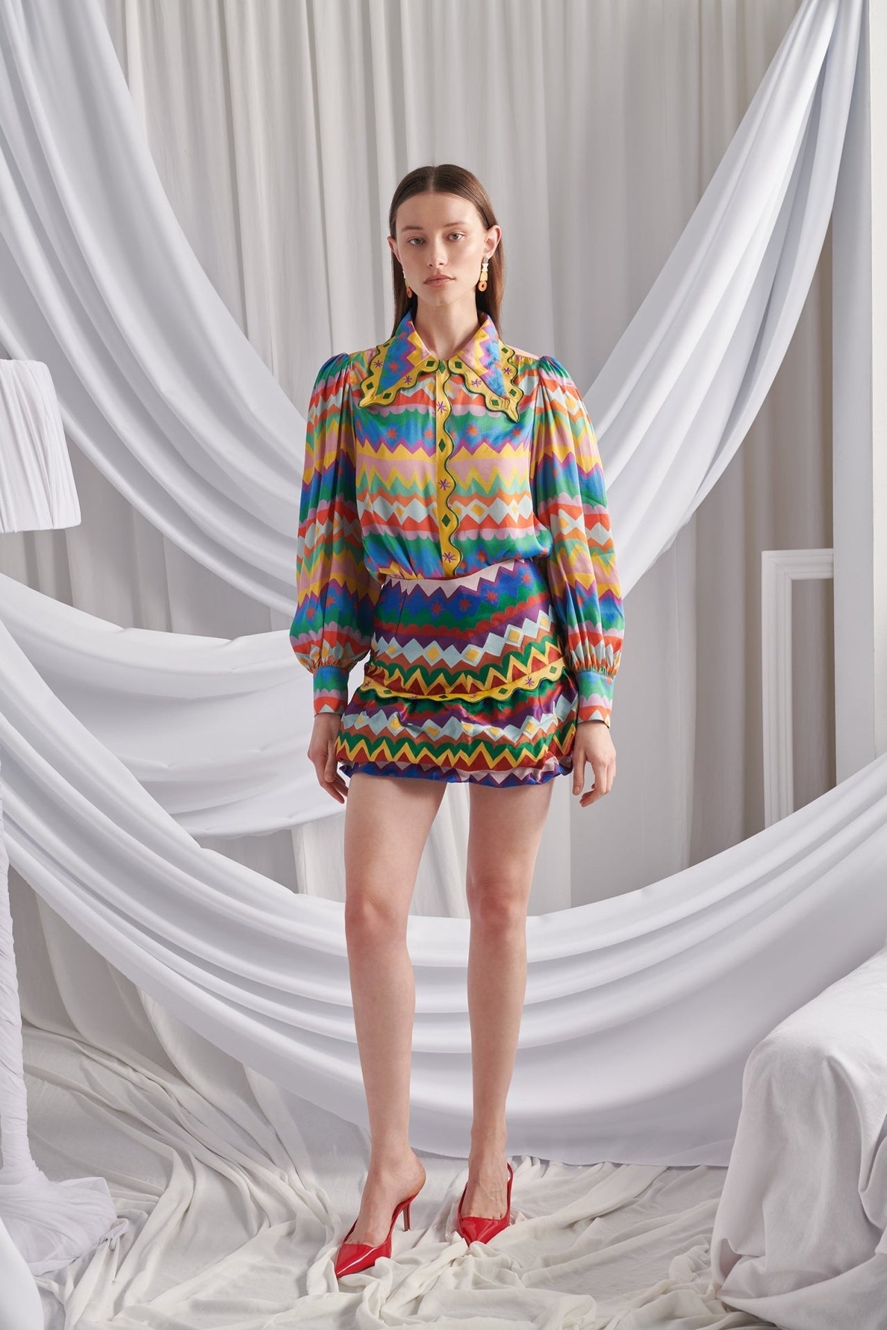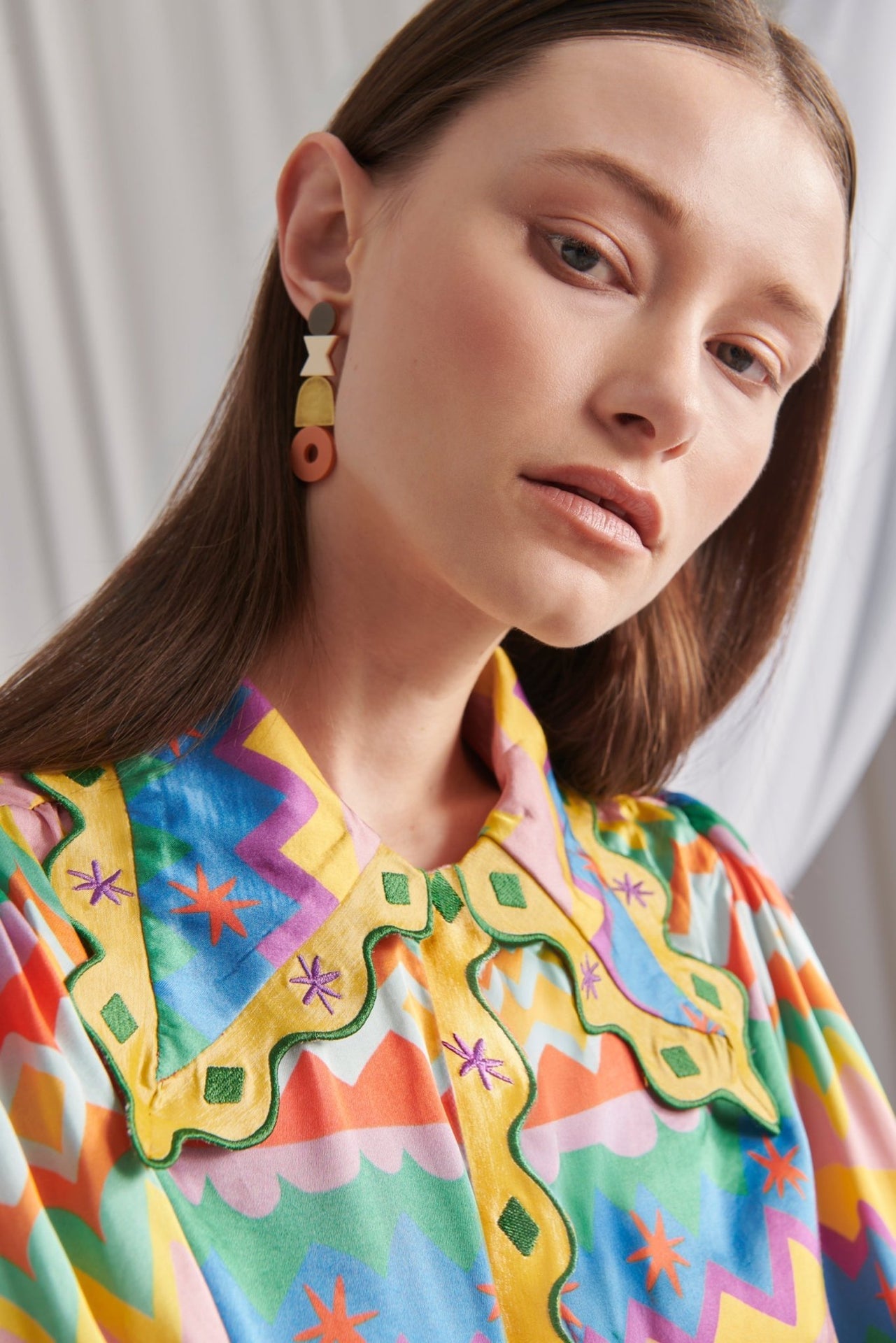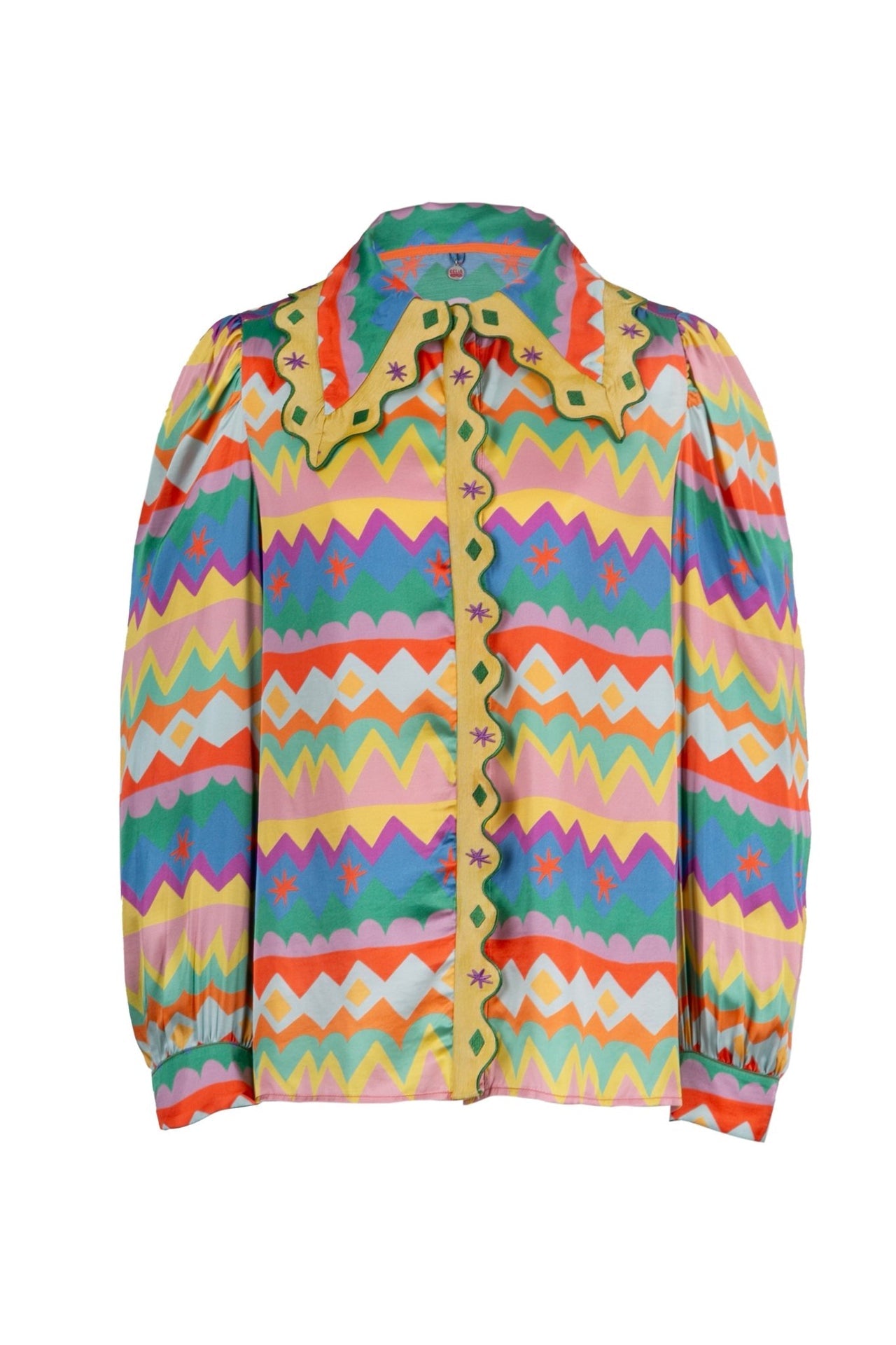 The Cariño Top is a colorful blouse with puff sleeves and a statement scalloped XL collar,front button down, finished with bold button detailing. Its retro-inspired multi-colored print makes it versatile for day-to-night looks.