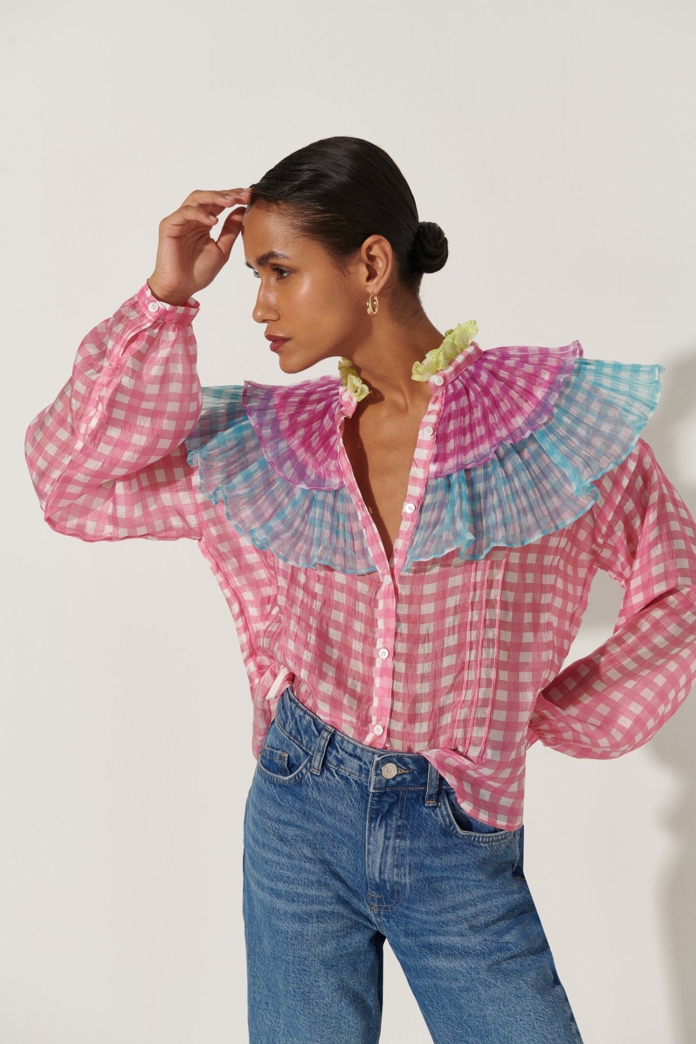 Luce un estilo desenfadado con la camisa Covadonga. Esta blusa rosa de cuadros vichy transparente presenta un cuello plisado extragrande en tonos degradados de fucsia, aguamarina y un toque de lima. Ligera, vaporosa y llena de personalidad, se abotona al frente para una silueta relajada pero atrevida.