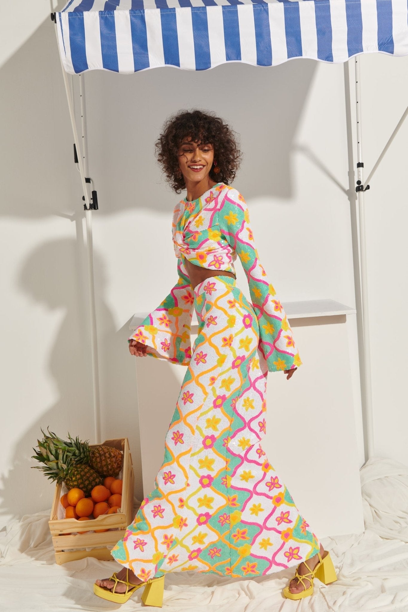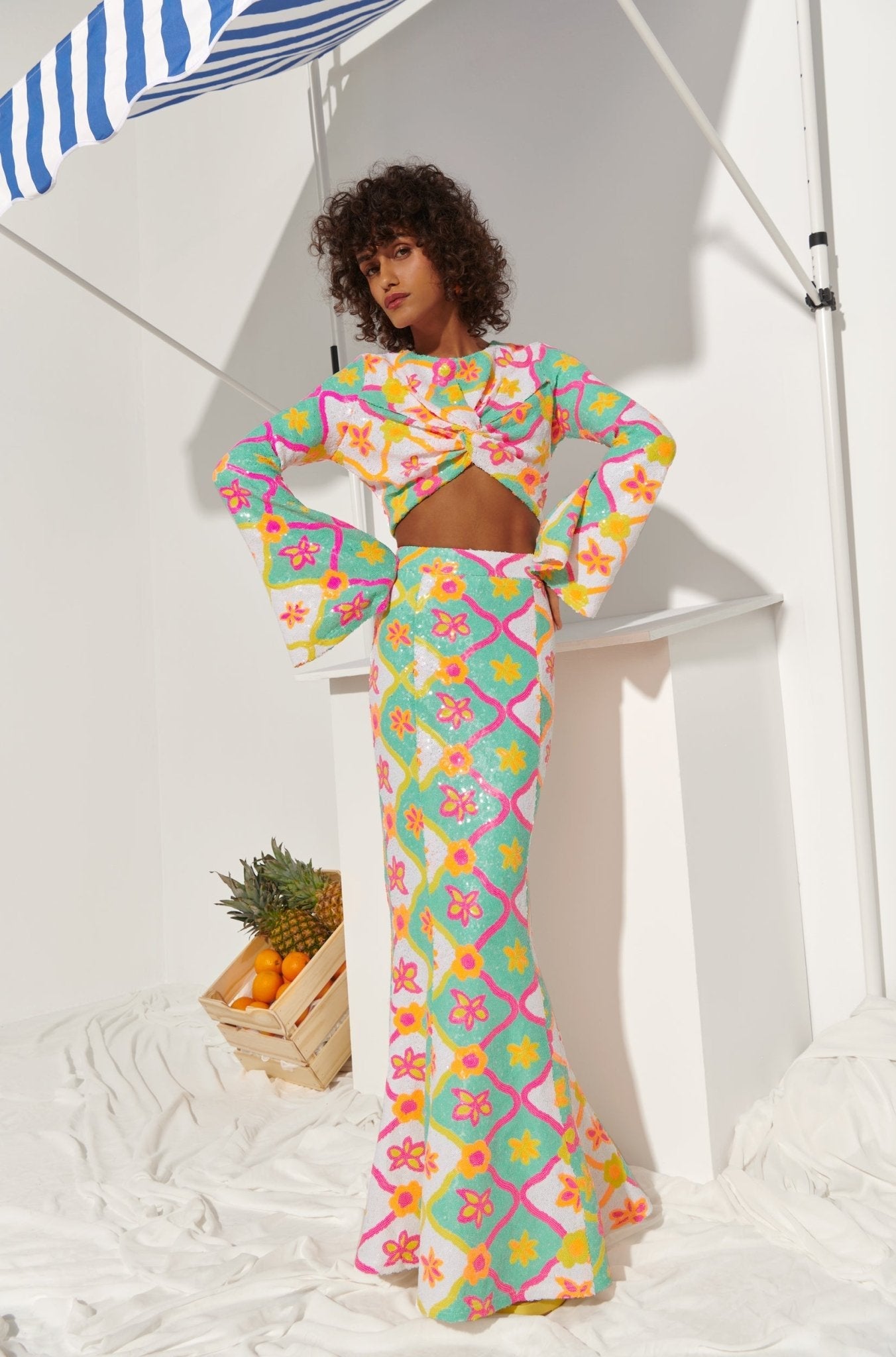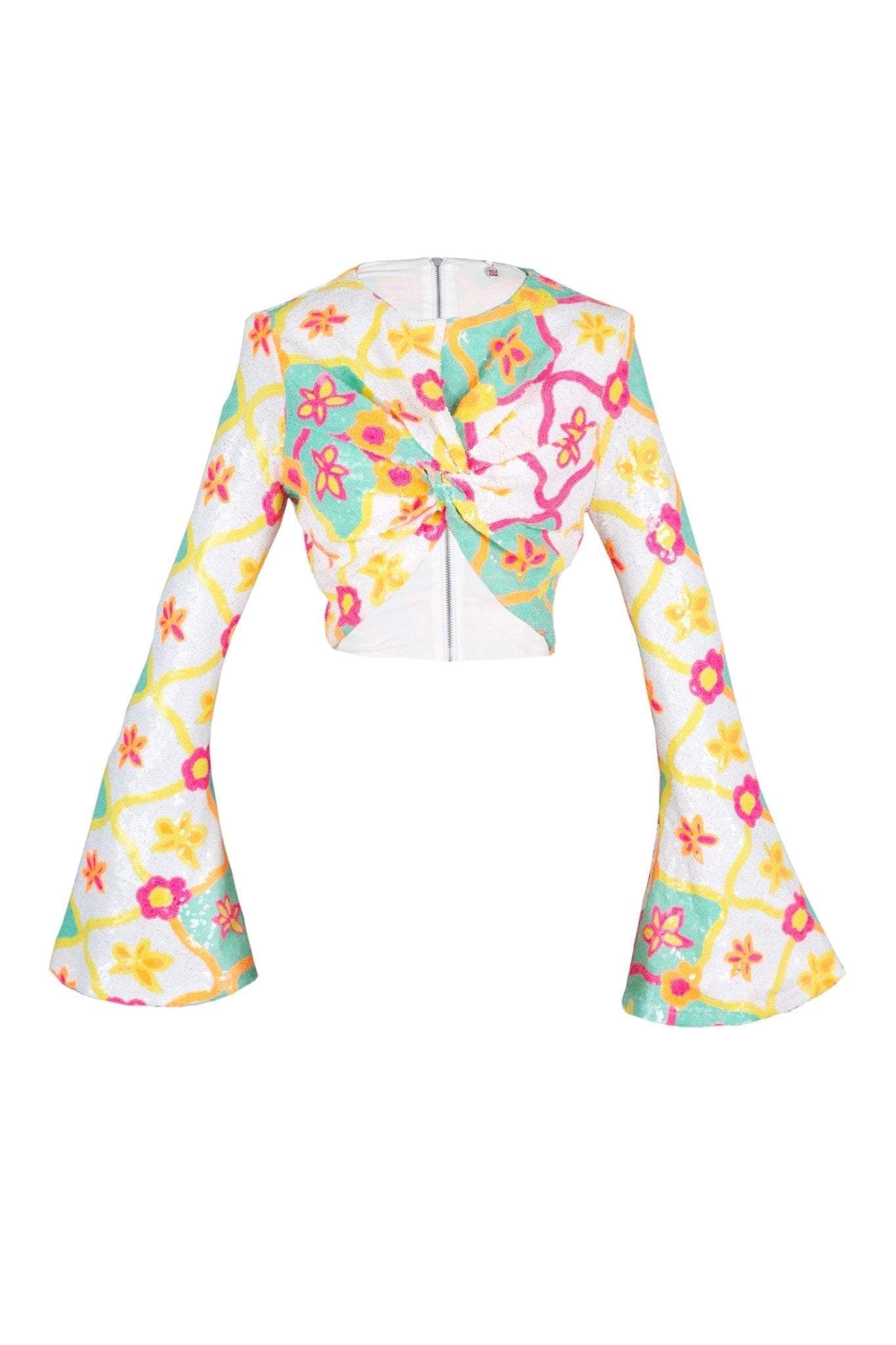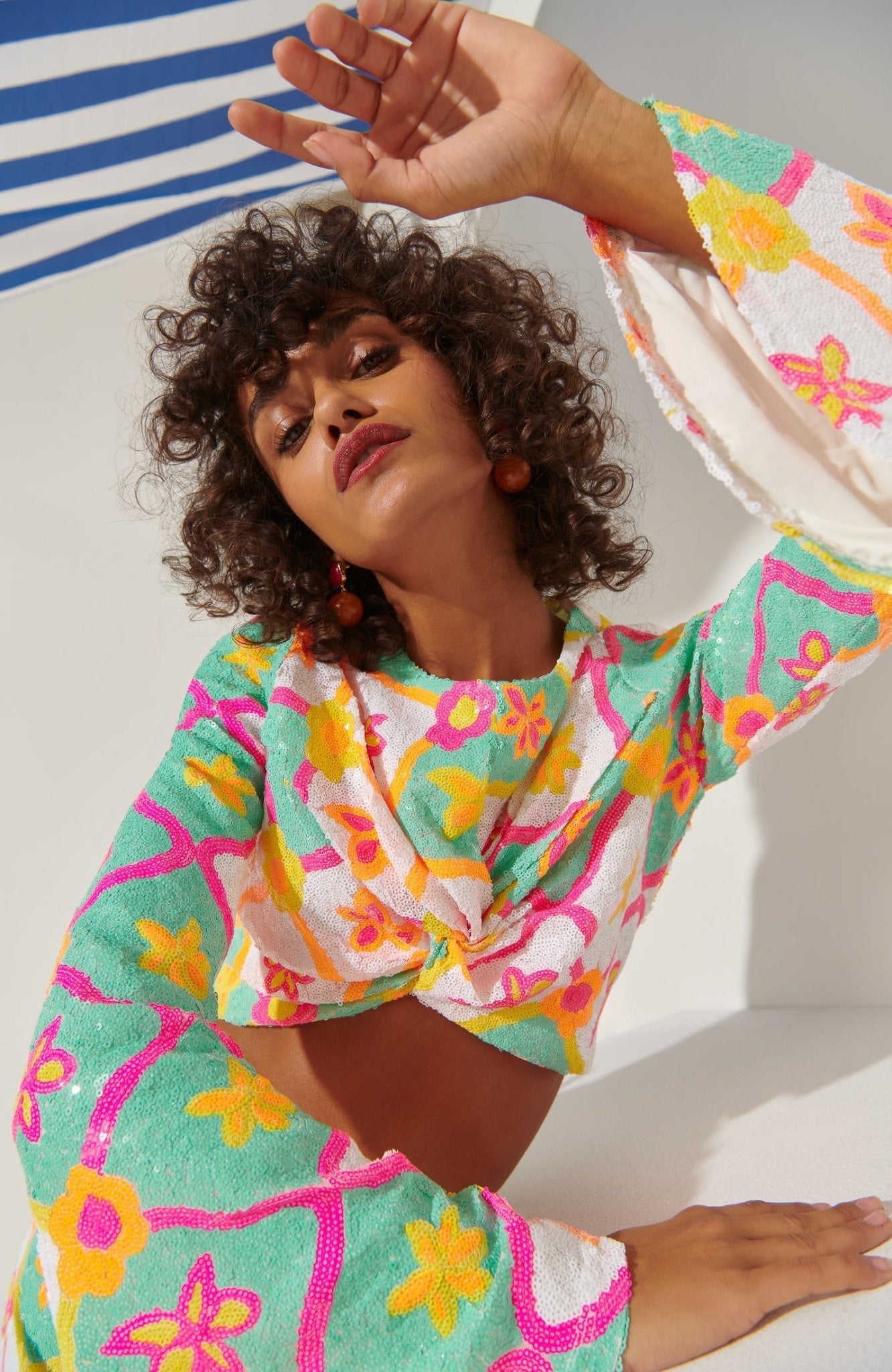 Deslumbra con el top Eugenia, un vibrante top corto confeccionado en un tejido retro de lentejuelas florales. Con un favorecedor detalle cruzado en el frente y mangas acampanadas, evoca la energía desenfadada de los años 60 con el toque justo de brillo.